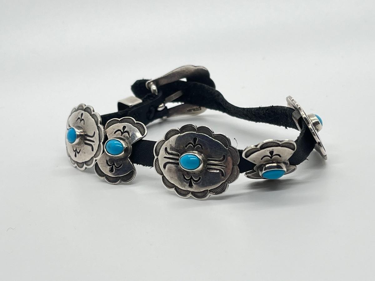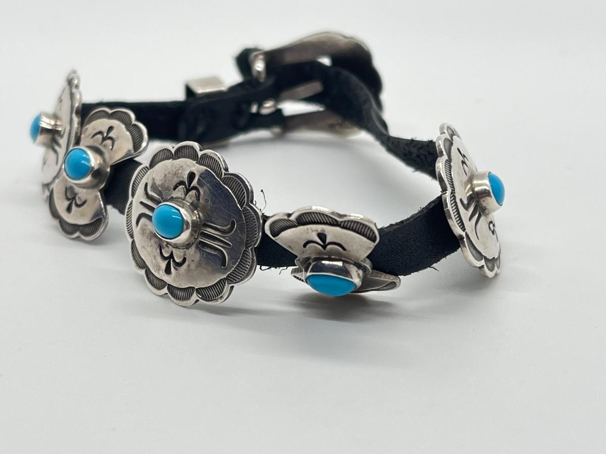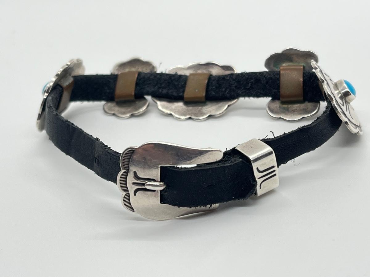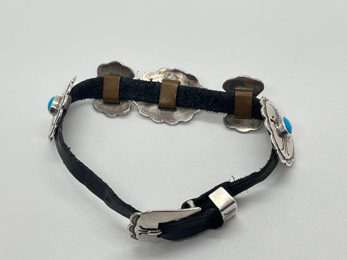LOT 3: Navajo Bracelet - Sliding Silver/Turquoise Discs on Leather Band - Sterling "Buckle" Clasp