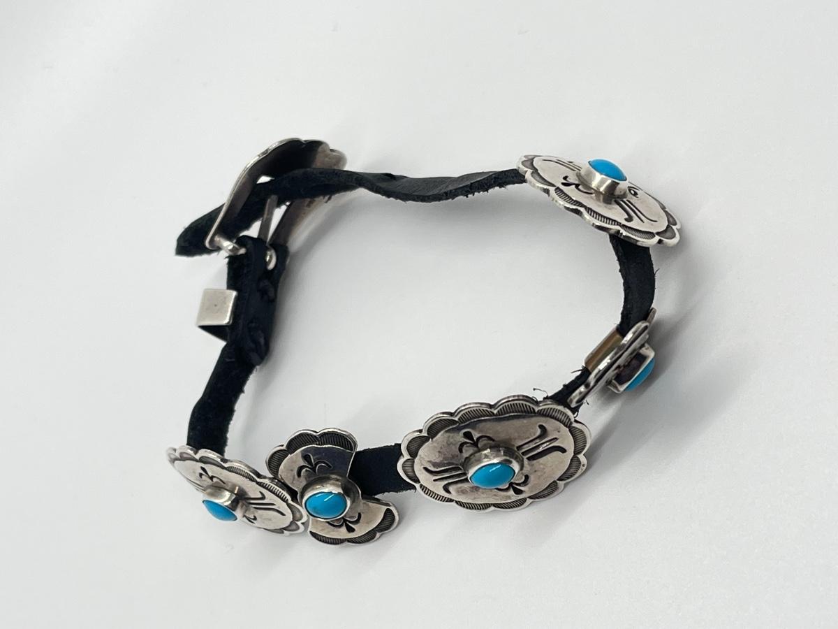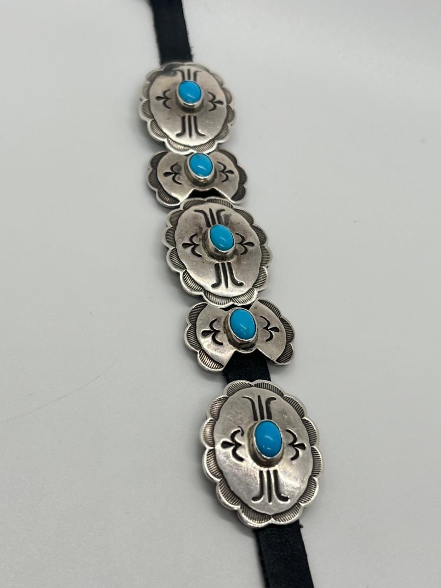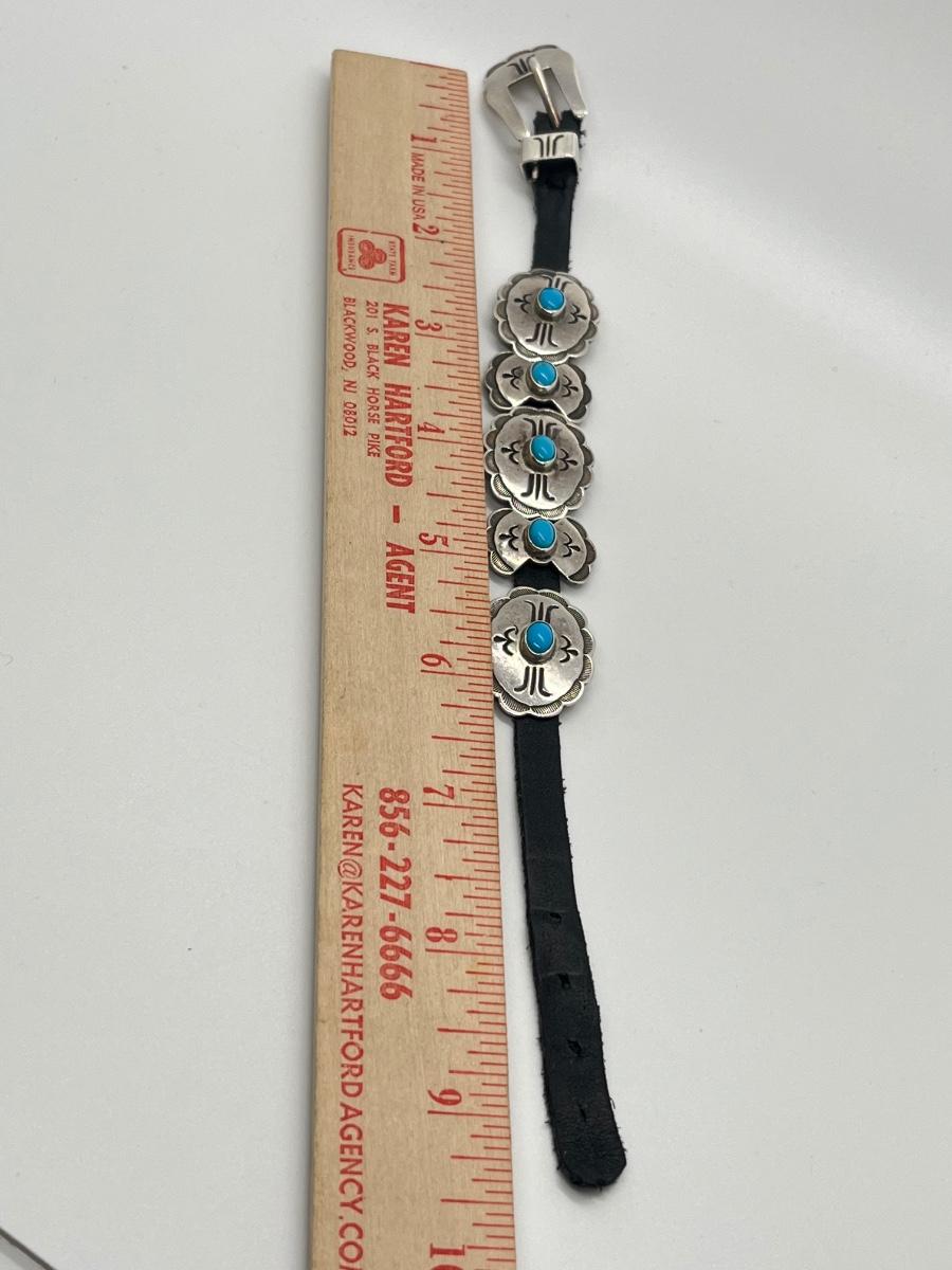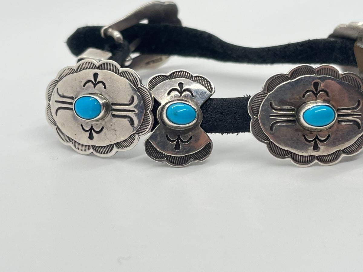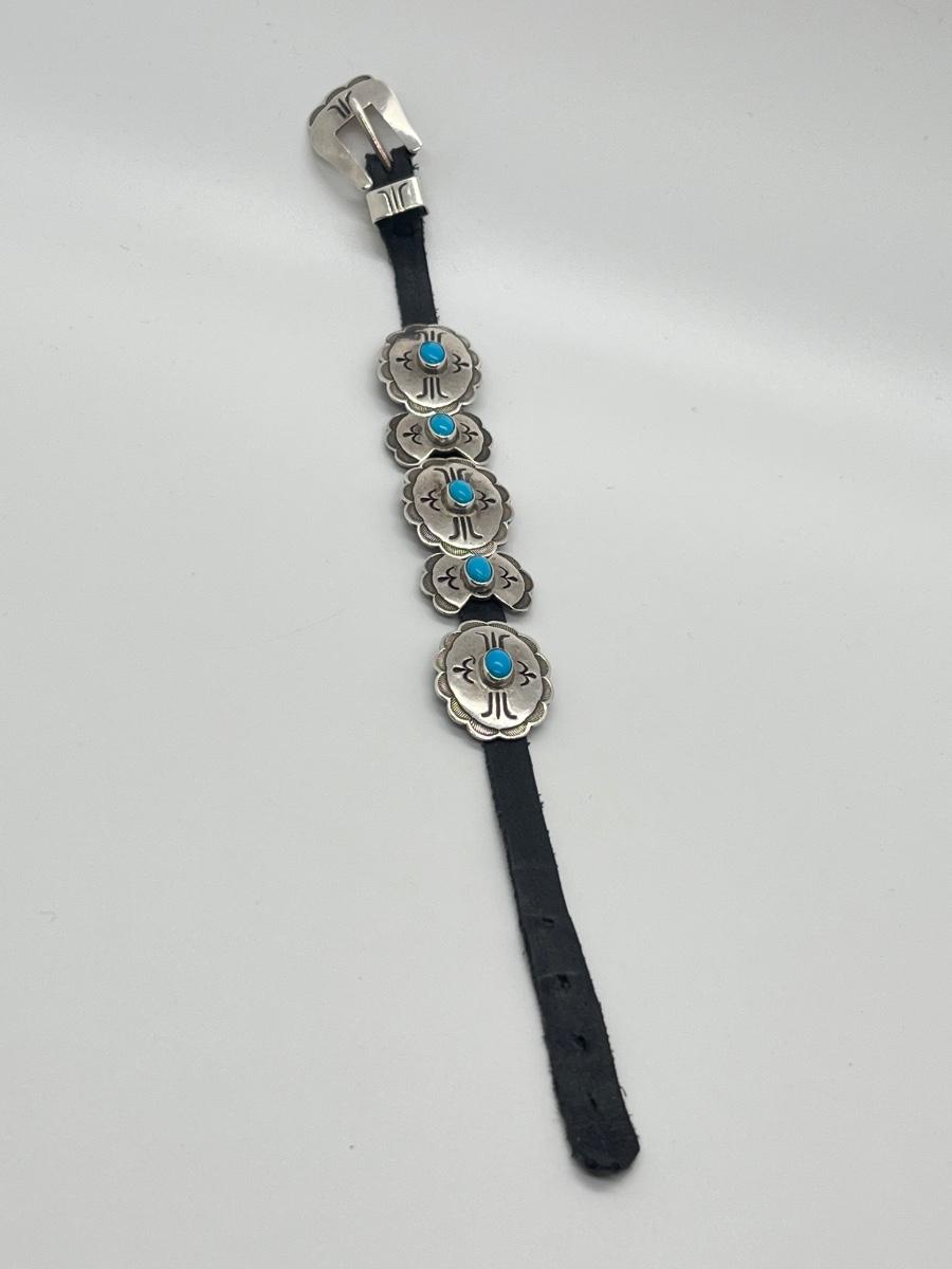 LOT 3: Navajo Bracelet - Sliding Silver/Turquoise Discs on Leather Band - Sterling "Buckle" Clasp