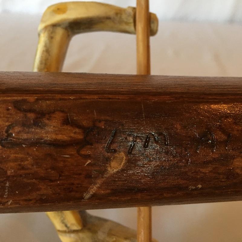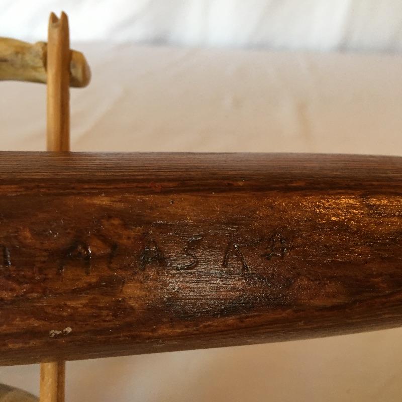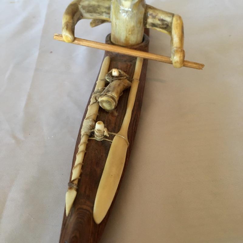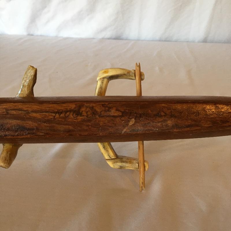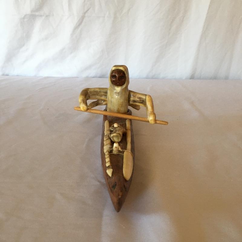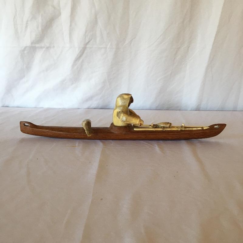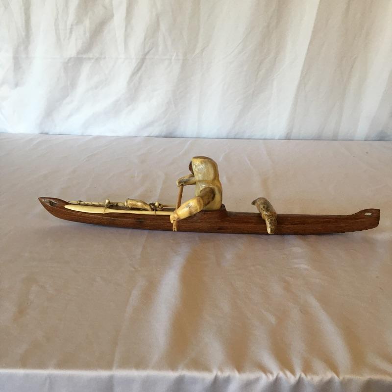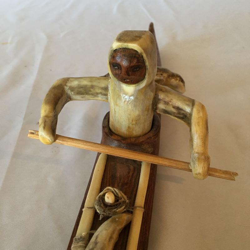 This Alaskan Art includes a wooden carved boat and rower. The person has hunting tools in an ivory color. The bottom is signed "Noglene, Elim Alaska". Piece measures 5.5” x 18.75” x 4.5”.