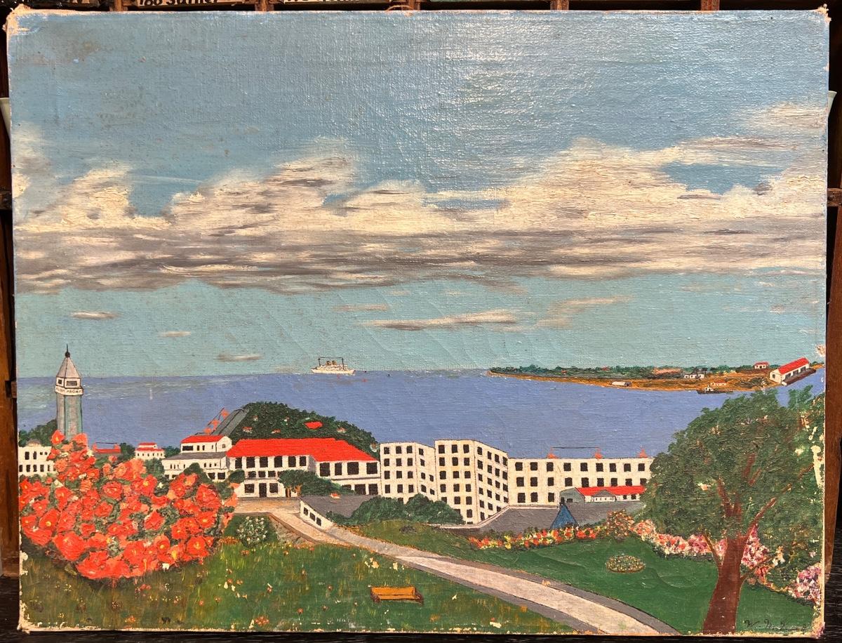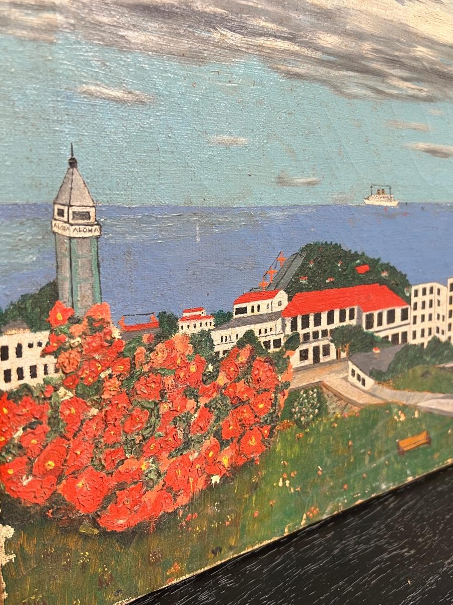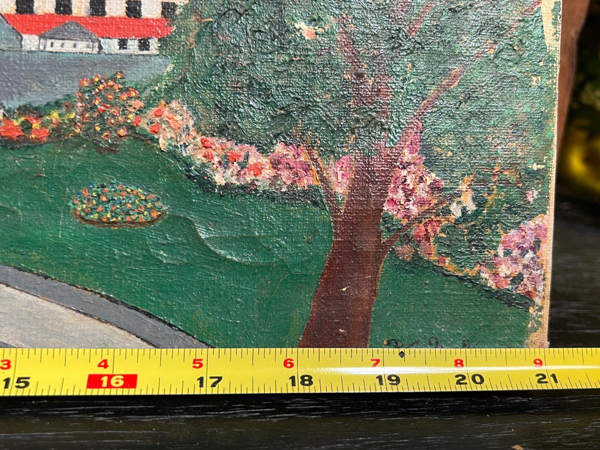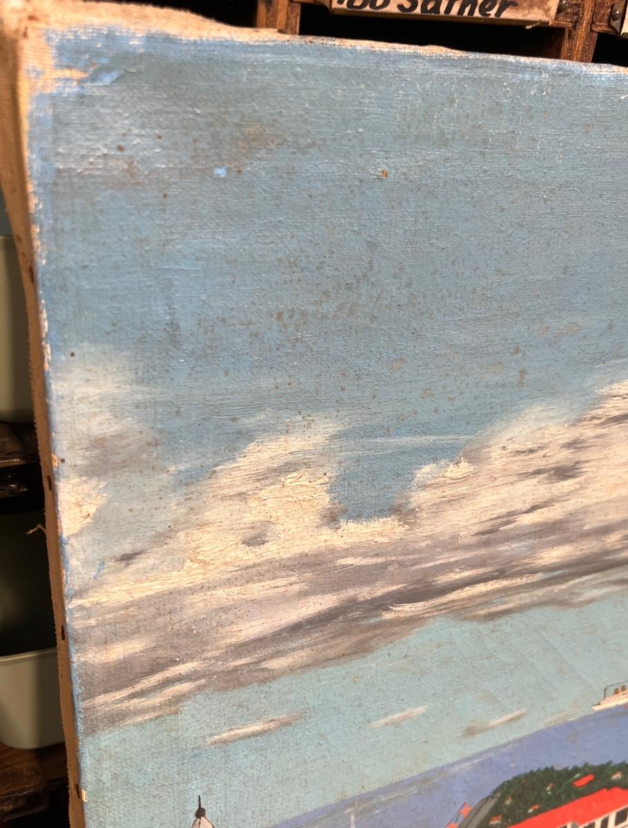Lot 3 - Antique Oil Painting on canvas featuring a Harbor Scene. This Antique Painting is being sold in AS IN Condition. It measures 21 inches by 16 inches. It does have crackle, edge wear, small hole. Please look closely at the photos as they are part of the description.