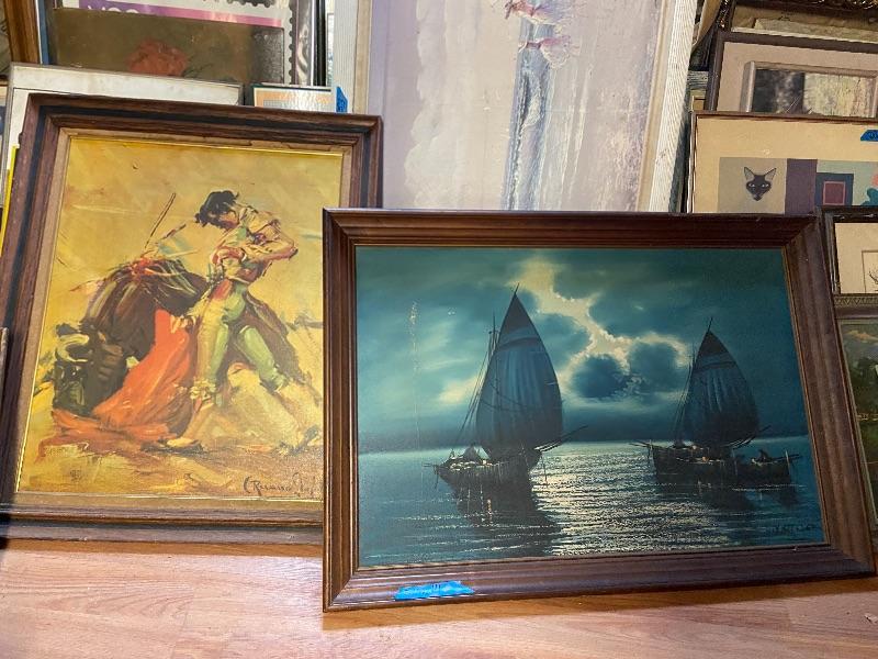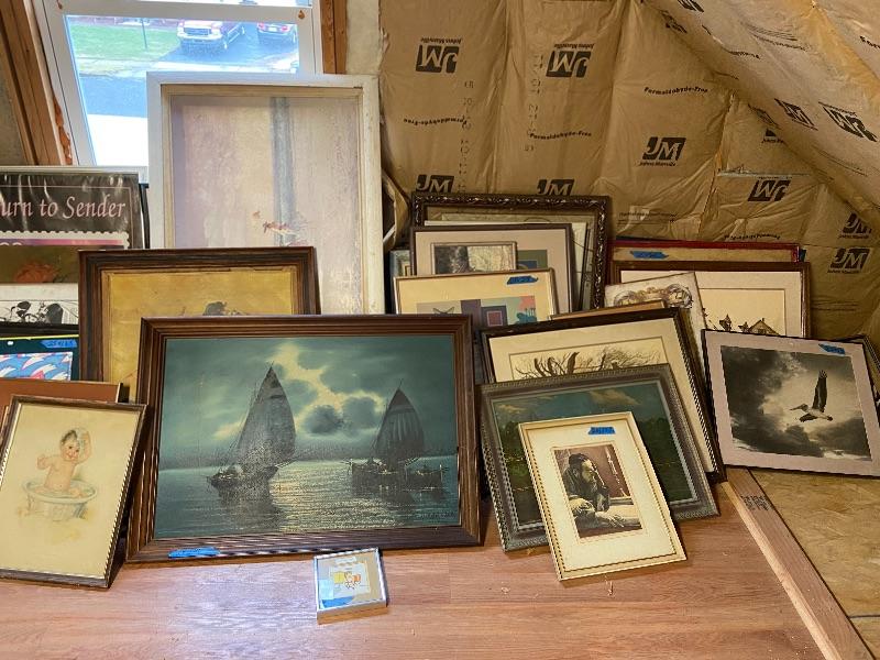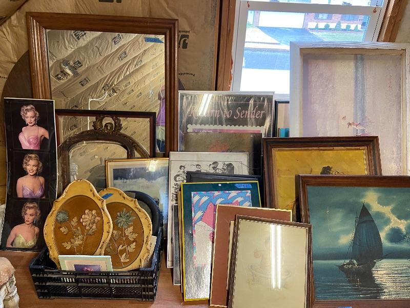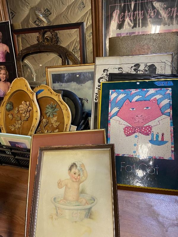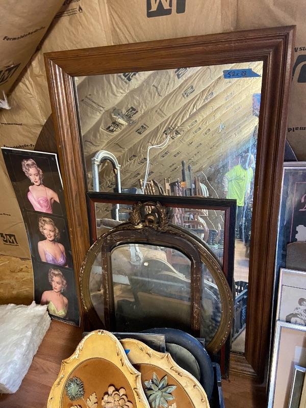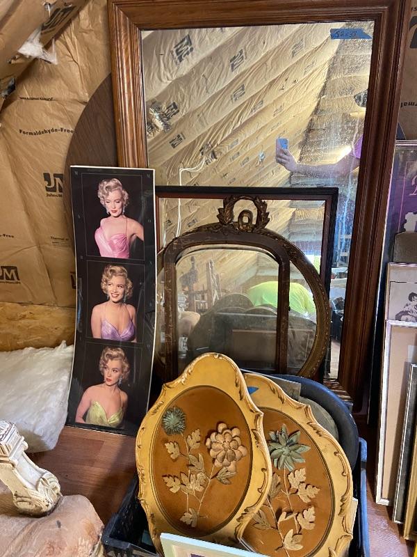 Vintage mirrors, from floor size to small wall mirrors, framed prints, signed original paintings, and vintage frames,