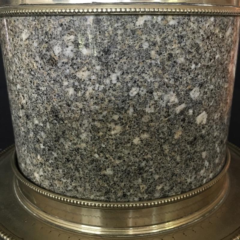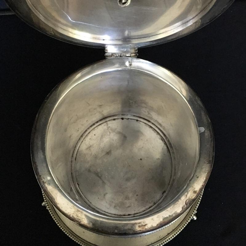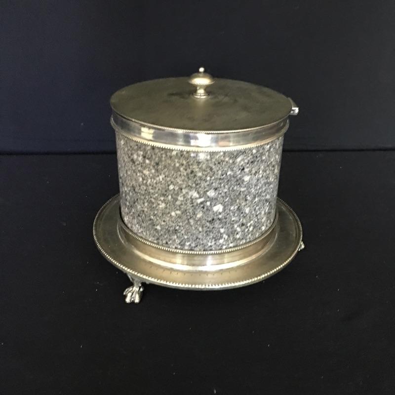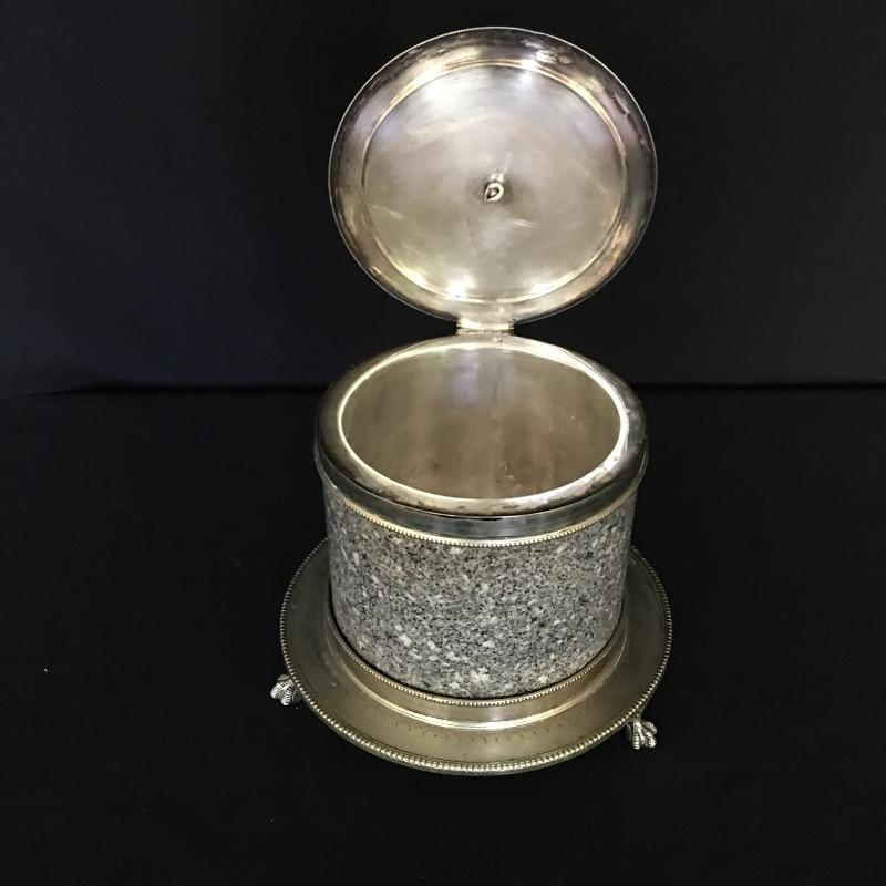 Claw foot Ice Bucket. Ice Bucket is heavy and looks to be marble and silver but can not confirm. Ice Bucket measures 8.25” D on bottom and 7.25” tall.