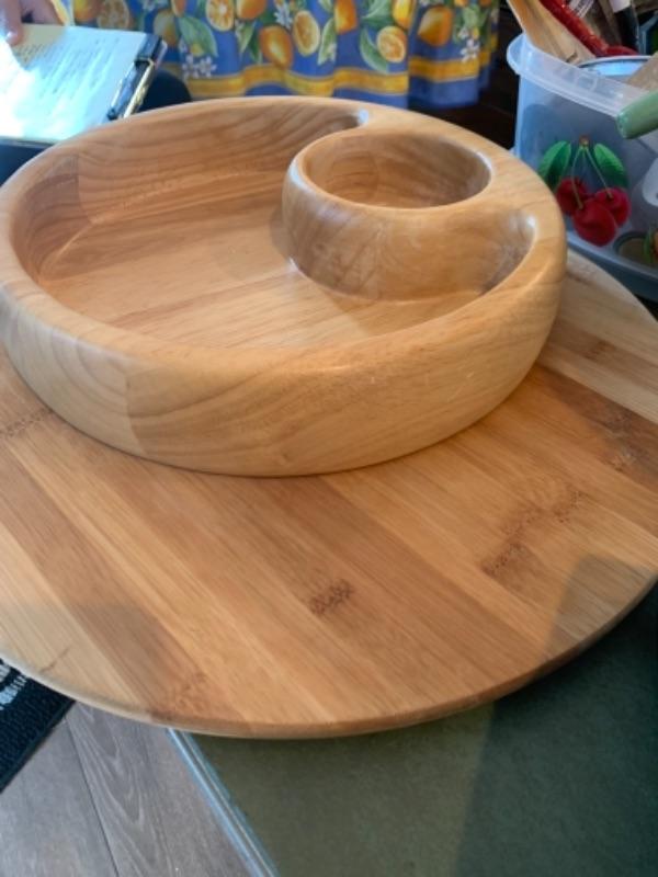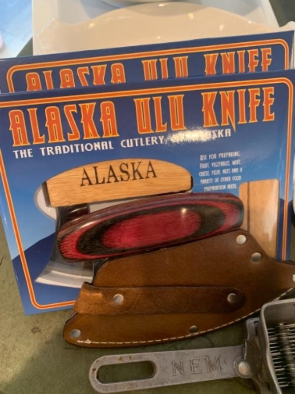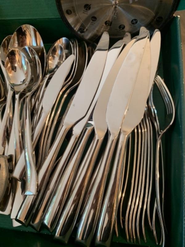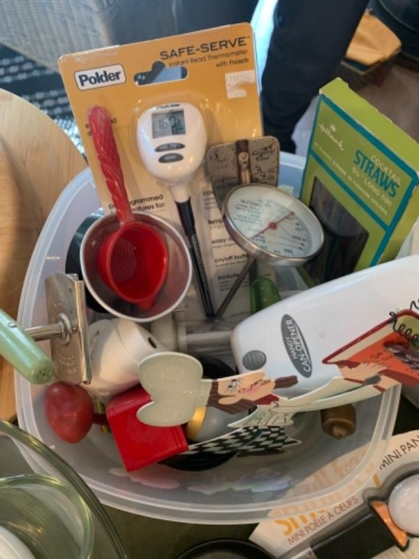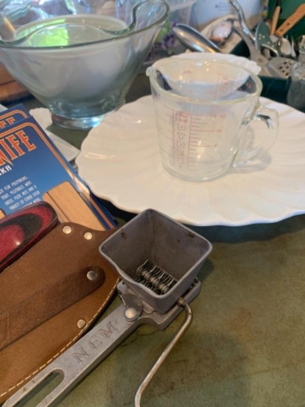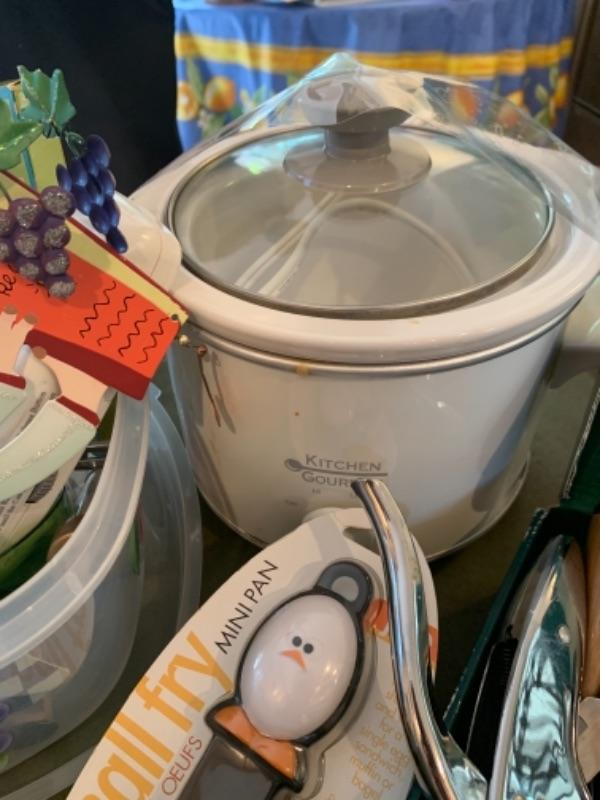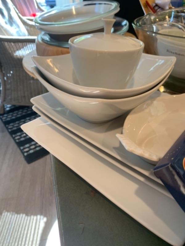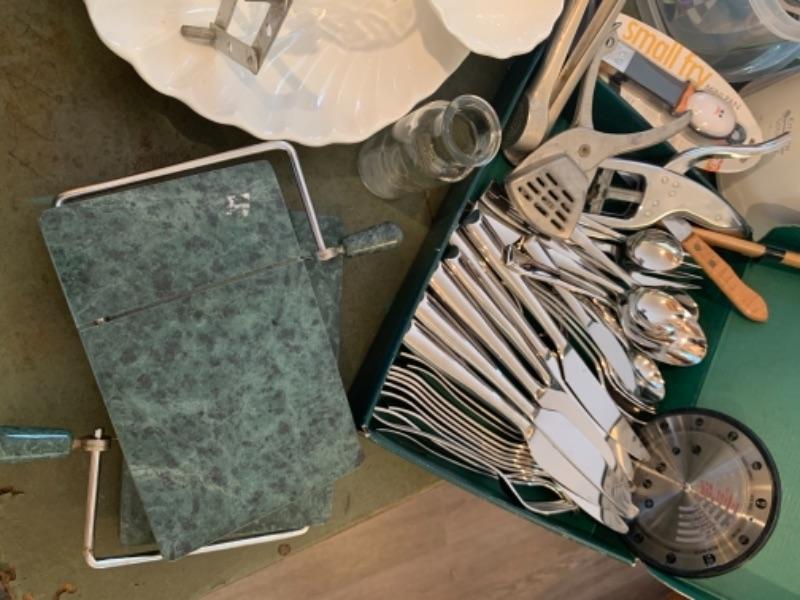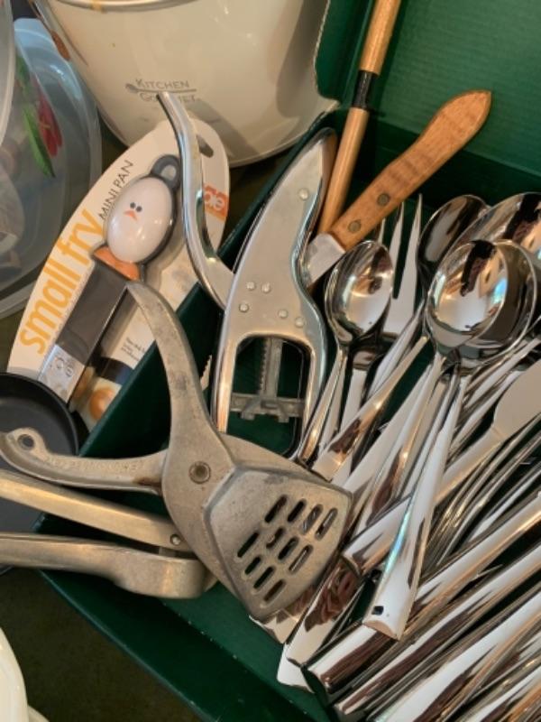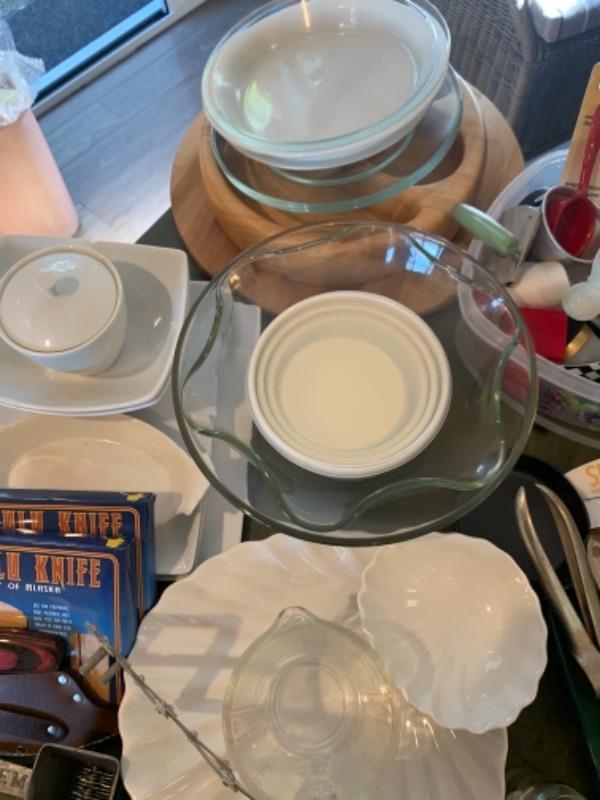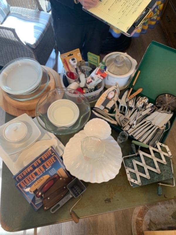 Lot 3. Assorted white kitchen dishware Alaska knives, assorted utensils, glass mixing bowls, wooden Lazy Susan, set of flatware (service for 8), crock pot, etc.--$75