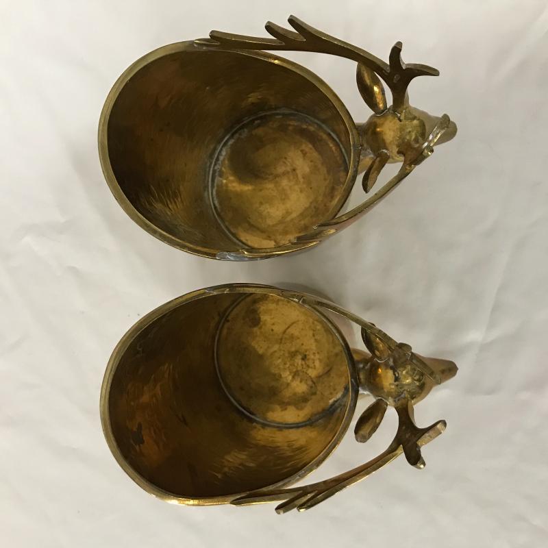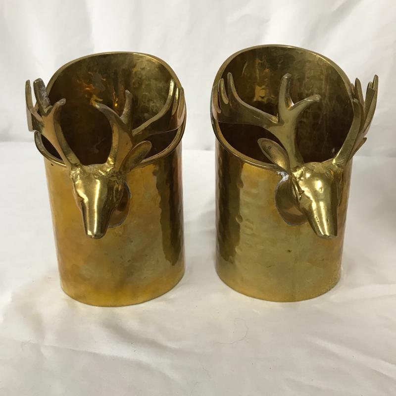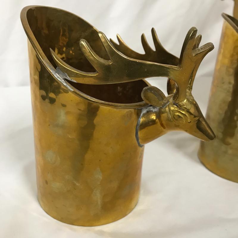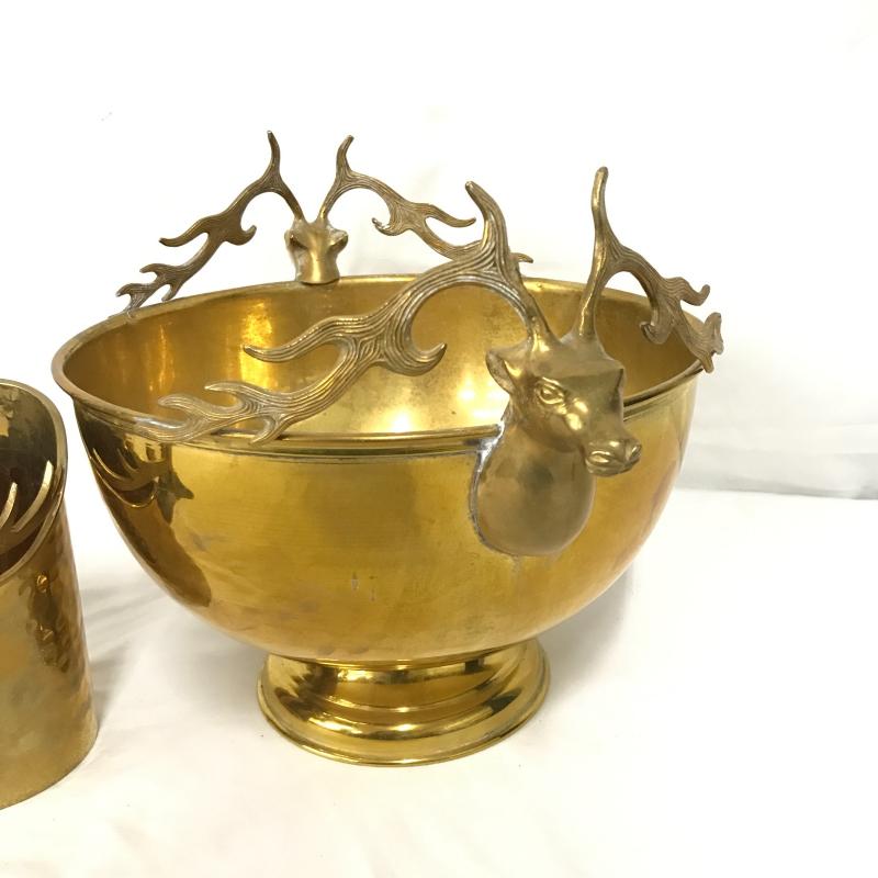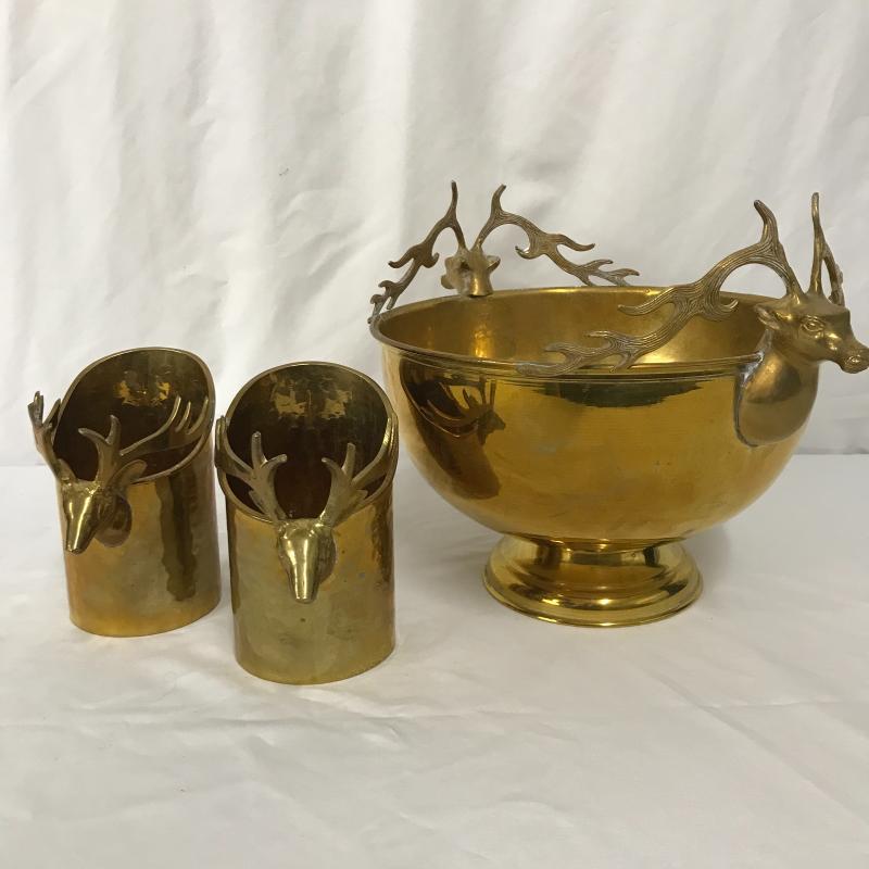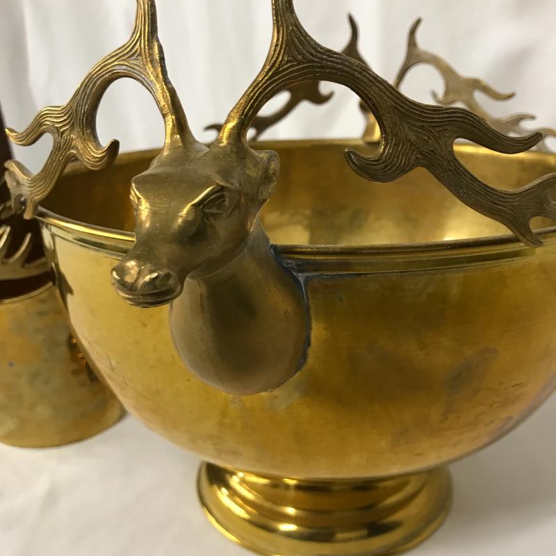 Three brass serving pieces with deer heads. Bowl is 10.5”d x 7”h. Matching wine holders are 6”h. Local pick up only in Maggie Valley.