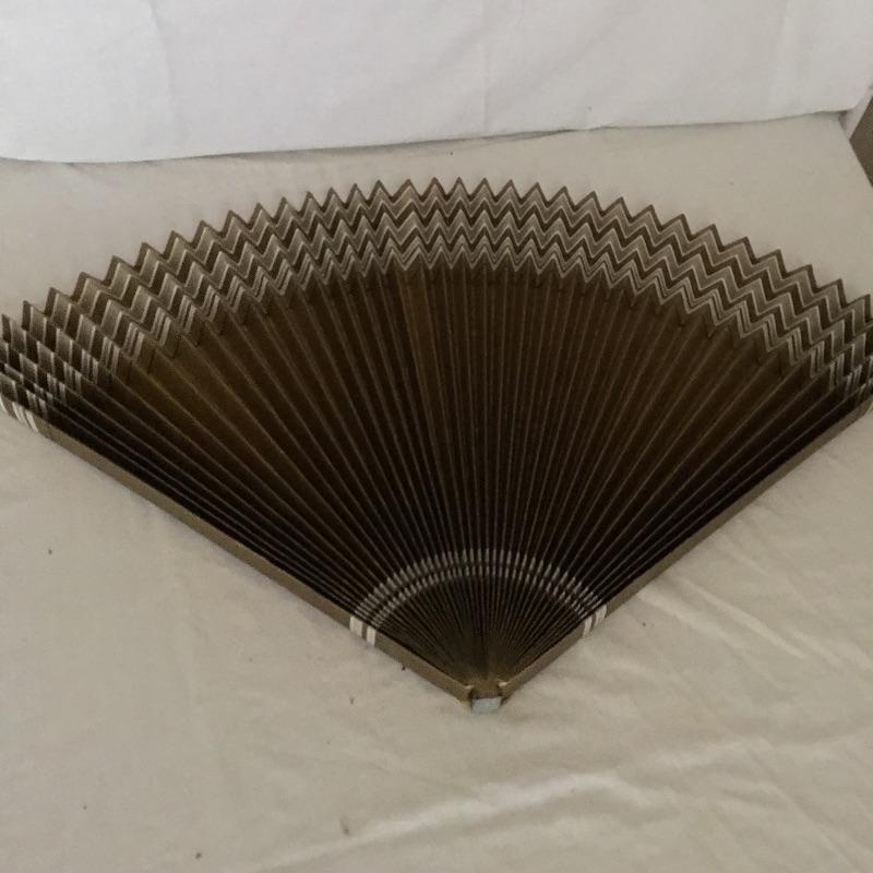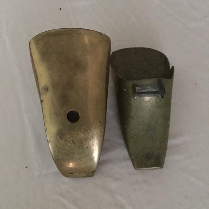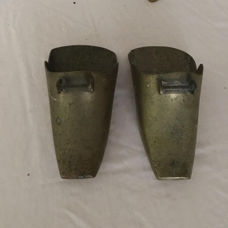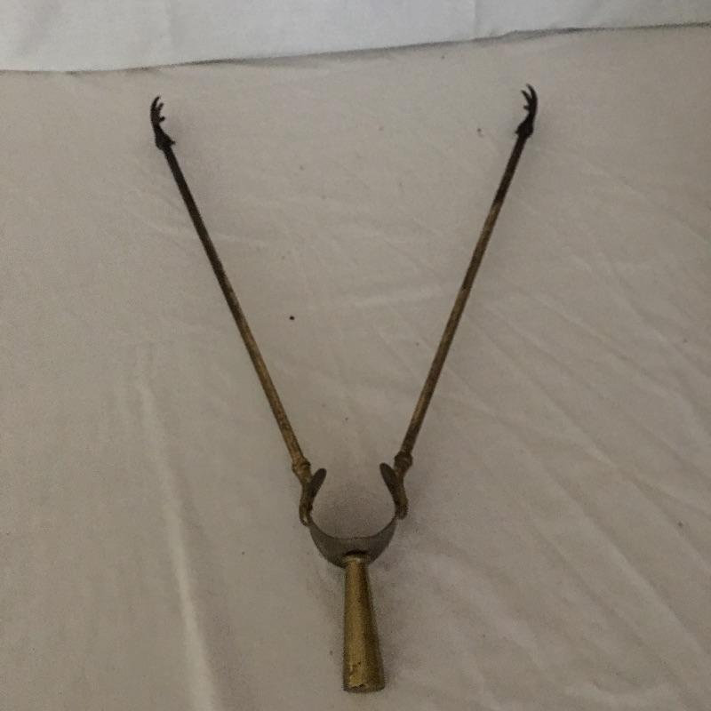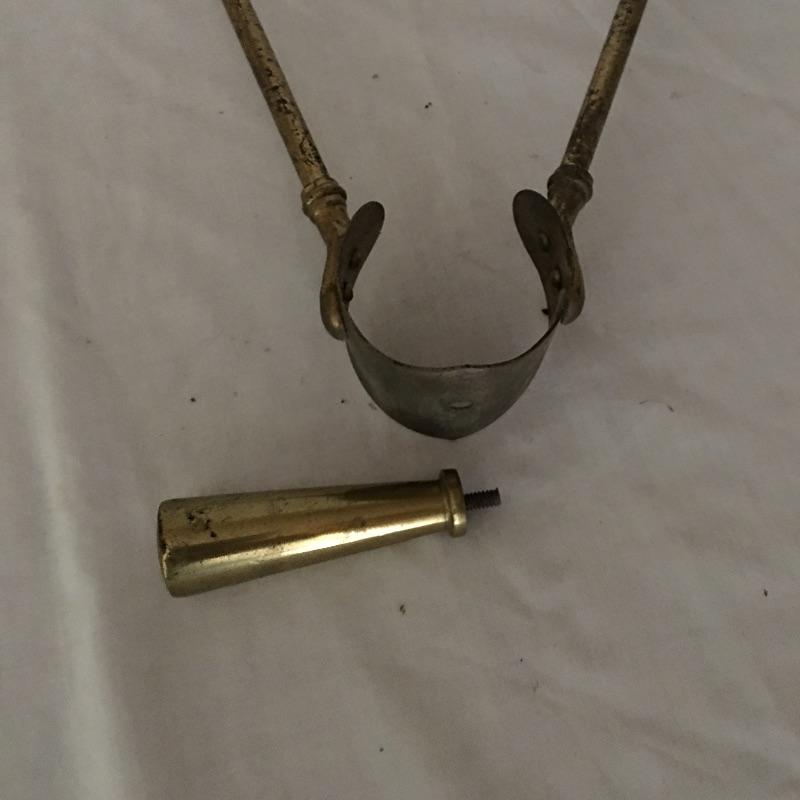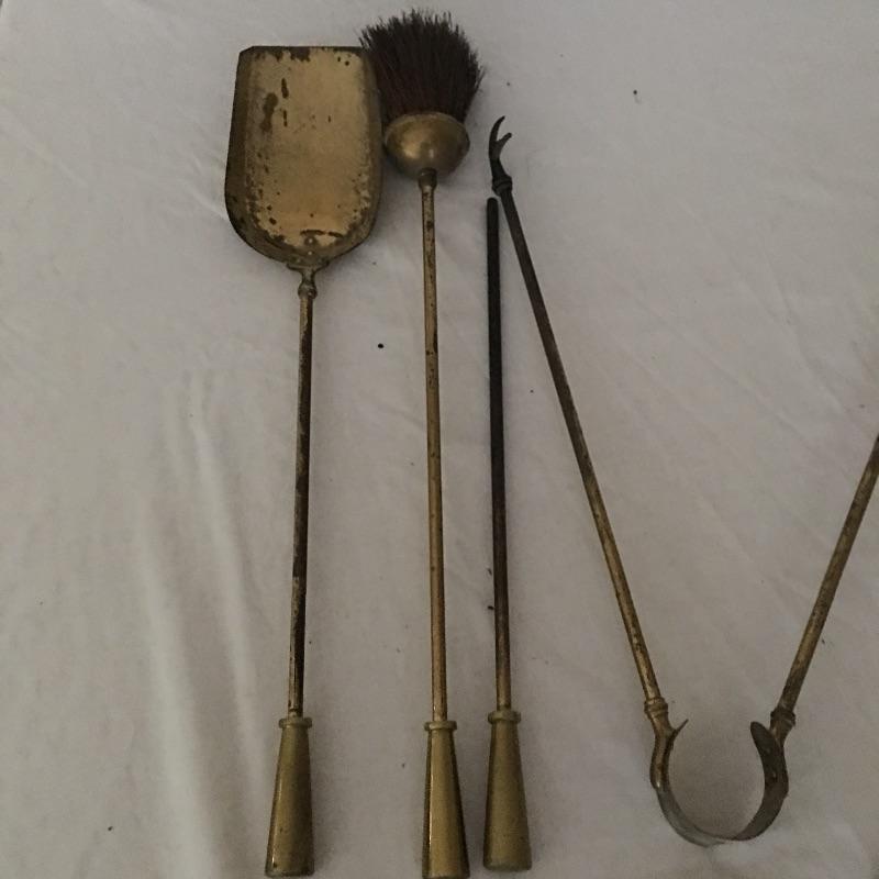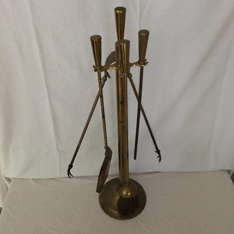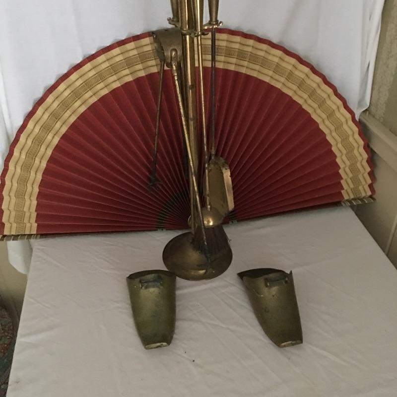 Classic brass fireplace set with pair of brass decorative shoes and reversible fan. The quirky brass metal decorative shoes make for an interesting decorative collectible placed on a fireplace hearth, shelf or table. The fireplace set has one handle that is not attached but is just missing a nut and looks like an easy fix, see pictures. Stand measures 27.5” tall with a 7”D base.