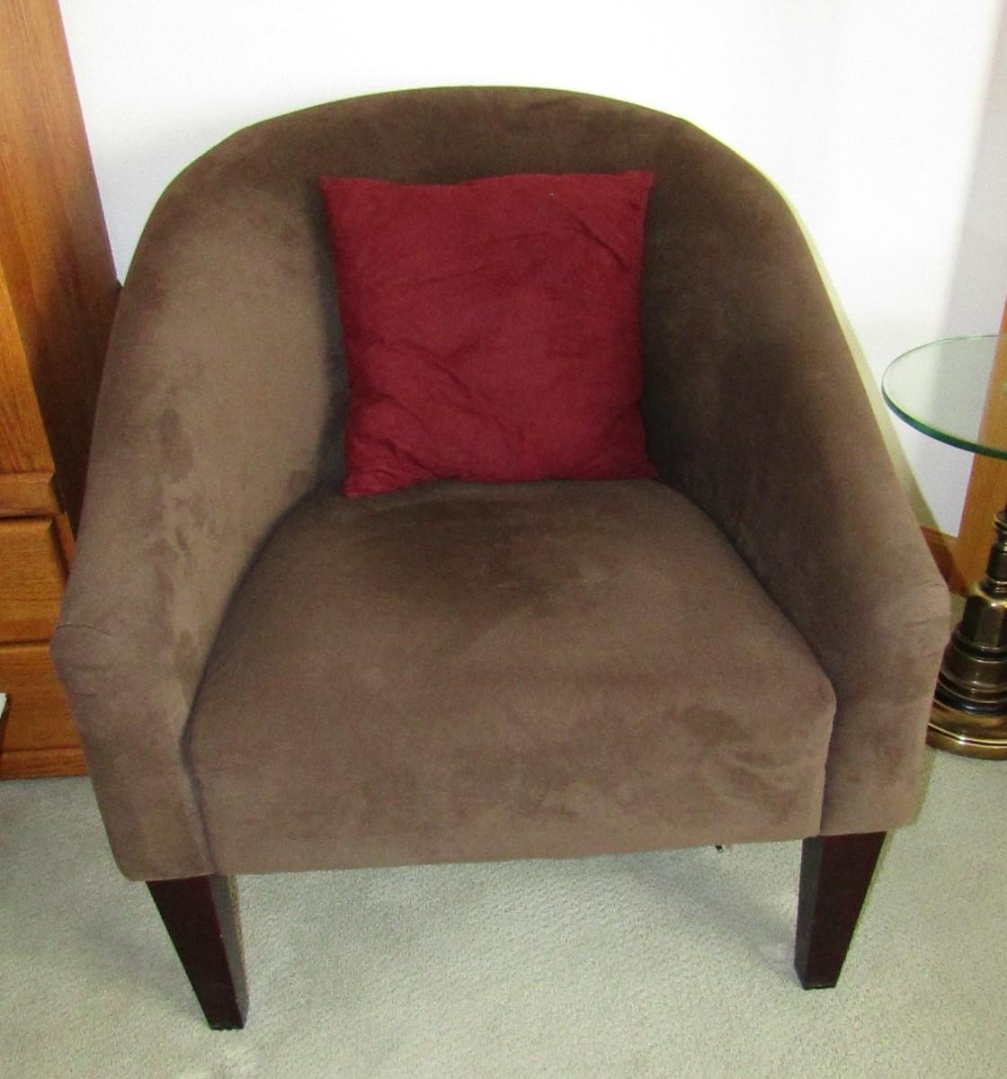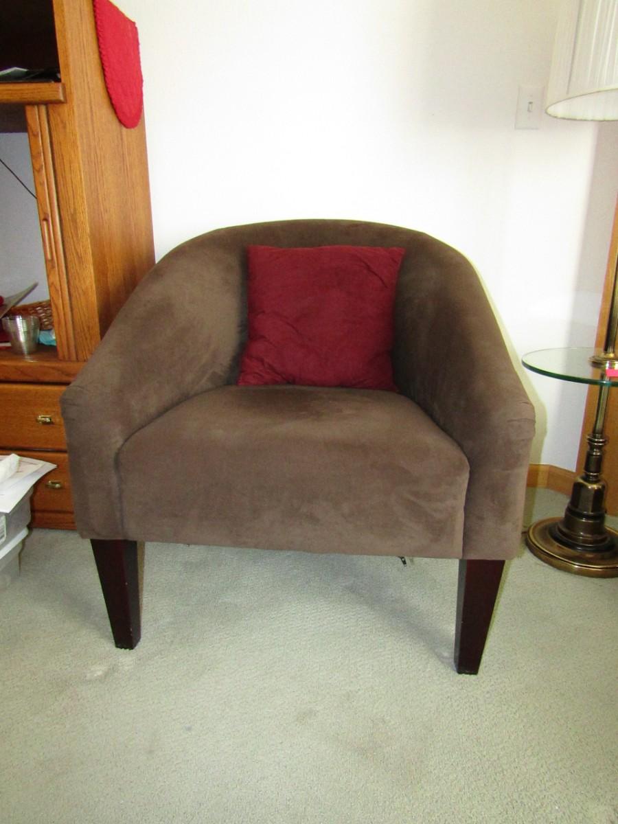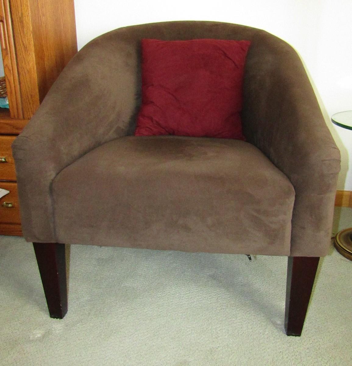 BROWN MICROFIBER CHAIR IN VERY GOOD SHAPE, THERE ARE SOME SCRATCHES ON THE LEGS. THIS CHAIR HAS A ZIPPERED POUCH ON THE BOTTOM I ASSUME TO ADD MORE CUSHION TO THE SEAT IF DESIRED?