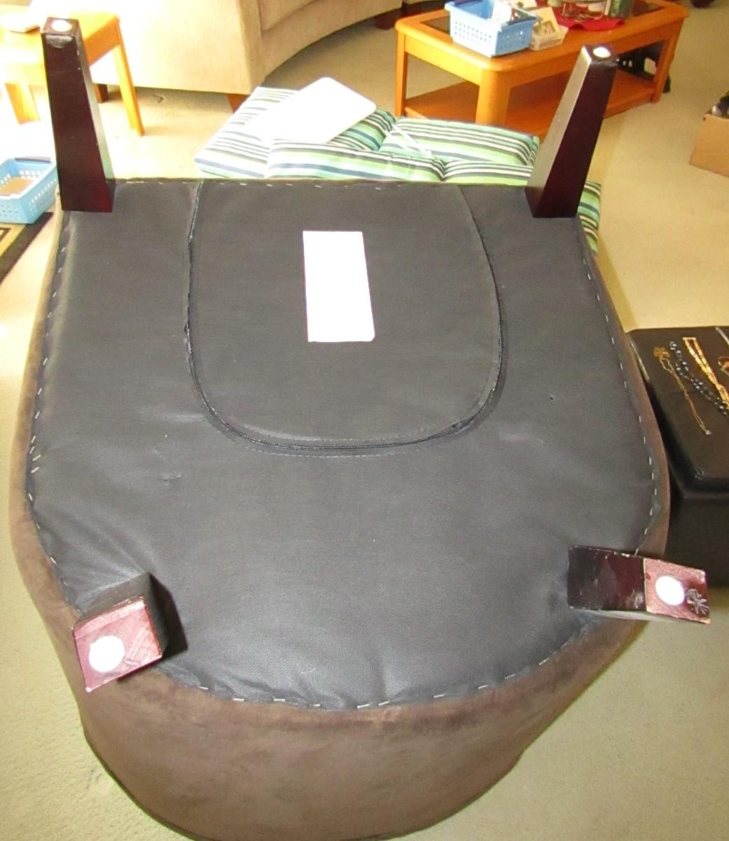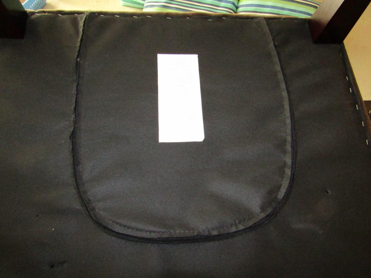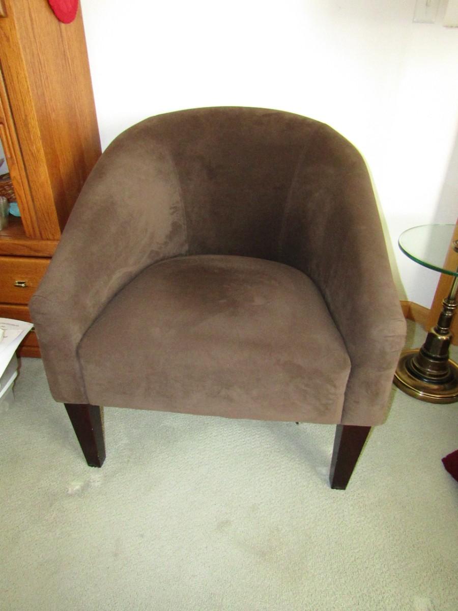 BROWN MICROFIBER CHAIR IN VERY GOOD SHAPE, THERE ARE SOME SCRATCHES ON THE LEGS. THIS CHAIR HAS A ZIPPERED POUCH ON THE BOTTOM I ASSUME TO ADD MORE CUSHION TO THE SEAT IF DESIRED?