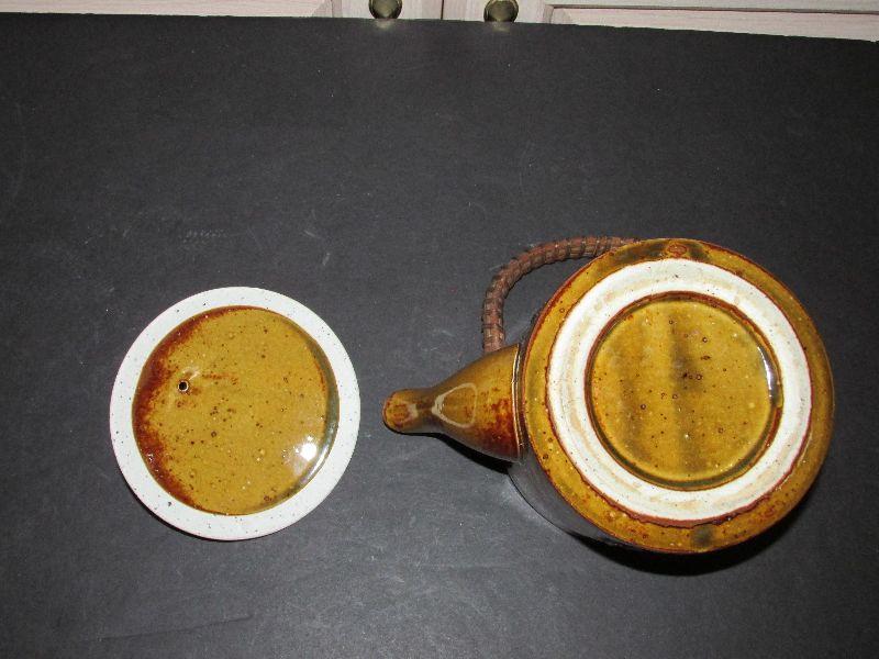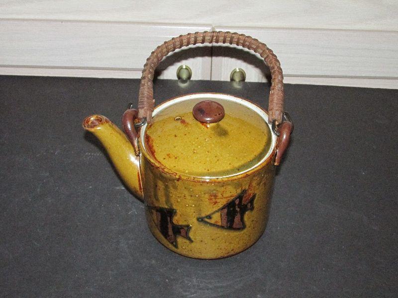 Brown glazed ceramic teapot with fish design and wood detachable handle. No chips or cracks.