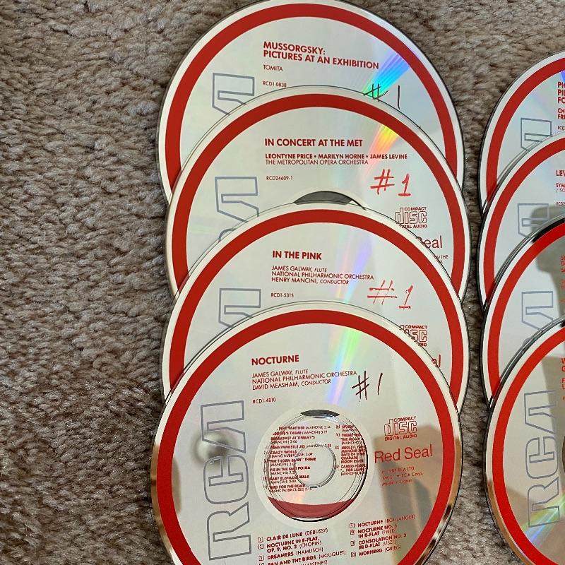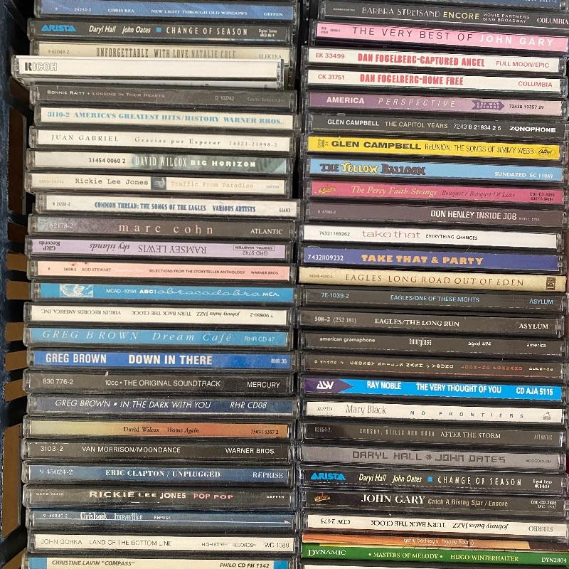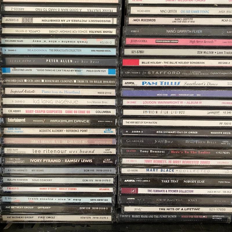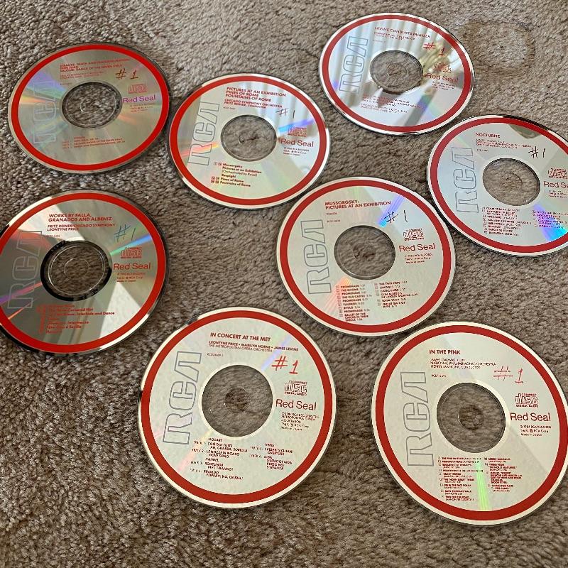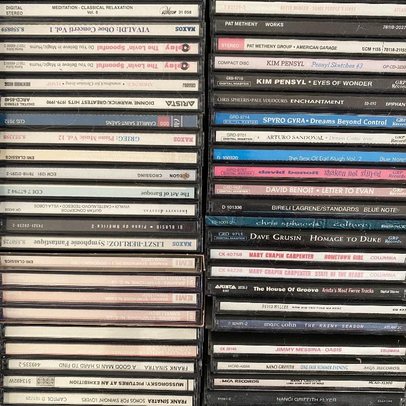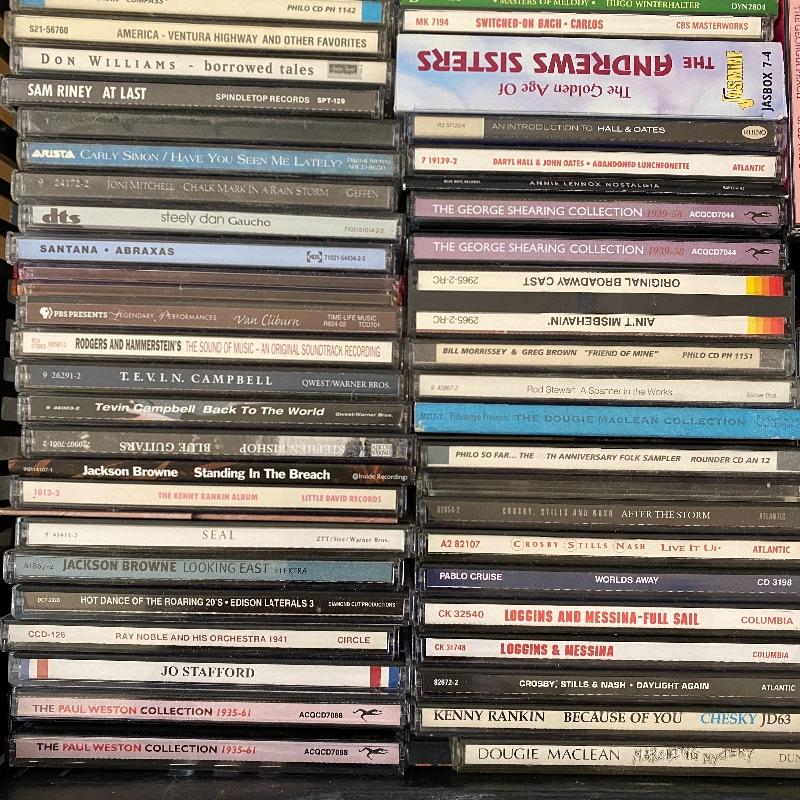 Keep yourself entertained with this large collection of CDs. Lot includes over two hundred CDs in a variety of genres including Jackson Browne, Ella Fitzgerald, Marky Mark and the Funky Bunch, Frank Sinatra, Rodgers & Hammerstein, Tony Bennett and many more. Did not verify every case matched with a corresponding CD. Includes a handful of Red Seal CDs as well as Blue CDs from RCA. They don’t have cases and have #1 written on them. Appear to be in great condition.