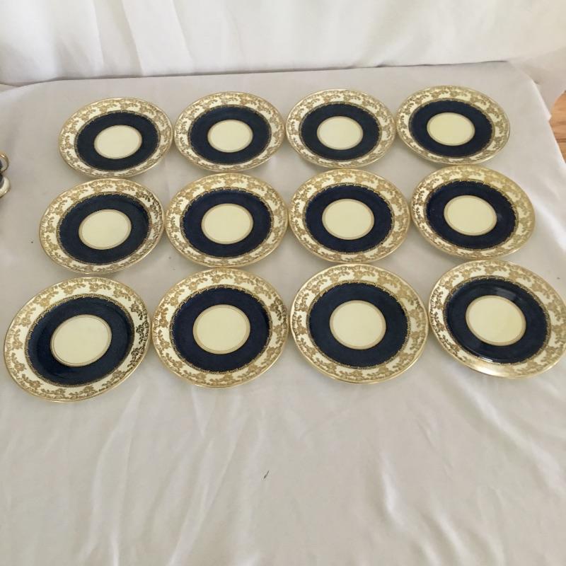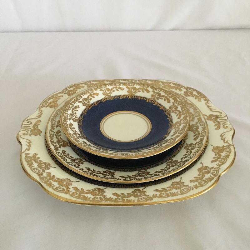 English bone China set by Collingwoods. Three piece ten person set with bowl and pitcher. Get ready for tea time with this gold adorned set of bone China. Lot also includes two uniquely shaped dinner plates measuring 8.5” x 9”.
