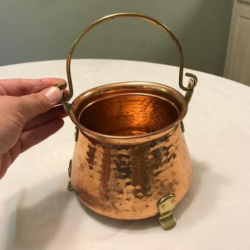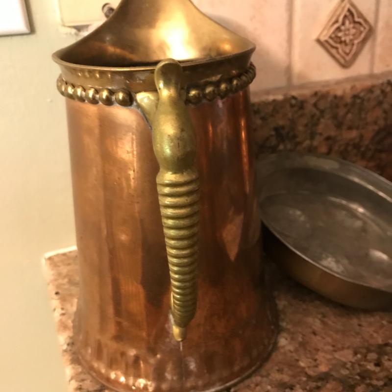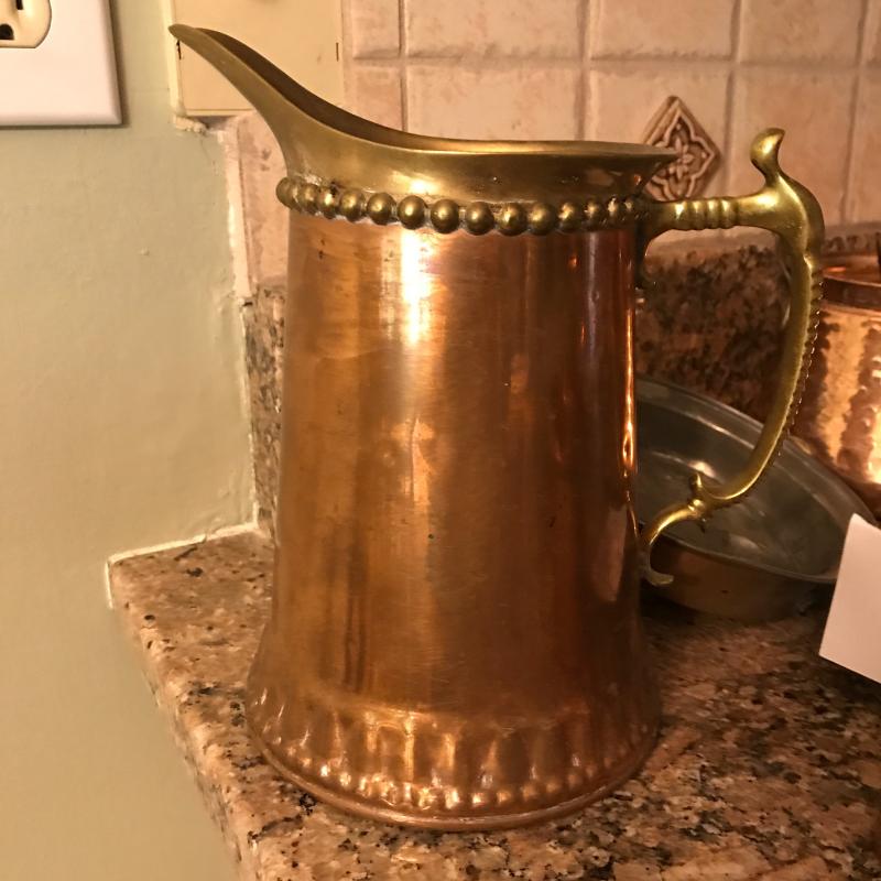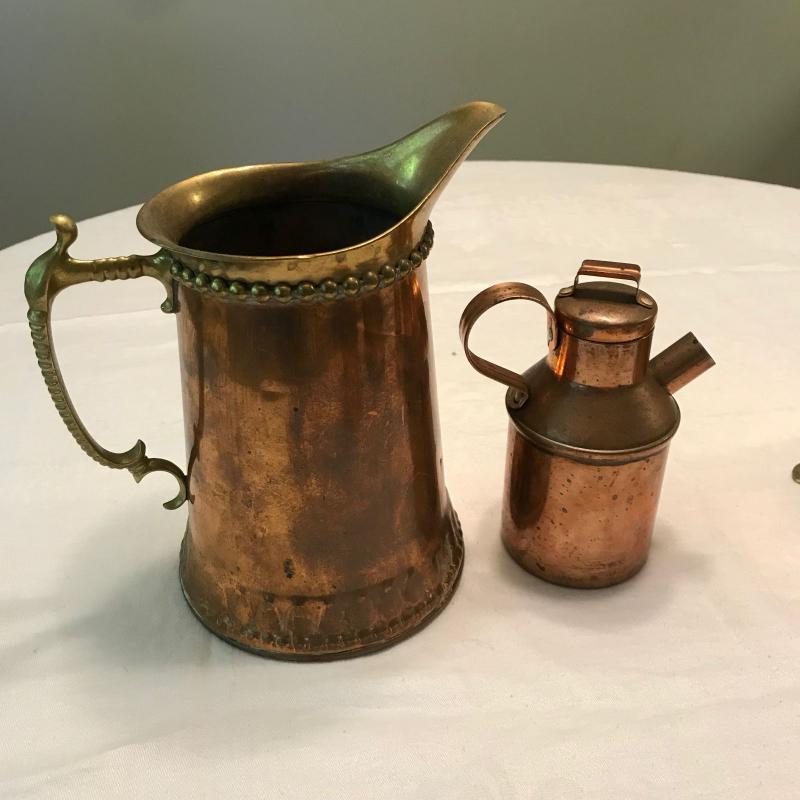 Five copper pieces. Pitcher has nice brass detail and measures 8” x 4” x 8.5”h. Shipping available.