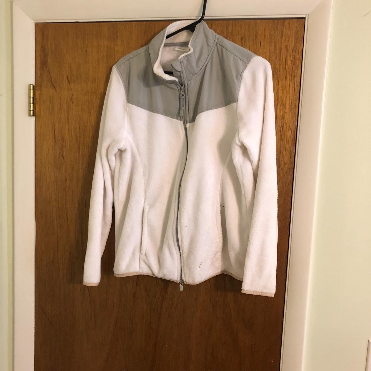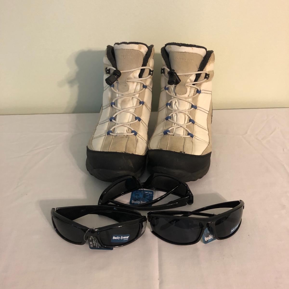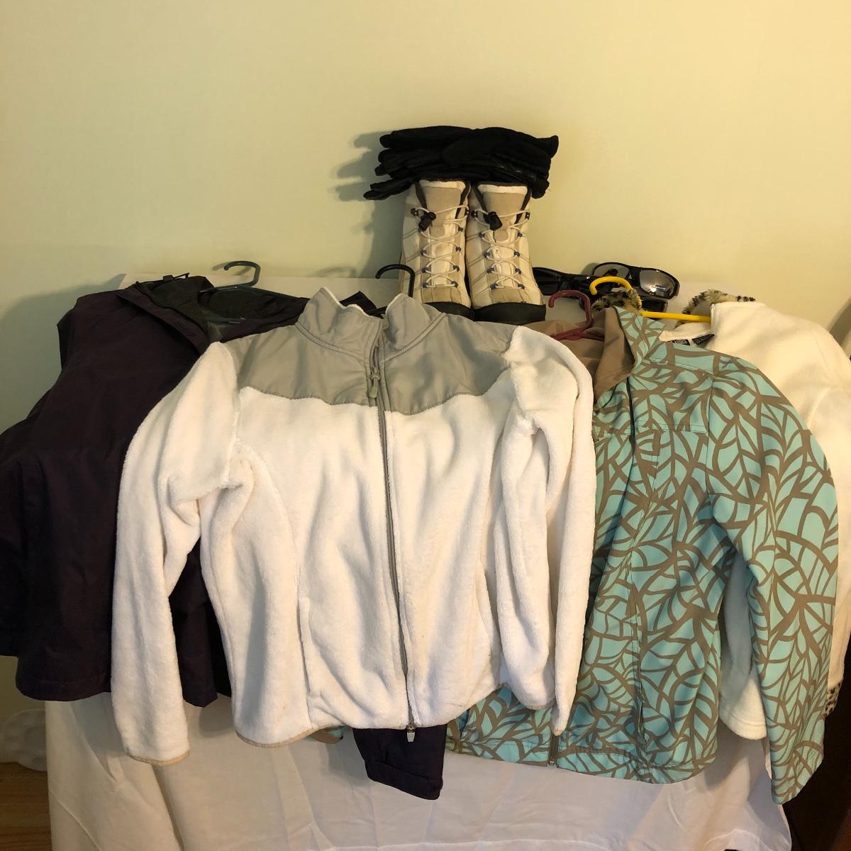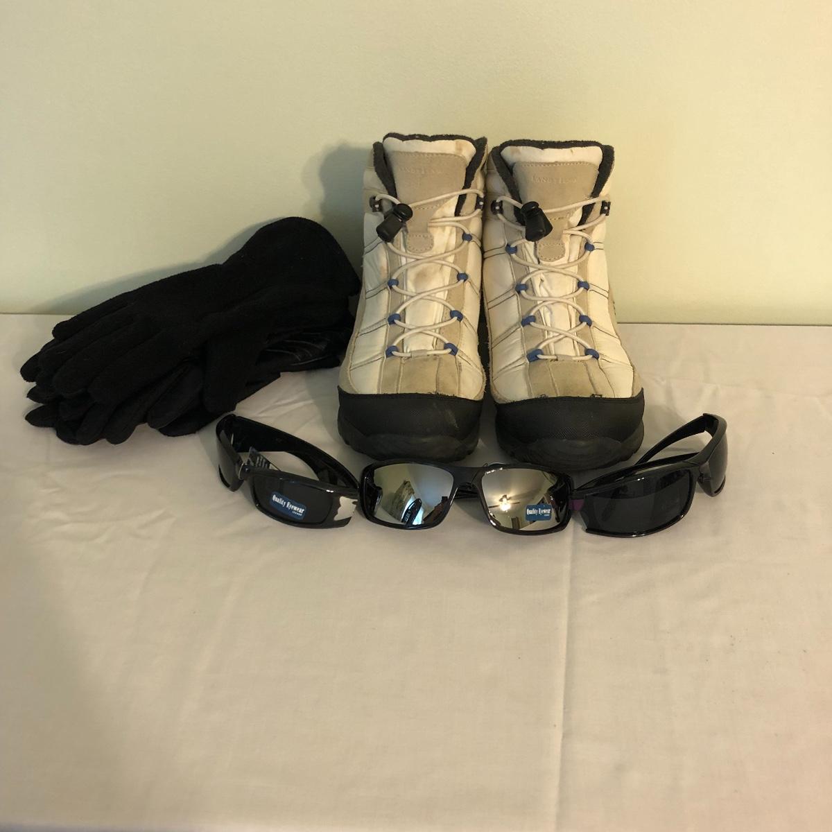 Lot includes Danskin fleece, Columbia jacket, Fashion Classics hooded fleece, reversible lightweight hoodie, Lands End hiking boots, three pairs of gloves and sunglasses. Shoes are size 8.5 and outerwear is size large.