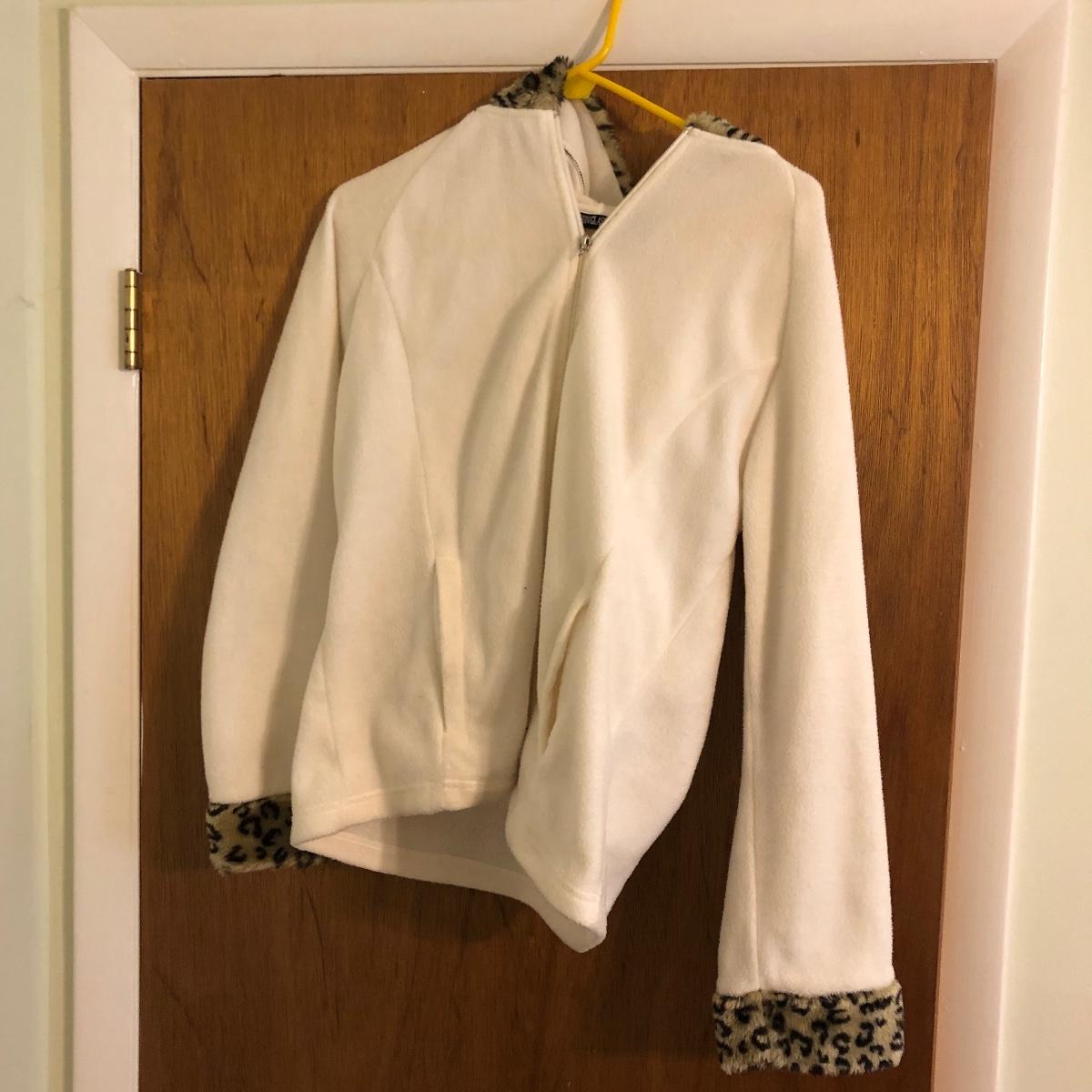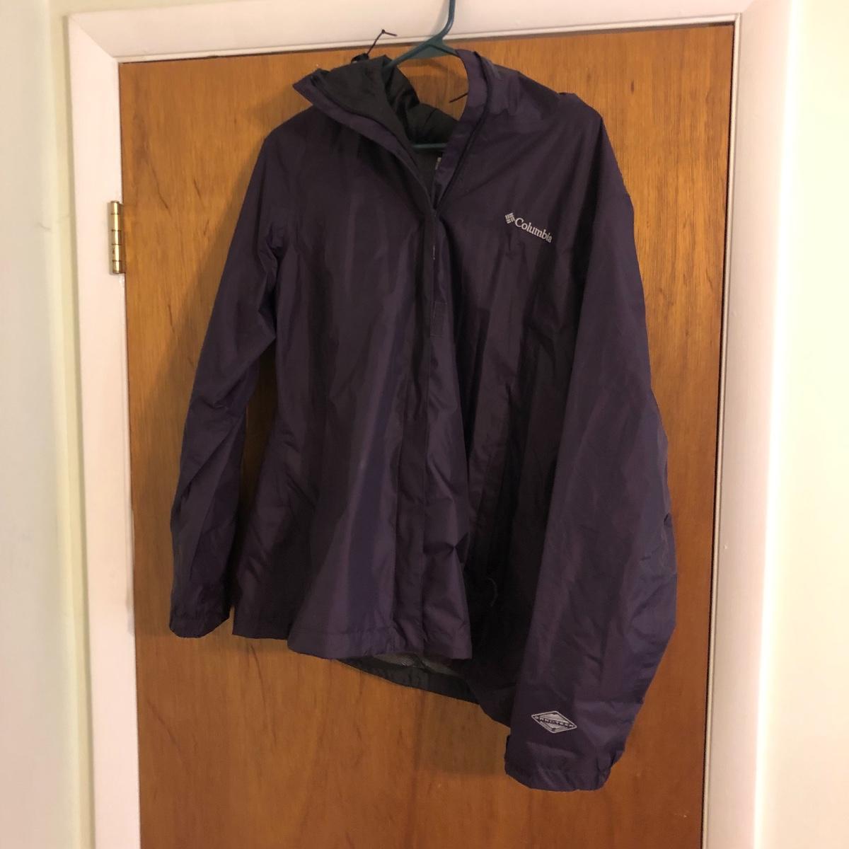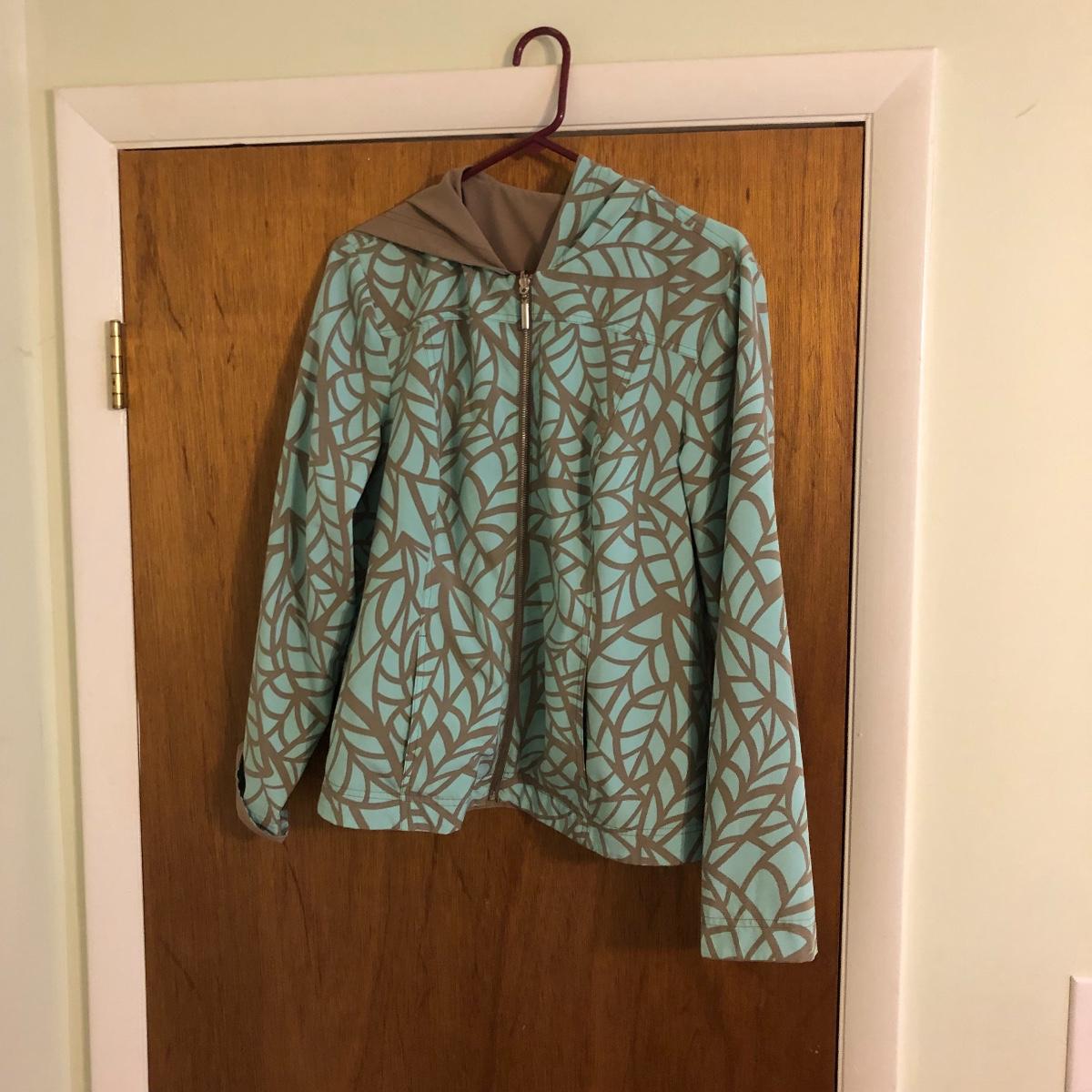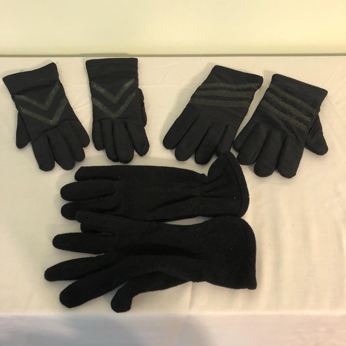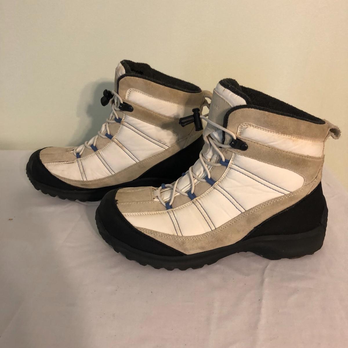 Lot includes Danskin fleece, Columbia jacket, Fashion Classics hooded fleece, reversible lightweight hoodie, Lands End hiking boots, three pairs of gloves and sunglasses. Shoes are size 8.5 and outerwear is size large.