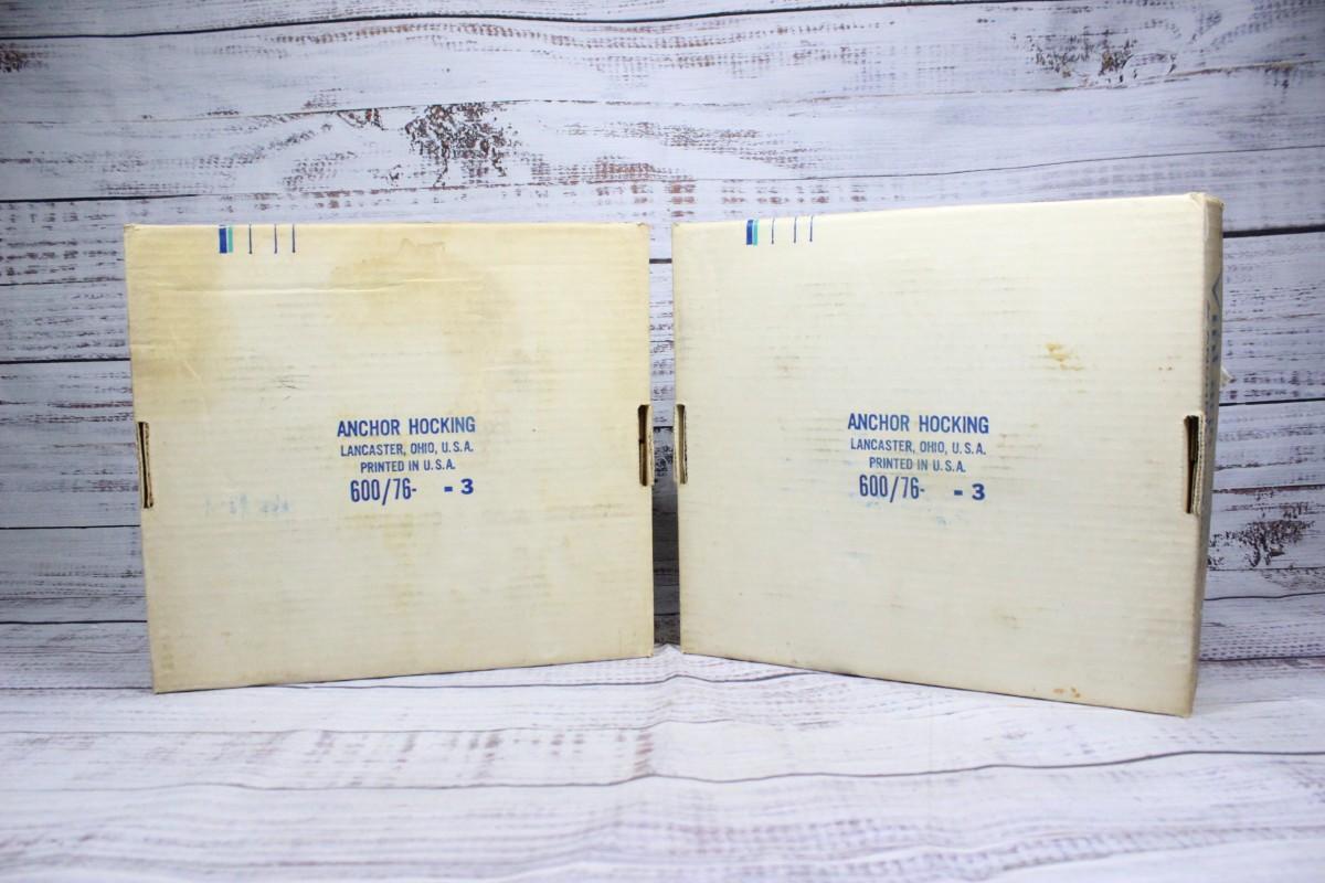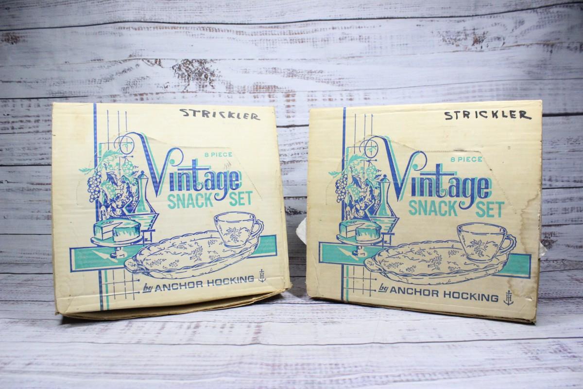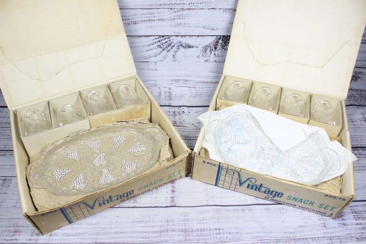 Pair of Vintage Anchor Hocking 8 Piece Glass Snack Set Lot 3, there are no cracks or chips to any of the glass pieces and is in good vintage. Check pictures for more details and for sizing. Both boxes come with a complete set of 8 glass pieces.