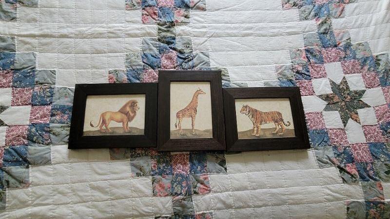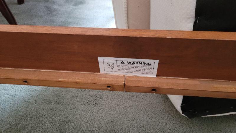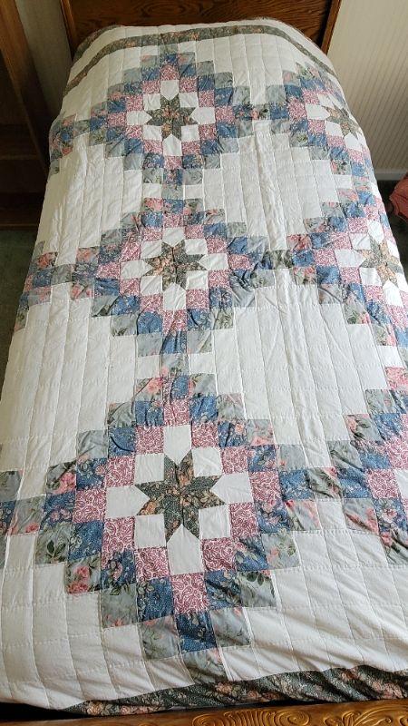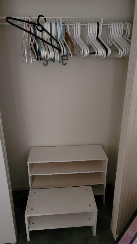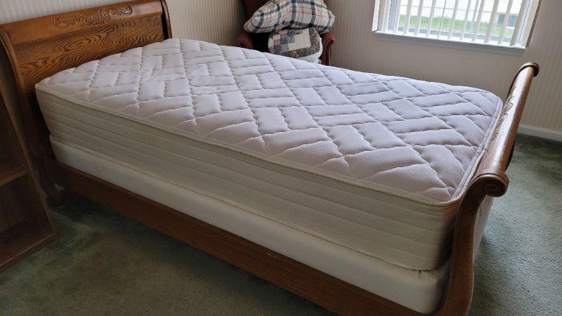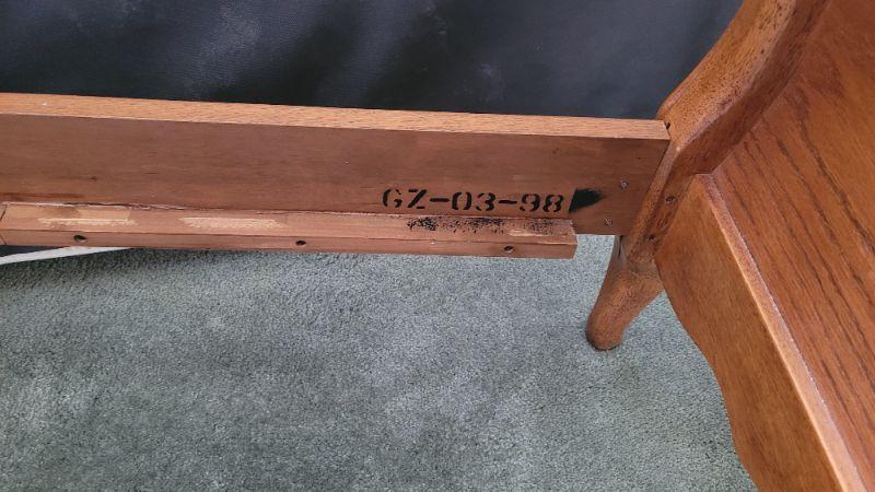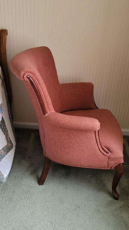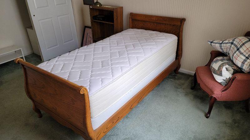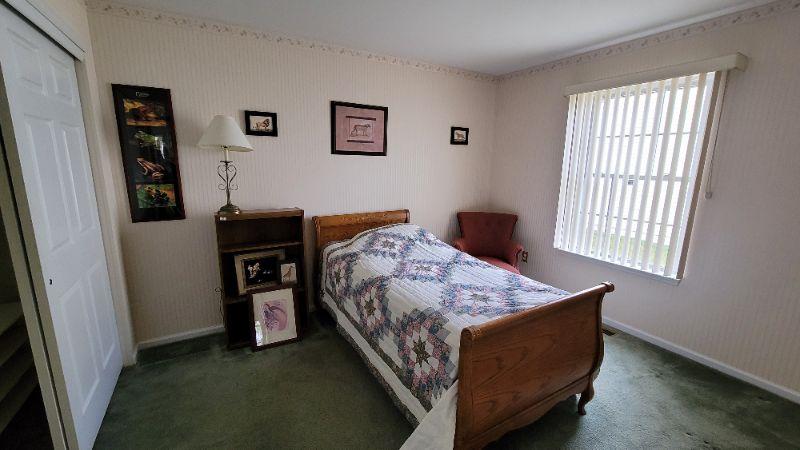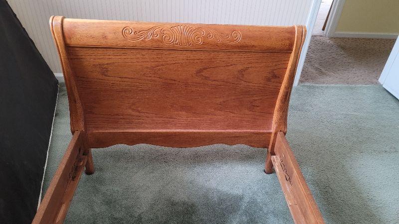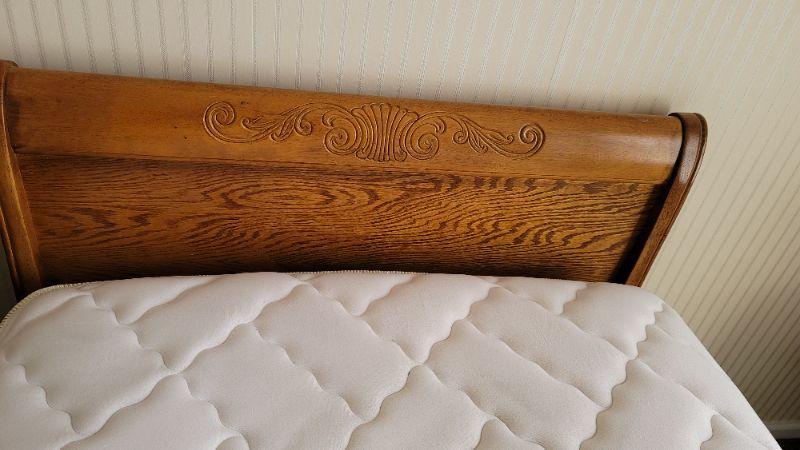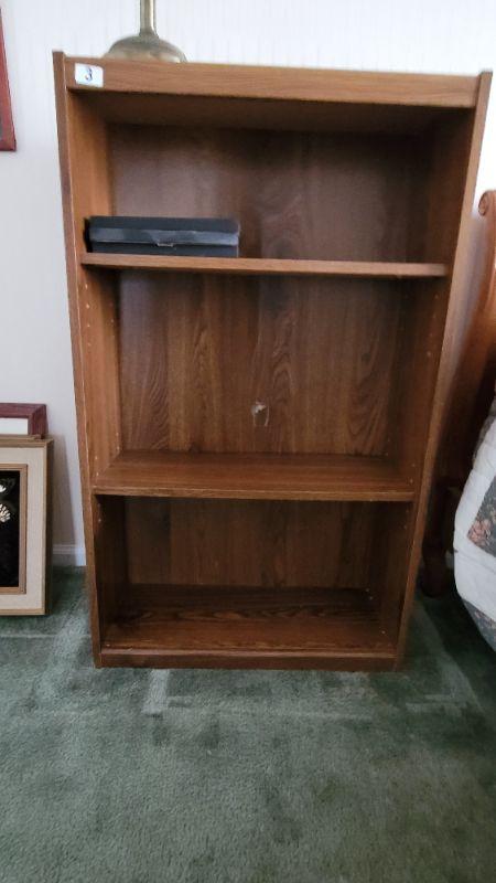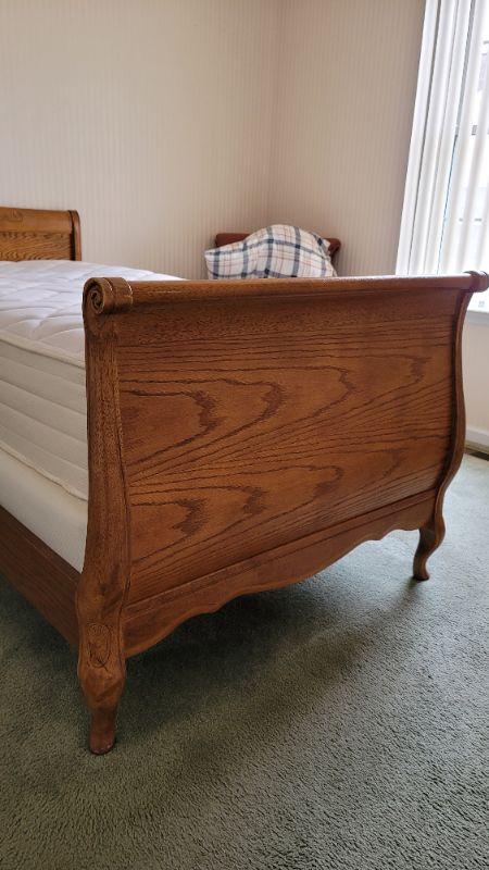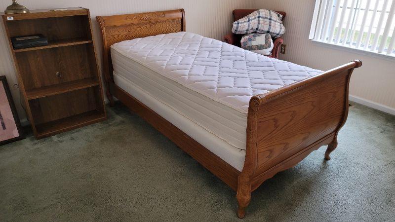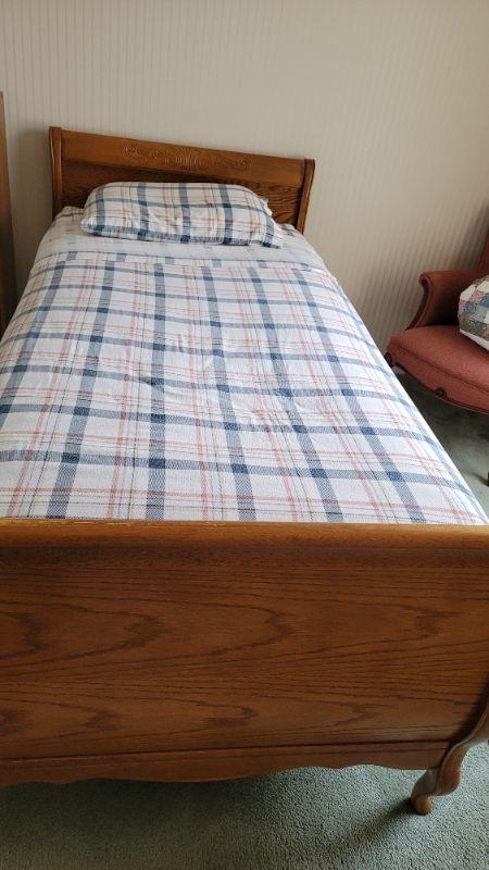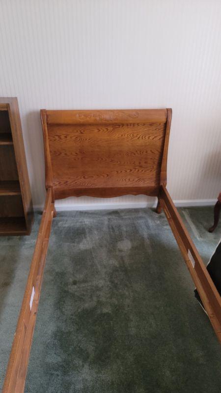 All items included in the pictures are included in this lot . The beautiful oak bed with very comfy mattress, a 26in x 35in x 30in wing back chair and a 25 in x 42in x 10in bookcase. Lamp, art, quilt, flannel sheet set, shoe shelves and hangers.
