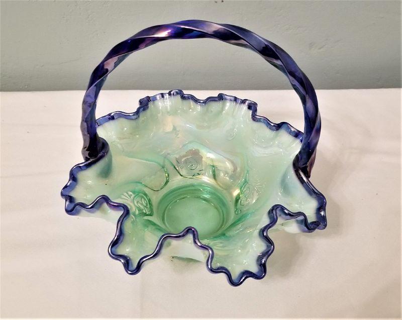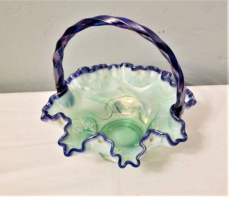 Collectible Fenton Art Glass basket - good condition. 8" tall, 7.75" across. Marked on bottom. The Fenton factory closed several years ago and is no longer producing glass.
