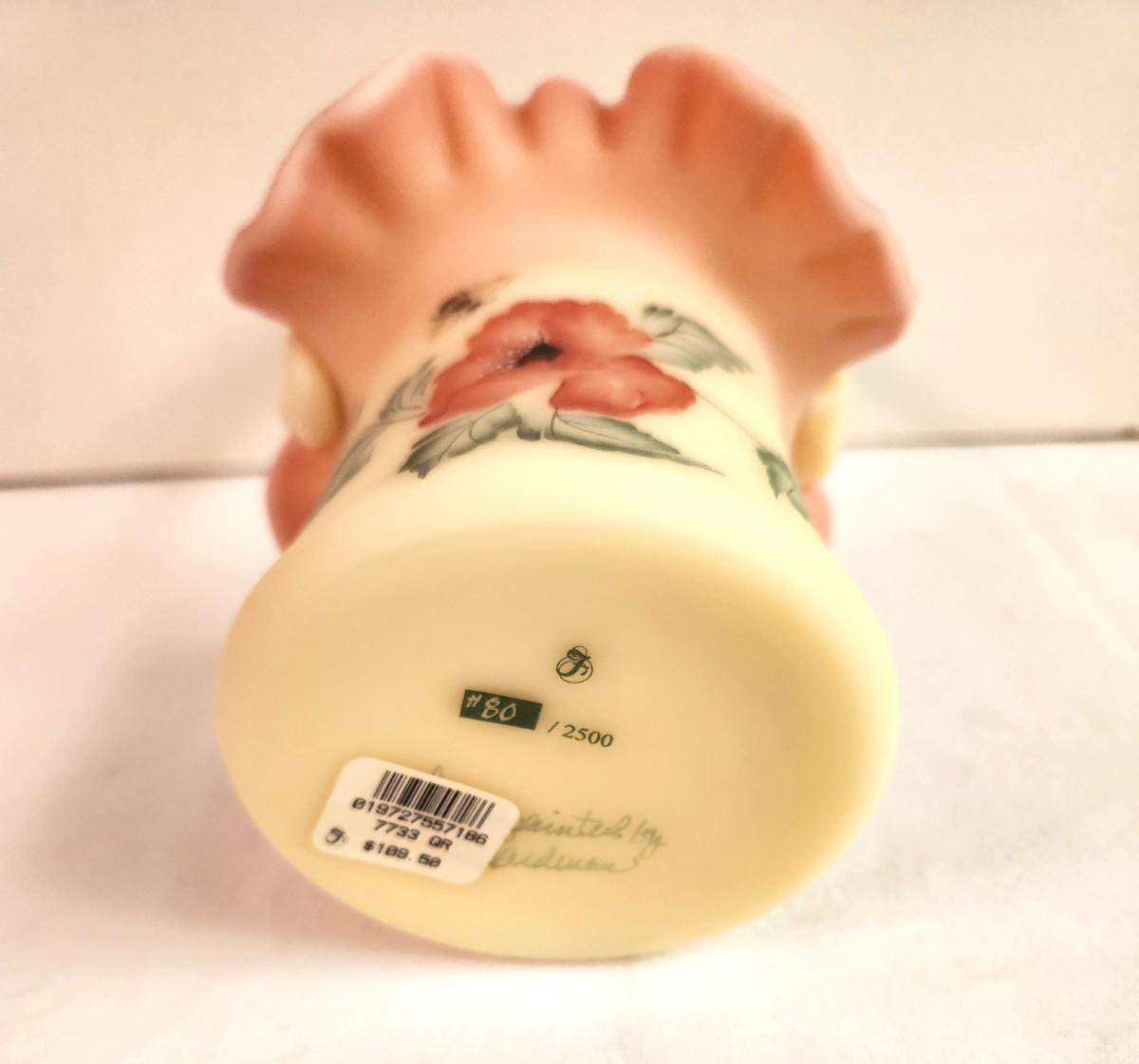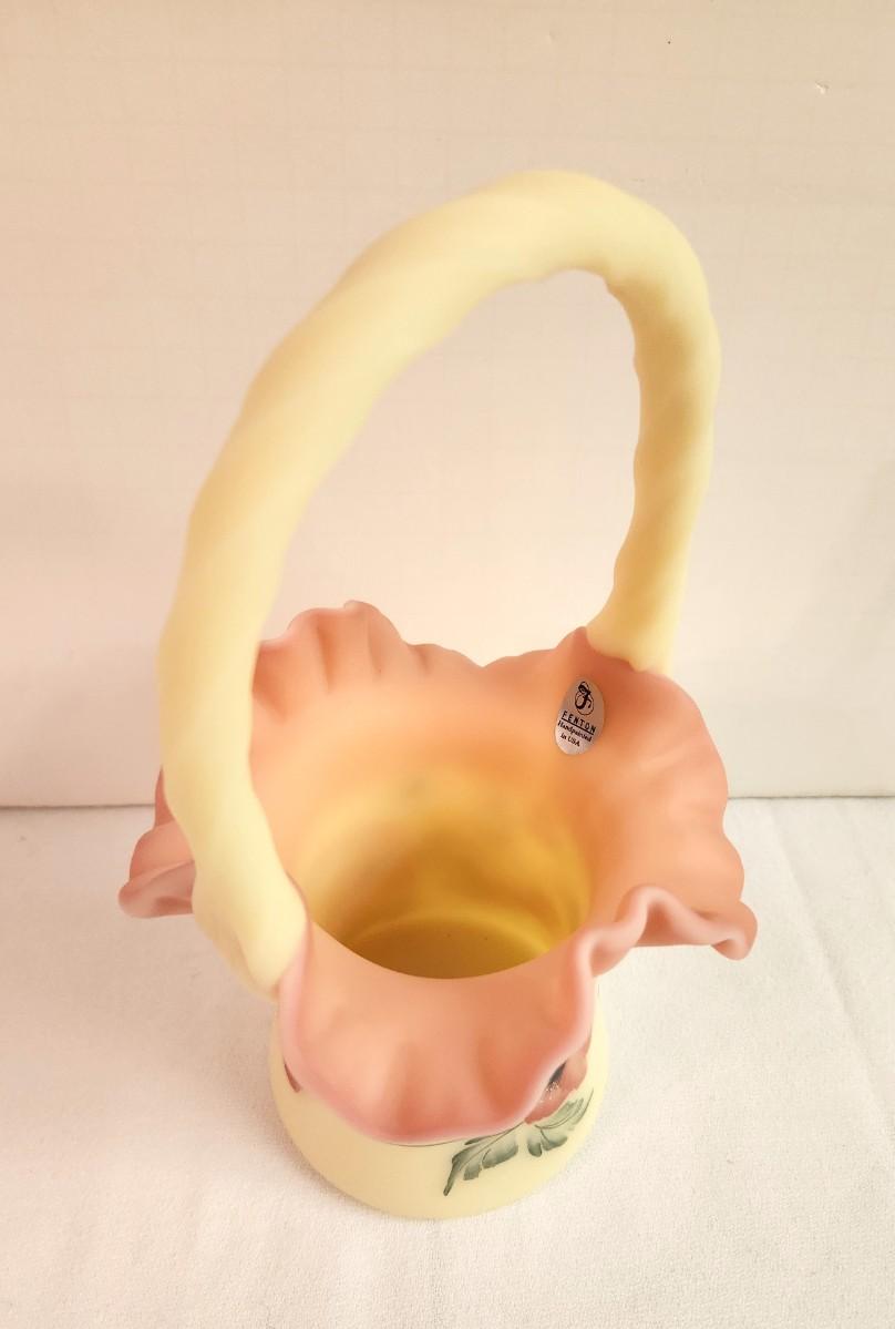 Fenton Art Glass basket - hand painted, signed, limited edition #80/2500 "Lets Bee" - made in 2003. Opalescent - glows under black light. No box - great condition. 8.5" tall.
