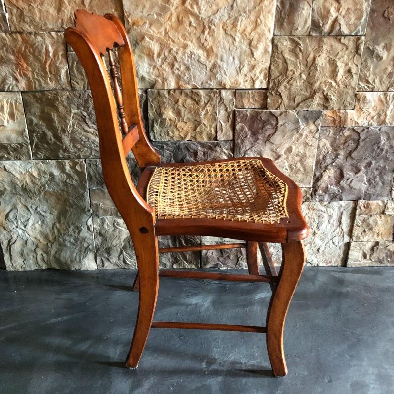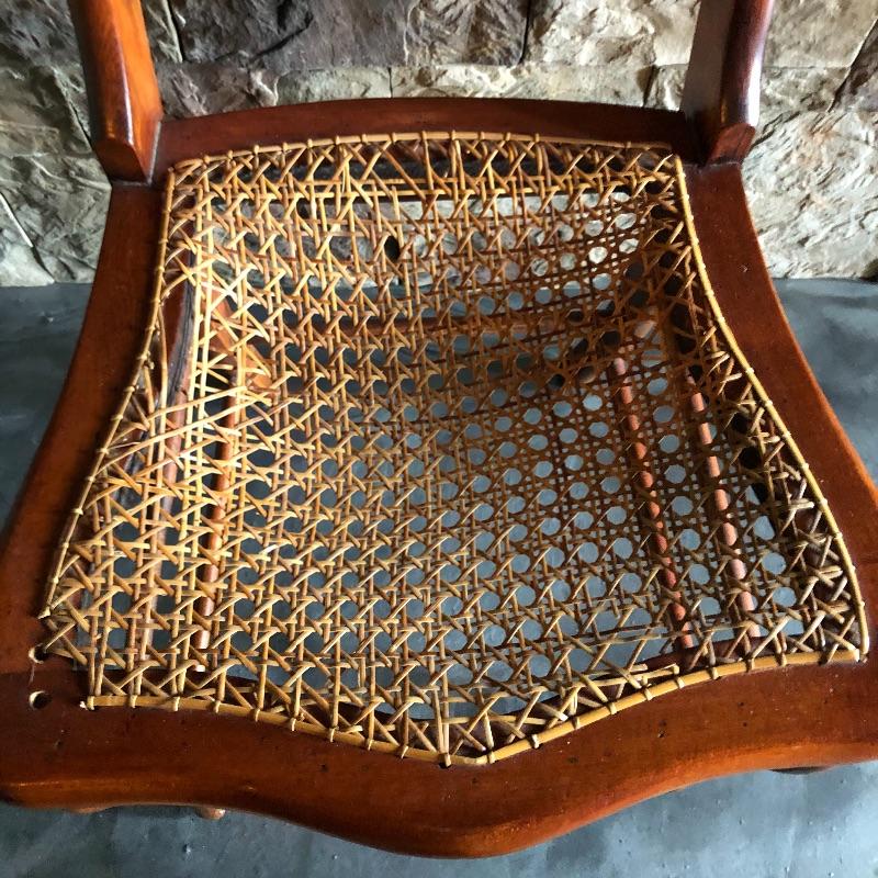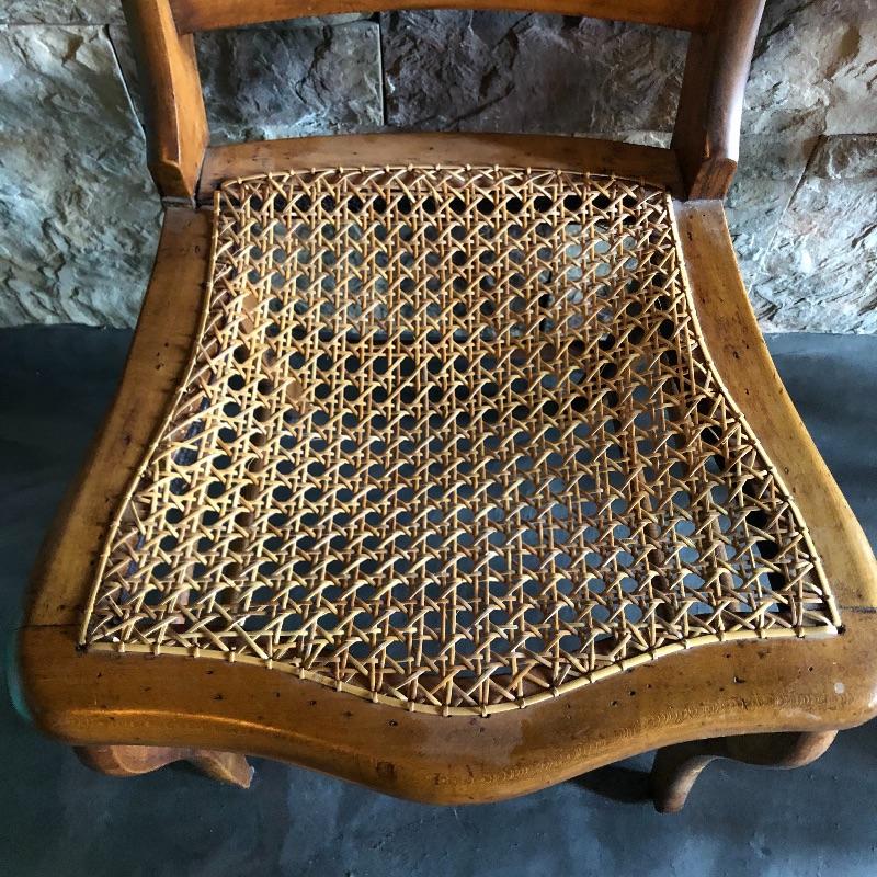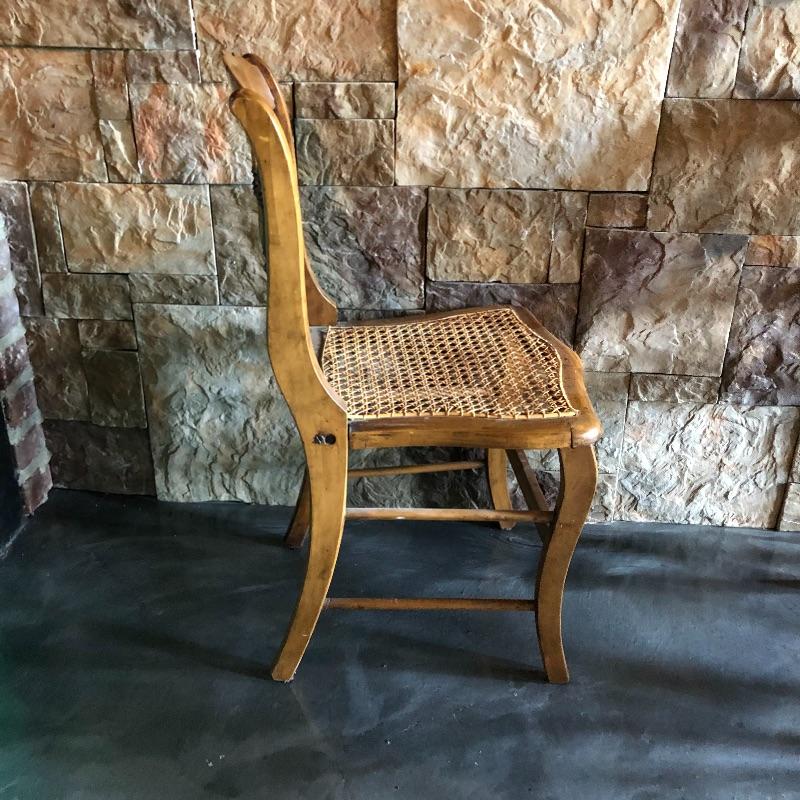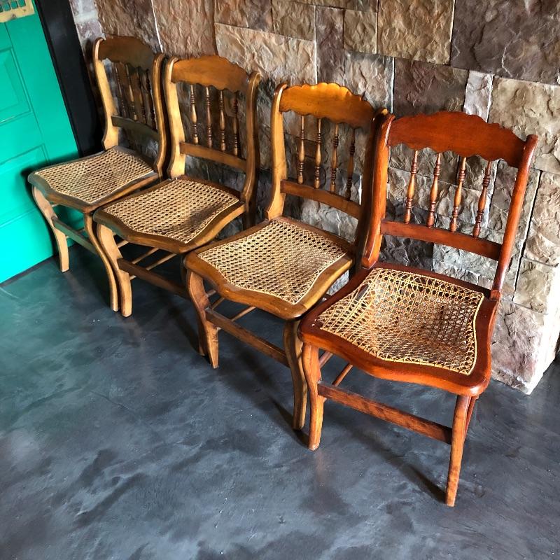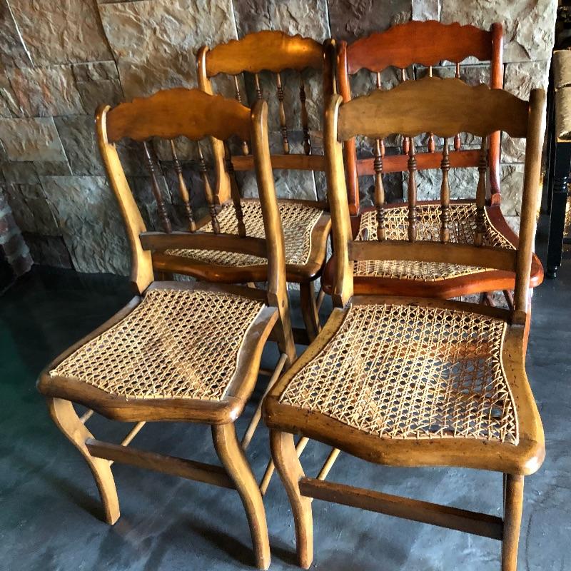 This lot includes four wooden chairs with cane bottoms. A great find for the woodworker to do some repairs and have four lovely chairs. Two chairs have cracks on seat and the other two the cane is breaking through, see pictures.