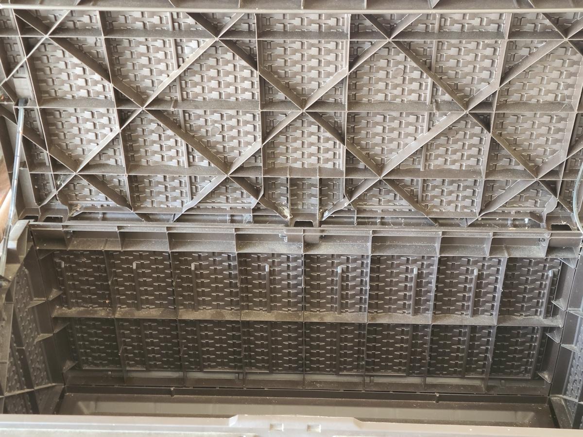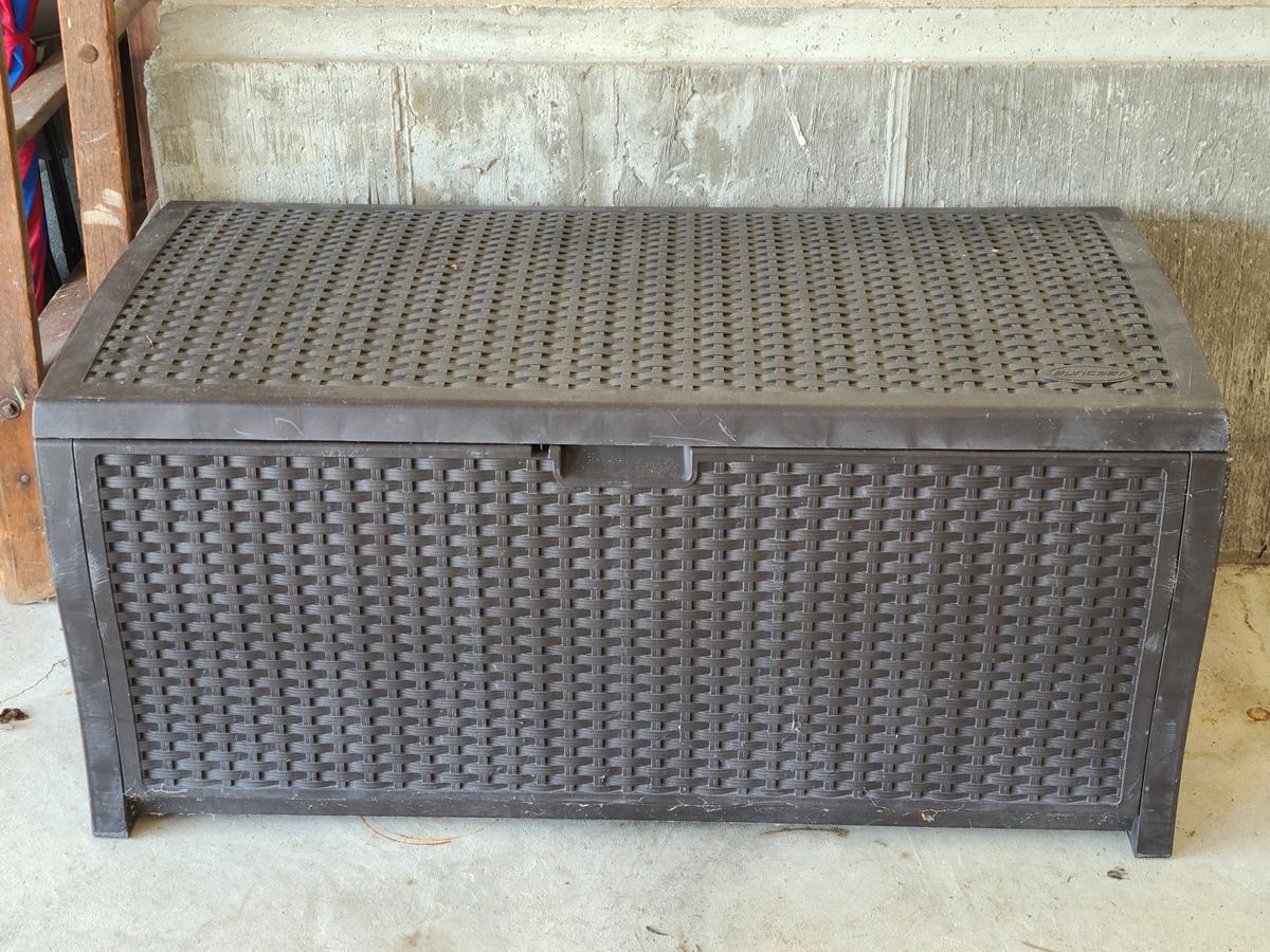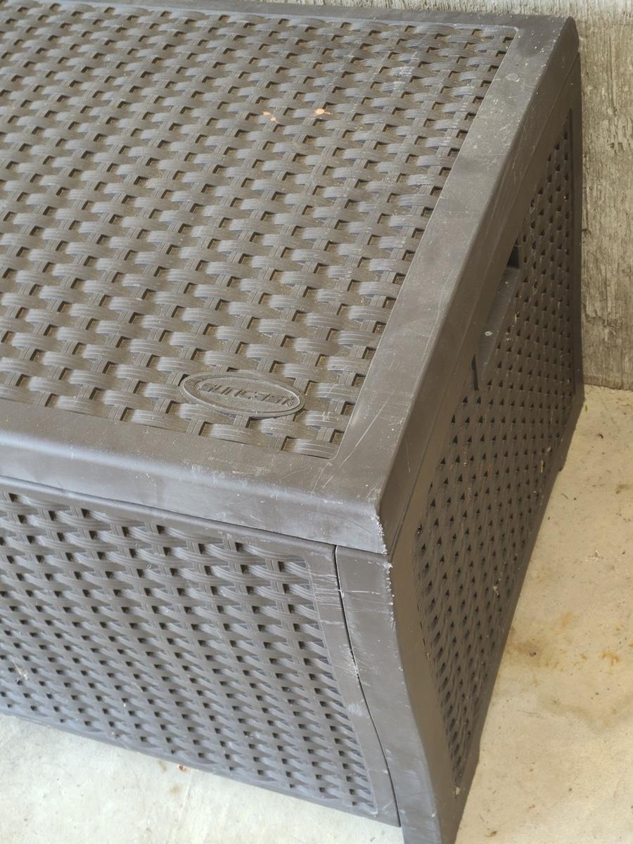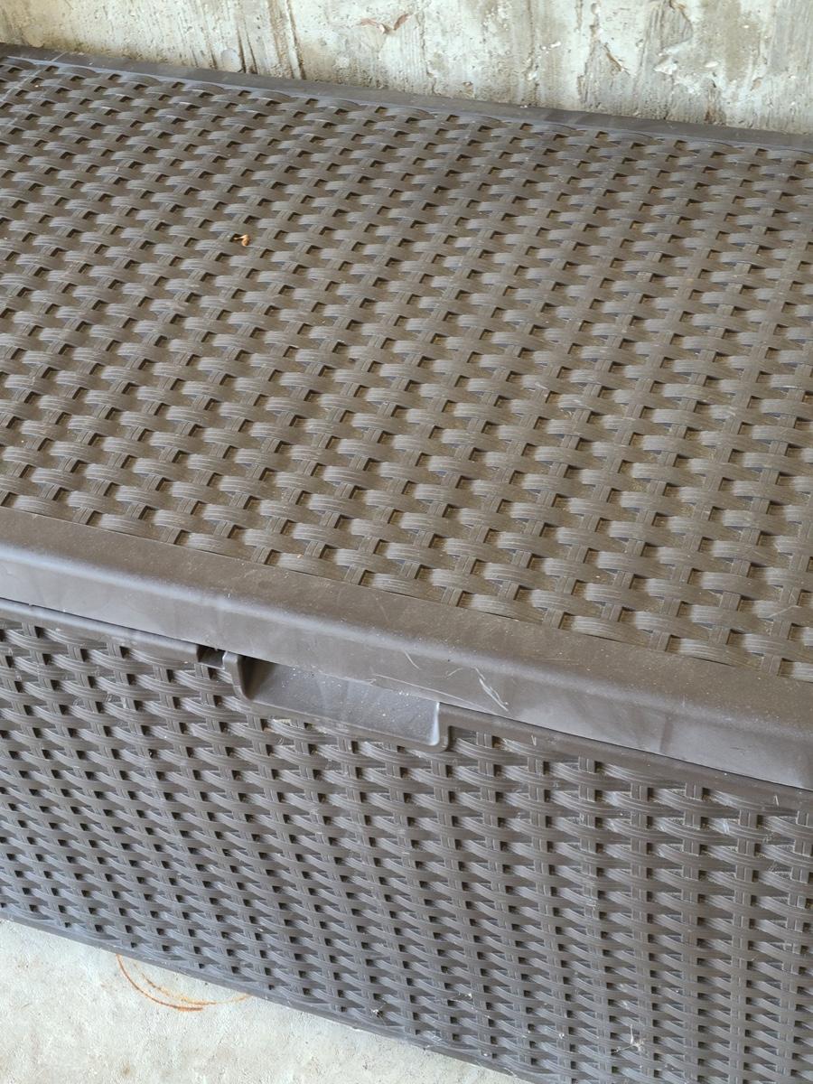 Pre-owned Deck Box great for storage. Sorry, no measurements. Please see all pictures as they are the best representation of the items in the lot, the condition of the lot, and will show measurements if taken. If purchasing furniture you must be able to move yourself with your own help, and truck. .