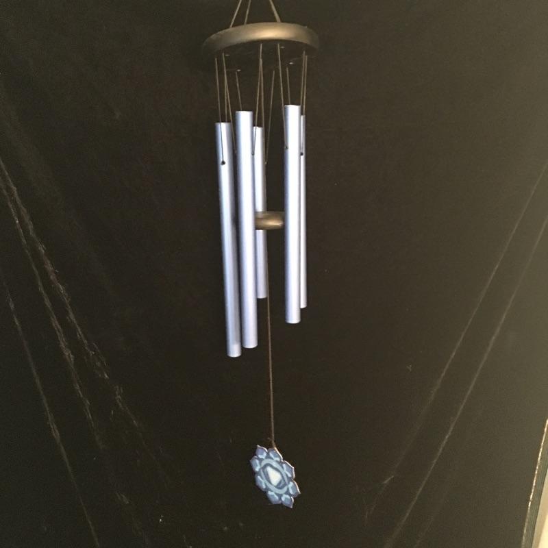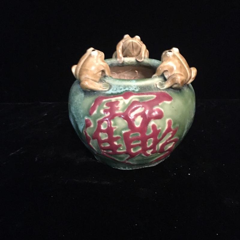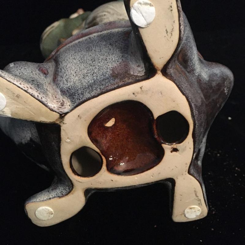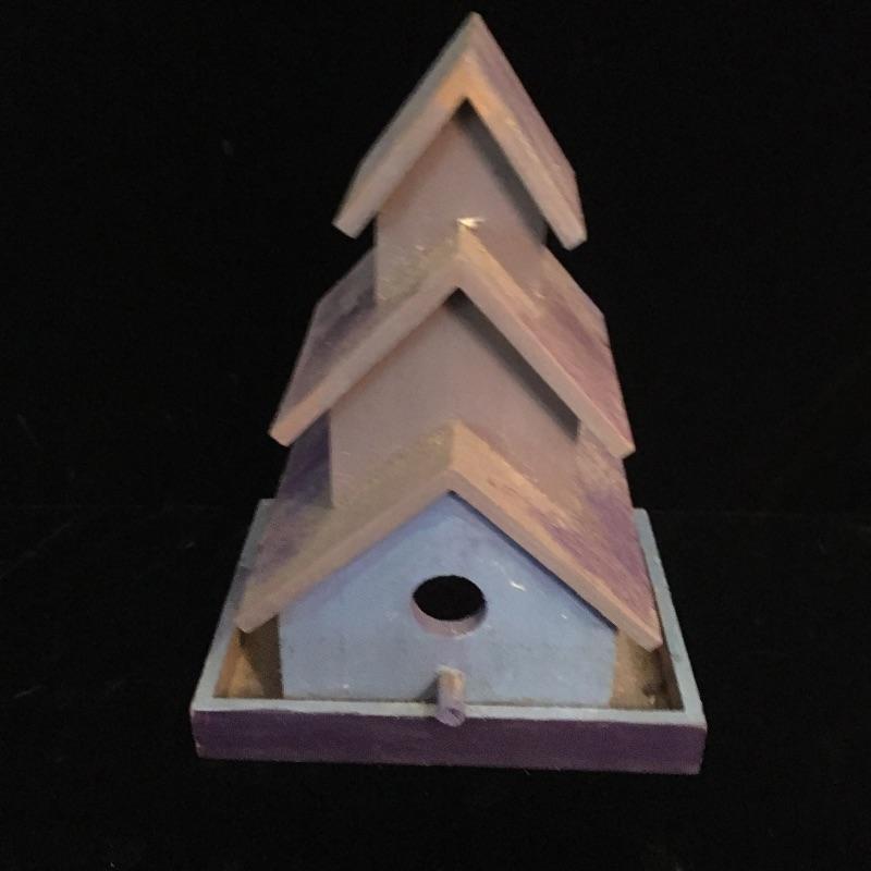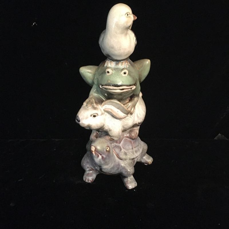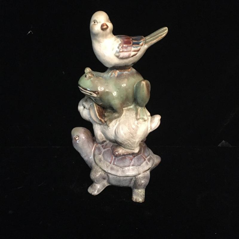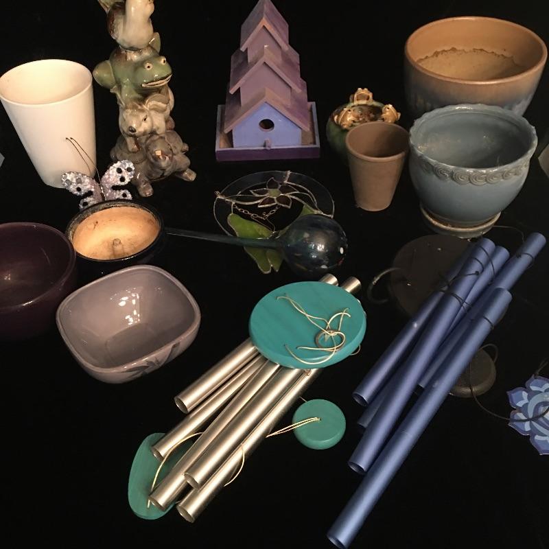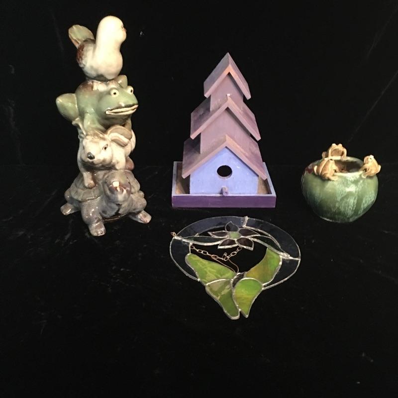 Garden and patio decor includes Woodstock chime, small and medium ceramic planters, blue wind chime, four stacked animals decoration, wooden birdhouse and more. Four stacked animals measures 7” wide x 12” tall.