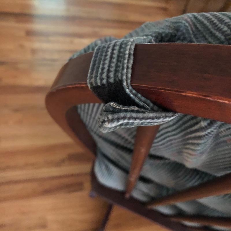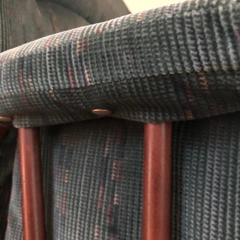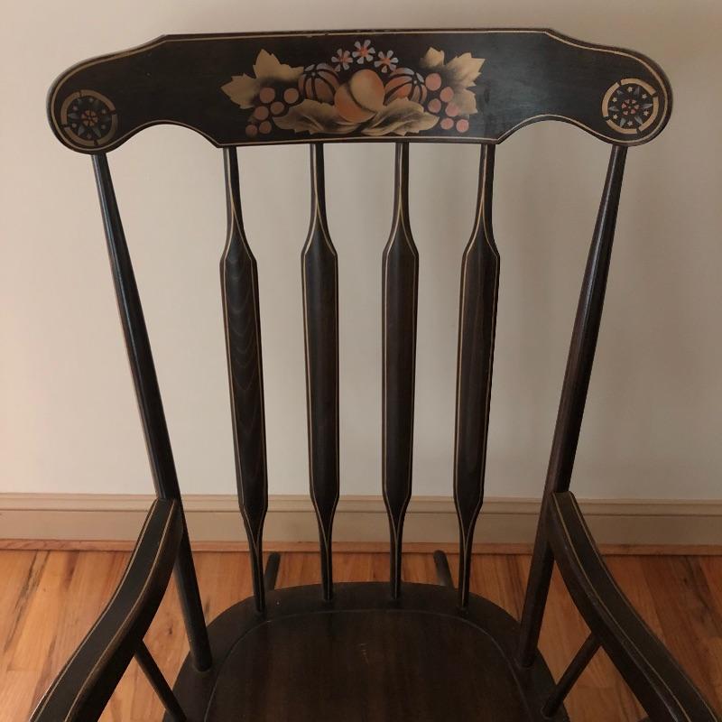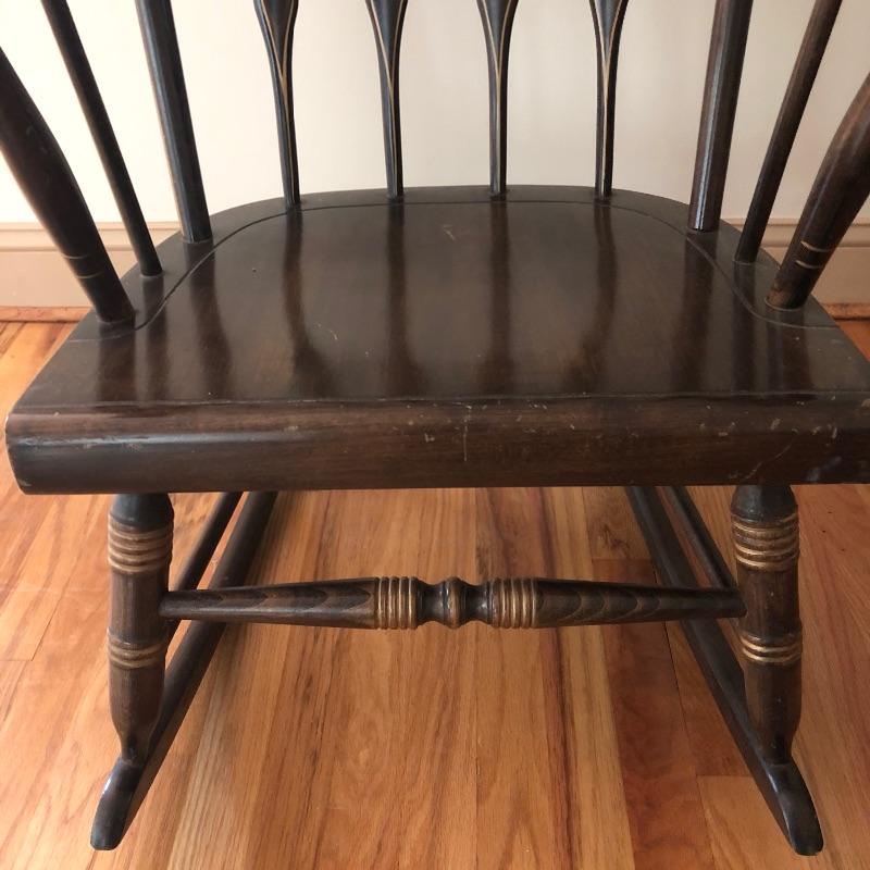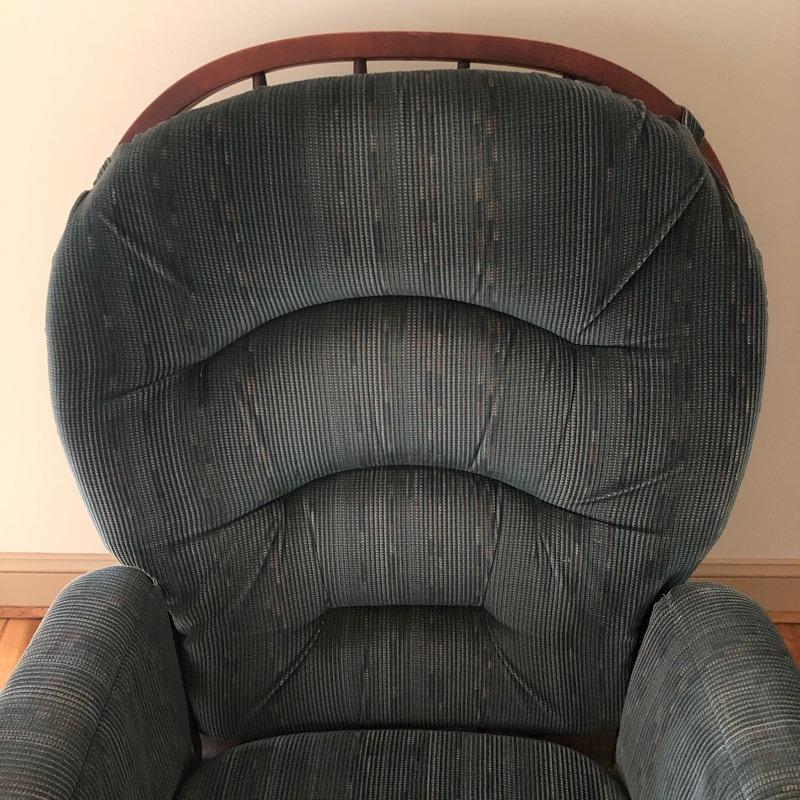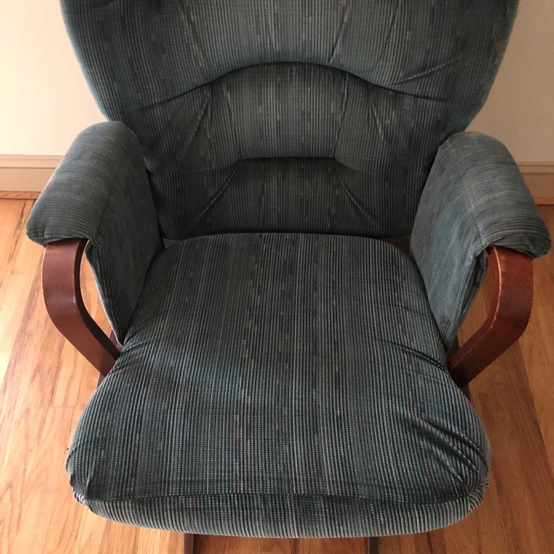 This lot includes a glider chair with green cushions, as well as a dark wood rocking chair. These lovely pieces add comfort to any area in your home. Chairs exhibit some signs of wear. The seat cushion on the glider is removable and the back cushion attaches with velcro. The rocker measures 23”W x 30”D x 41”H. The glider measures 22”W x 28”D x 40”H. Local pickup only.