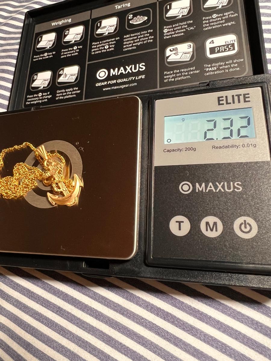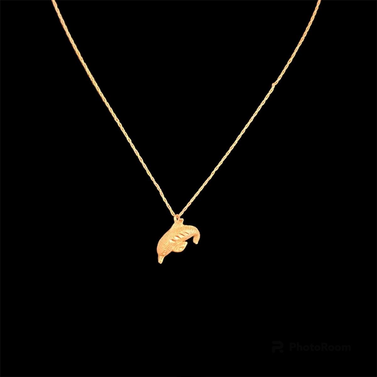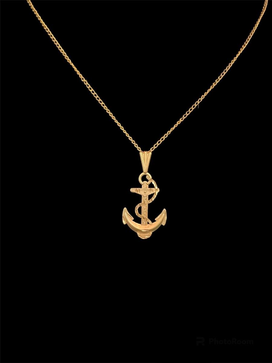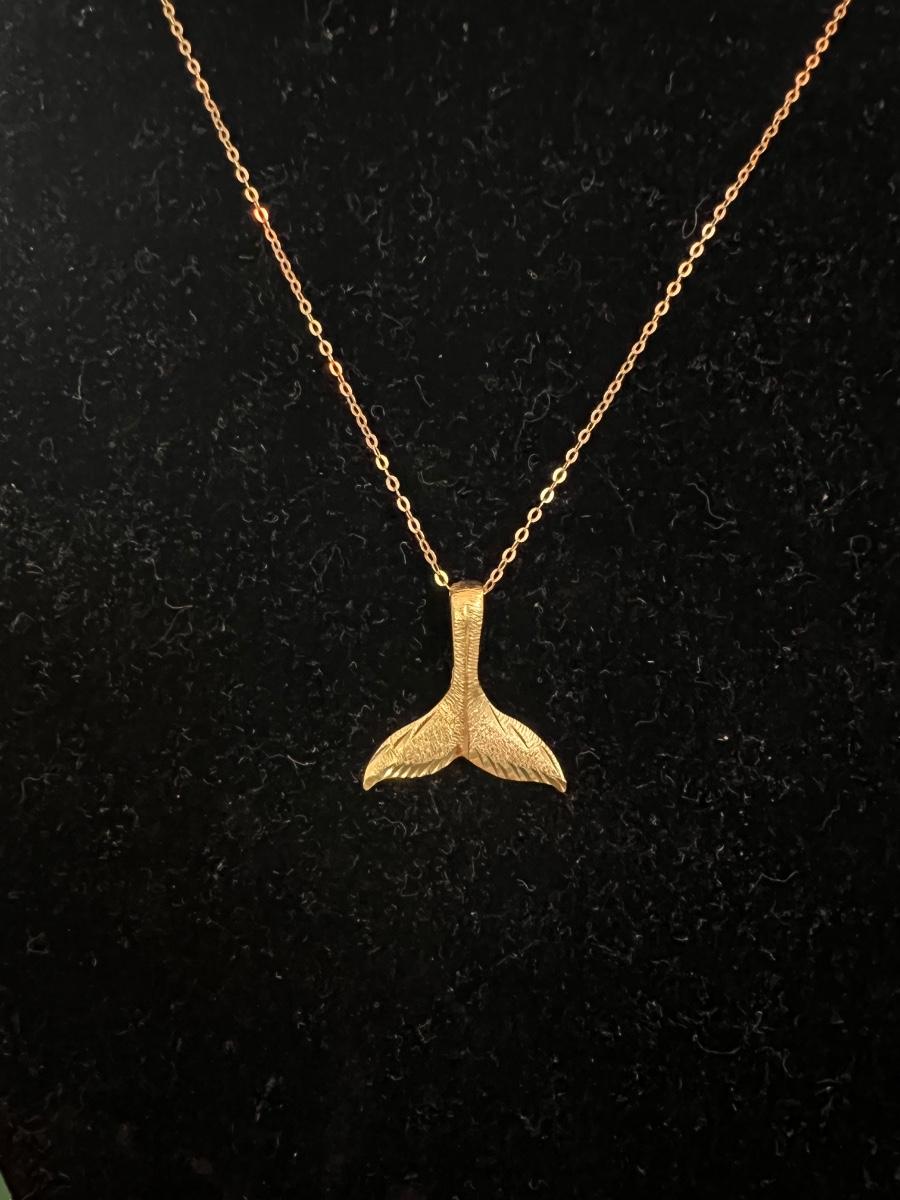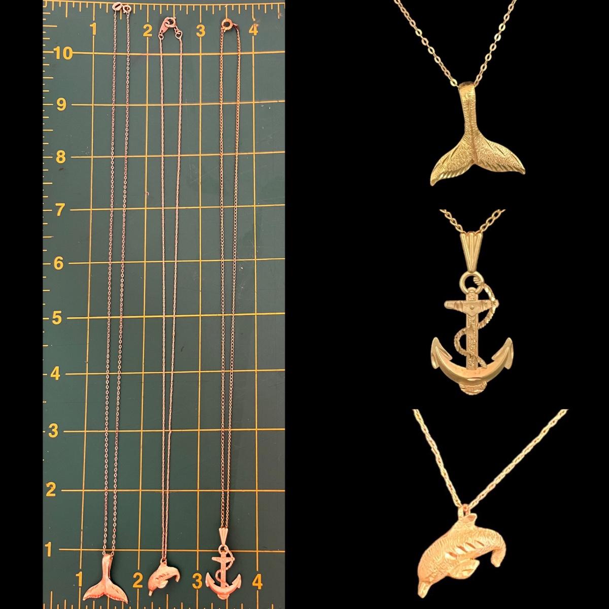 All are etched and brushed gold. Dolphin pendant is 14k. Chain not stamped. Whale tail is 14k chain stamped 565 Italy (which is 14k). Anchor stamped 14k and chain stamped 1/20 12k.