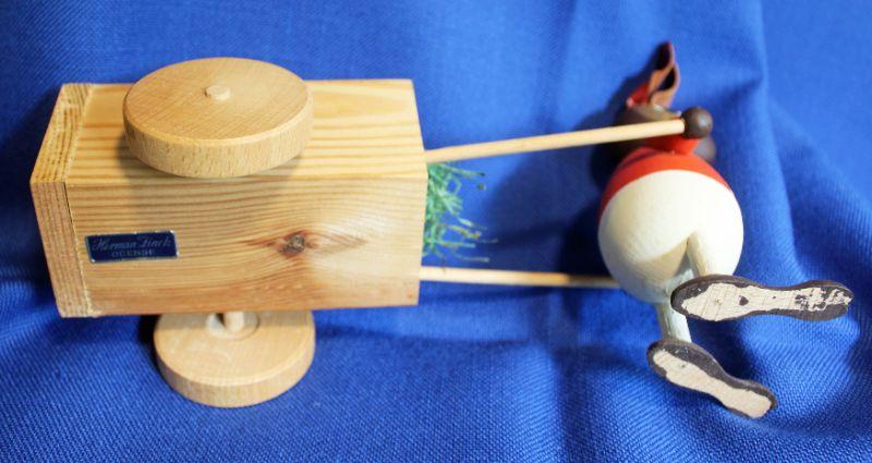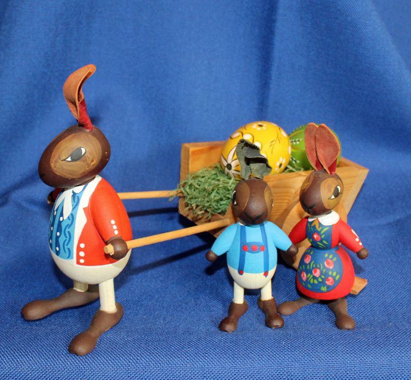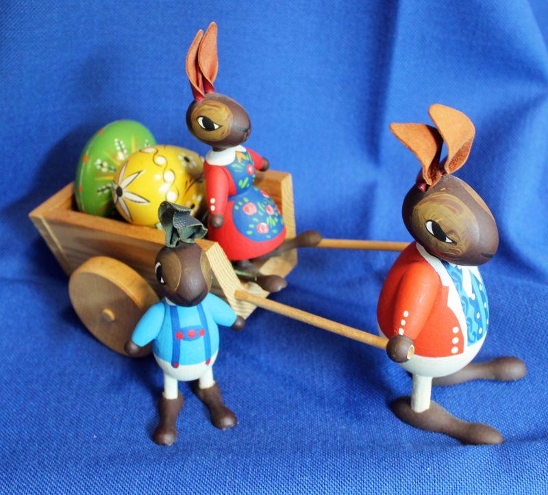 Set of 3 bunnies with cart. 2 wooden painted bunnies. signed Herman Finck. Purchased in Europe in the 1960s. 6" x 9"