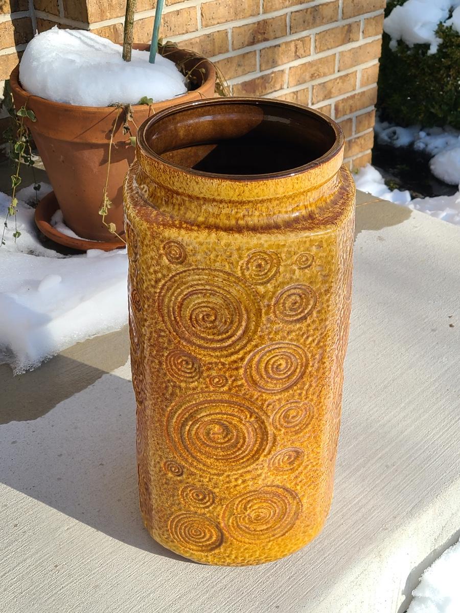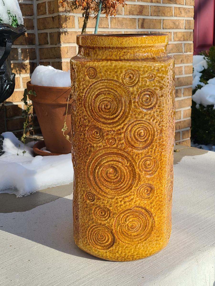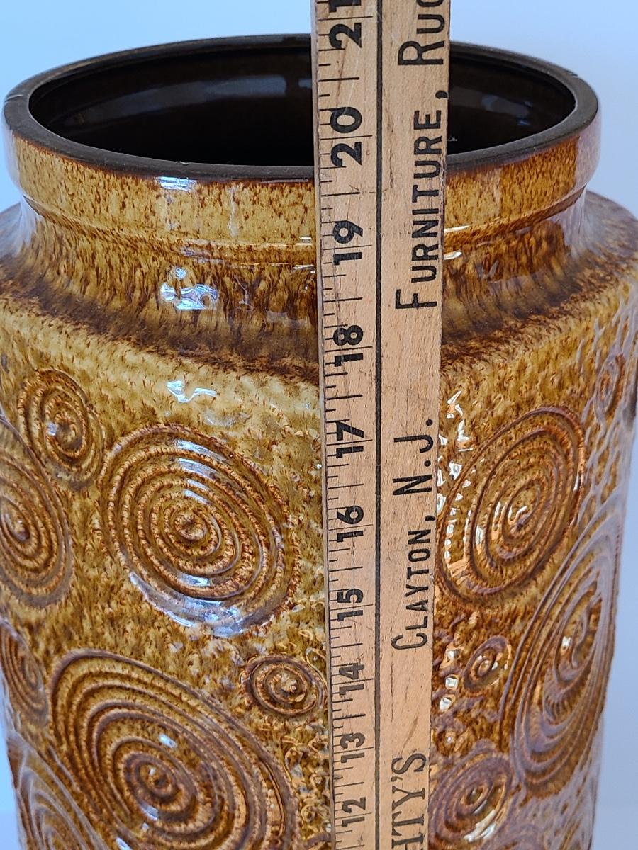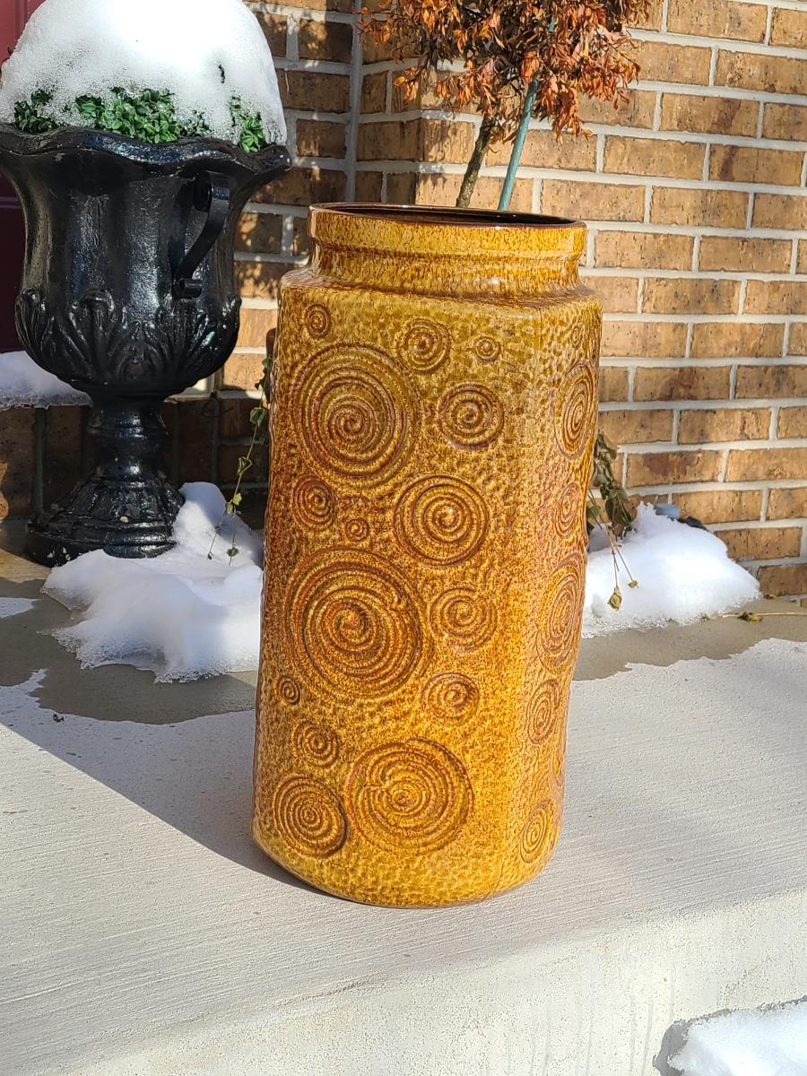 This gorgeous piece was used in the home everyday as an umbrella stand. It is caramel or camel in color. It stands around 20 inches tall. This was taken outside to show the color in natural light. This is marked W Germany on the bottom and most likely is a Scheurich piece in the "Jura" pattern. Amazing piece to find in this size and condition. It does have the smallest nick on the inside edge of vase top. Pictures taken from every angle. Please see all pictures as they are the best representation of the items. The pictures show condition, measurements if taken, and what is included in the lot. Due to the large amount that we photograph and the time frame, we are not always able to take measurements. All items unless noted, are pre-owned and have been used. If you purchased furniture, you must bring help. We do not allow one person to carry large furniture out on their own. Bring help, tools and a truck for the safety of our client’s homes, and your personal safety. Any damages that result to the property including walls, and floors due to moving of the furniture will be charged to the buyer. Company policy. Thank you.