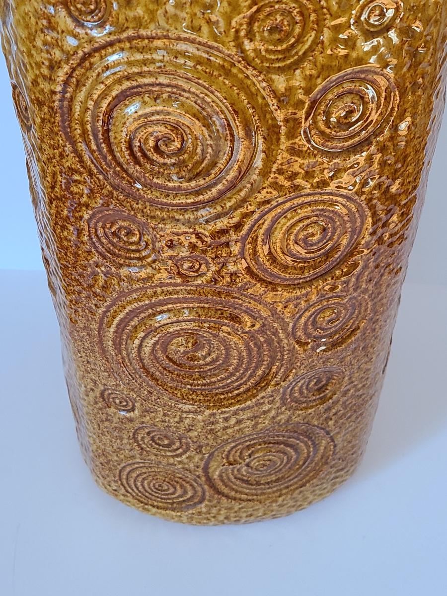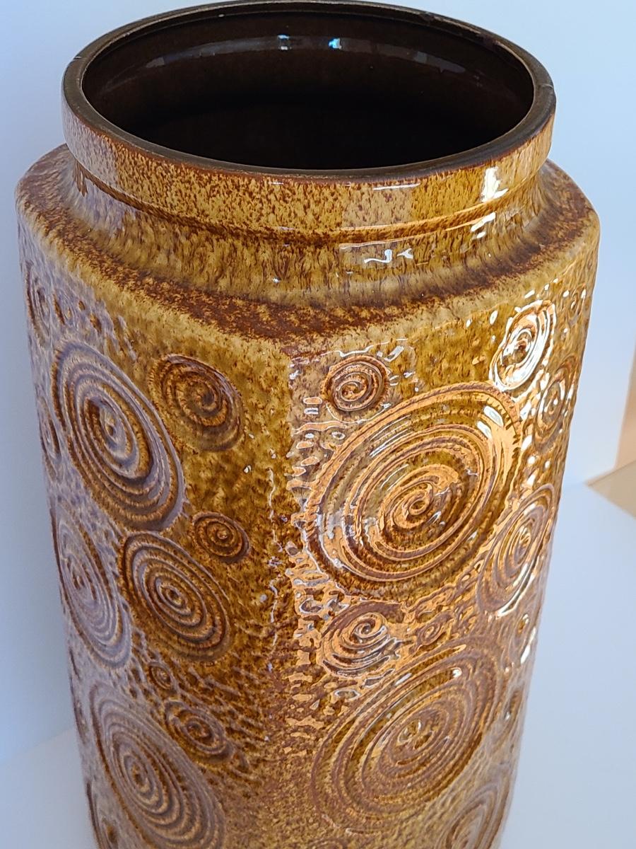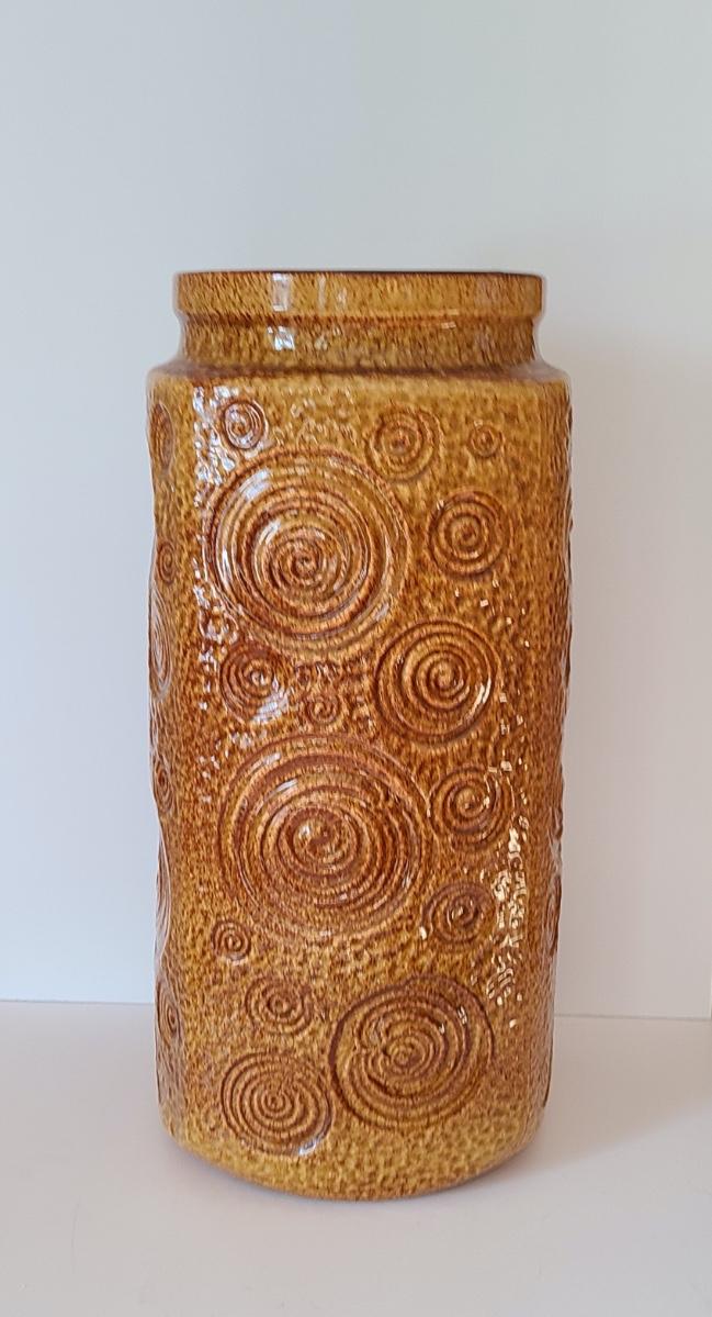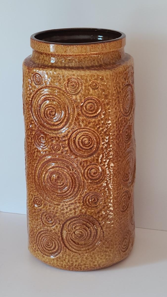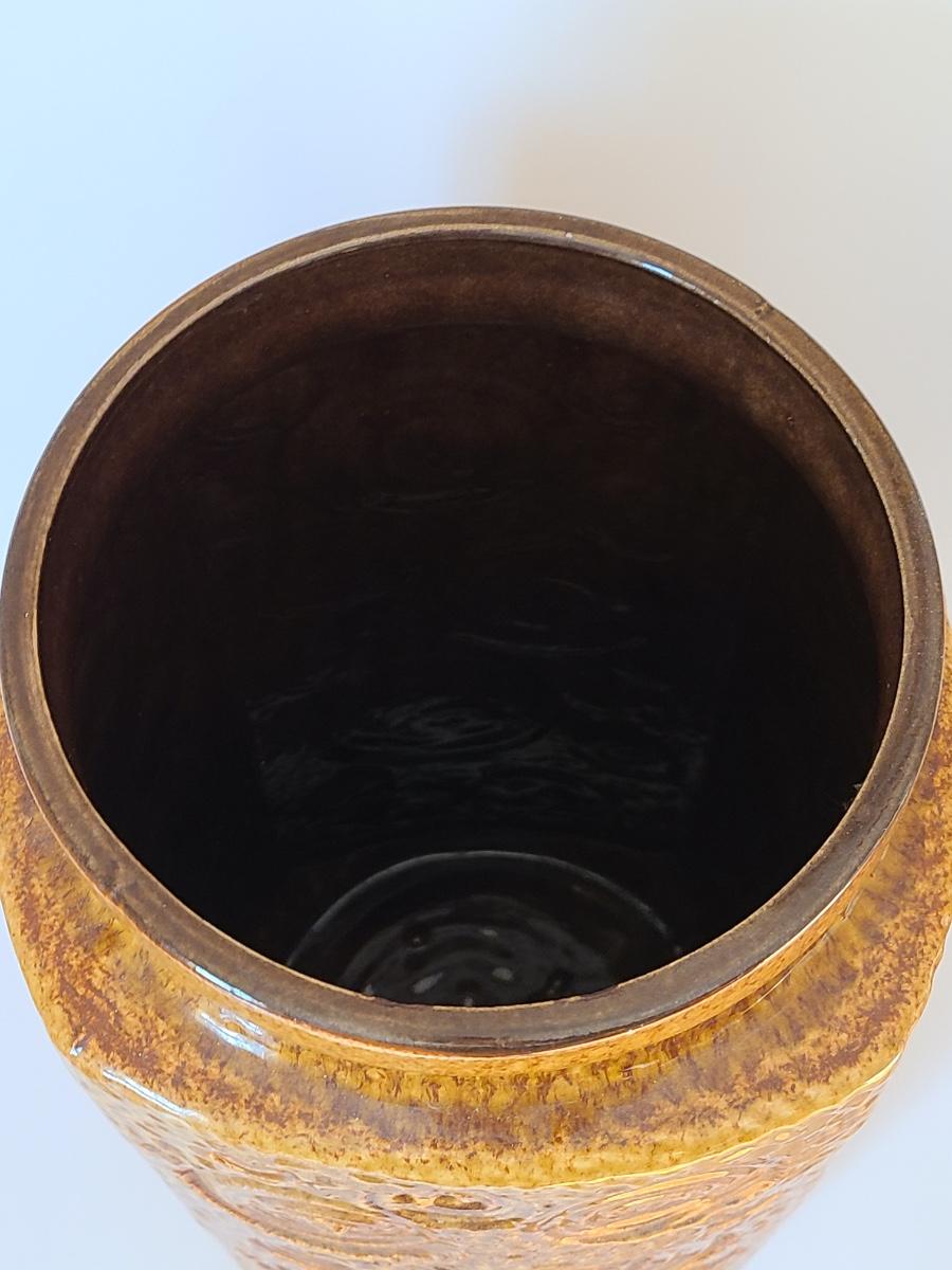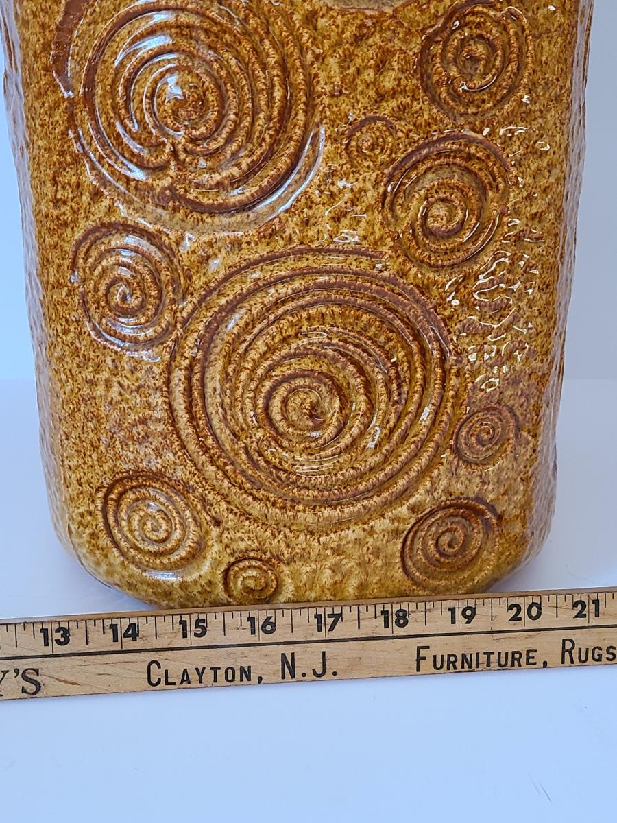 This gorgeous piece was used in the home everyday as an umbrella stand. It is caramel or camel in color. It stands around 20 inches tall. This was taken outside to show the color in natural light. This is marked W Germany on the bottom and most likely is a Scheurich piece in the "Jura" pattern. Amazing piece to find in this size and condition. It does have the smallest nick on the inside edge of vase top. Pictures taken from every angle. Please see all pictures as they are the best representation of the items. The pictures show condition, measurements if taken, and what is included in the lot. Due to the large amount that we photograph and the time frame, we are not always able to take measurements. All items unless noted, are pre-owned and have been used. If you purchased furniture, you must bring help. We do not allow one person to carry large furniture out on their own. Bring help, tools and a truck for the safety of our client’s homes, and your personal safety. Any damages that result to the property including walls, and floors due to moving of the furniture will be charged to the buyer. Company policy. Thank you.
