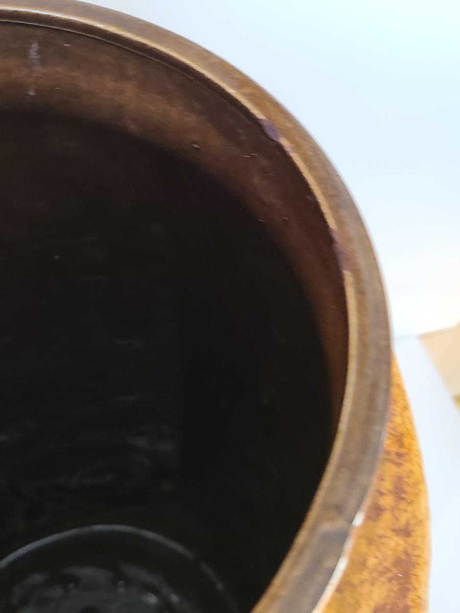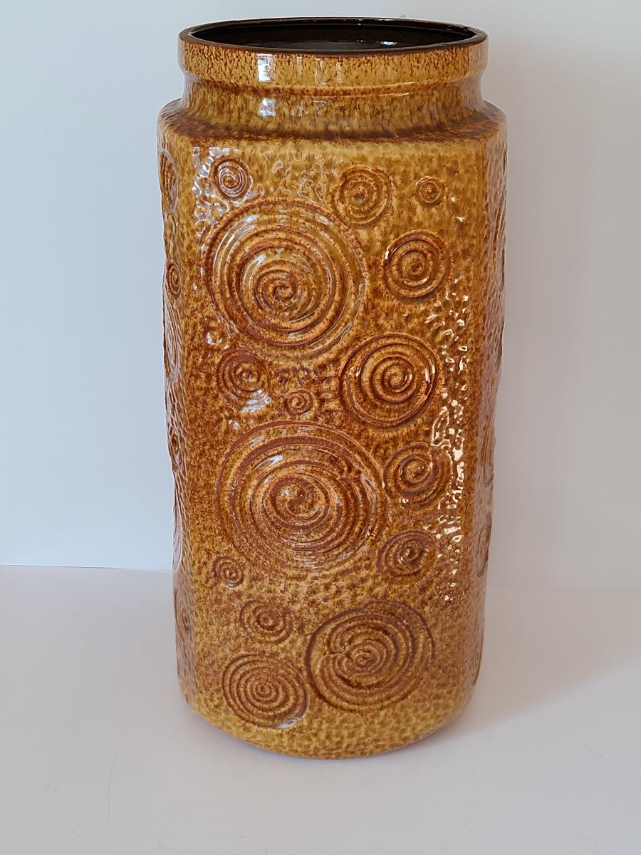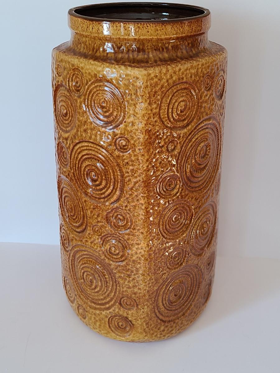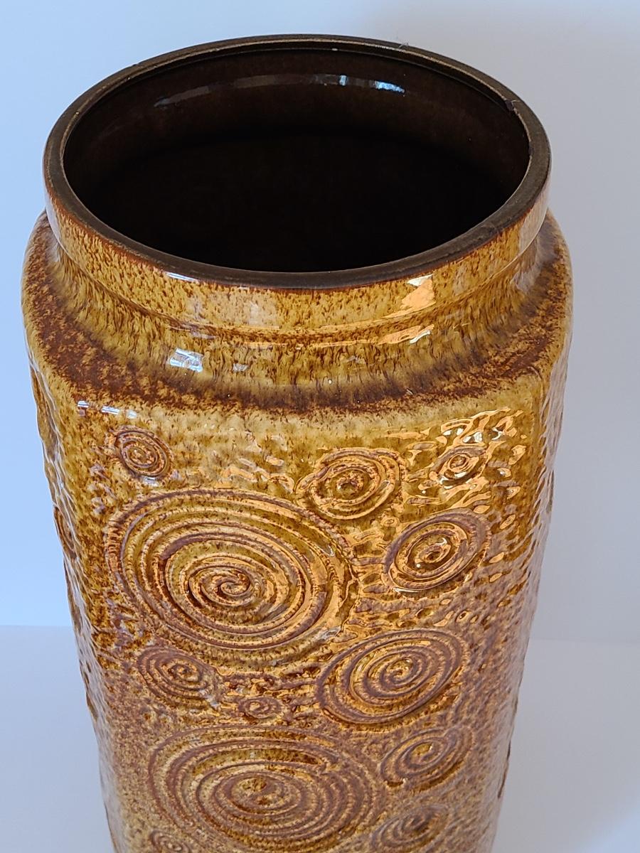 This gorgeous piece was used in the home everyday as an umbrella stand. It is caramel or camel in color. It stands around 20 inches tall. This was taken outside to show the color in natural light. This is marked W Germany on the bottom and most likely is a Scheurich piece in the "Jura" pattern. Amazing piece to find in this size and condition. It does have the smallest nick on the inside edge of vase top. Pictures taken from every angle. Please see all pictures as they are the best representation of the items. The pictures show condition, measurements if taken, and what is included in the lot. Due to the large amount that we photograph and the time frame, we are not always able to take measurements. All items unless noted, are pre-owned and have been used. If you purchased furniture, you must bring help. We do not allow one person to carry large furniture out on their own. Bring help, tools and a truck for the safety of our client’s homes, and your personal safety. Any damages that result to the property including walls, and floors due to moving of the furniture will be charged to the buyer. Company policy. Thank you.