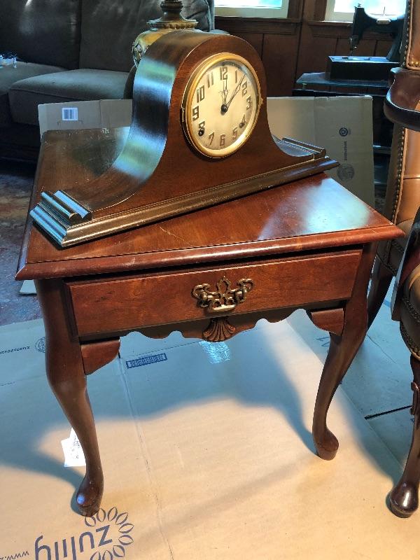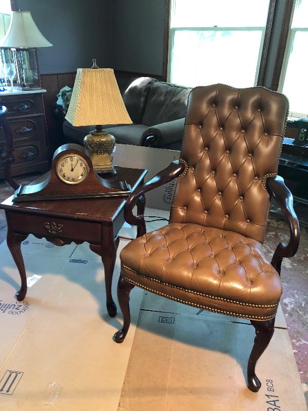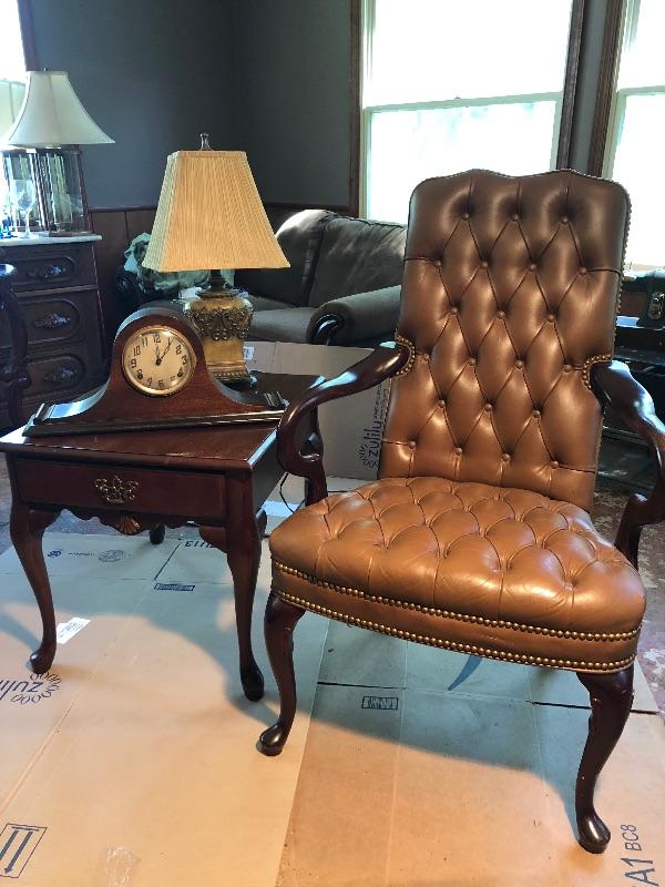 LOT 3 - Leather Chair, Side Table, Lamp & Ingaham Mantel Clock