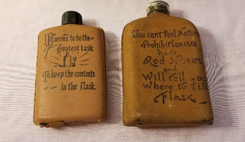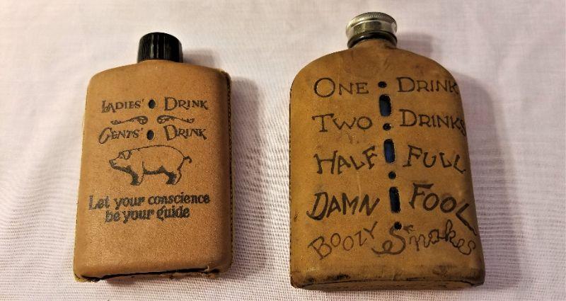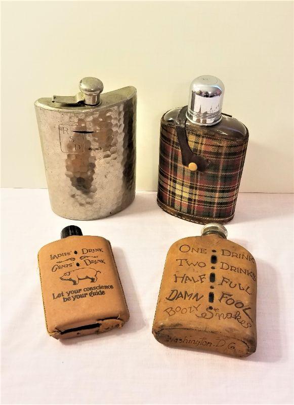 Nice lot of antique/vintage personal flasks. Silverplate flask, initials "RSD" - 6.5" tall. Tartan covered glass flask - one strap broken - two cool leather covered Prohibition era flasks, as shown - one a smaller "lady's flask" (4.75" tall). The other shows the progression from "One drink" to seeing "Boozy Snakes" (5.5" tall). All in vintage condition.