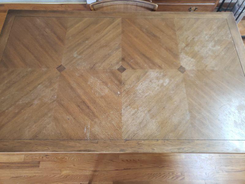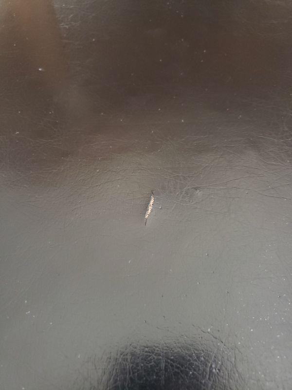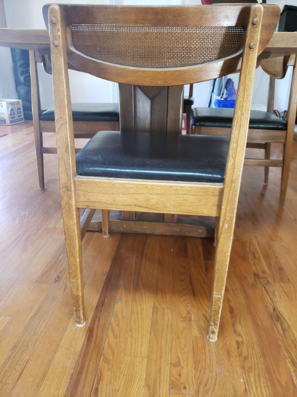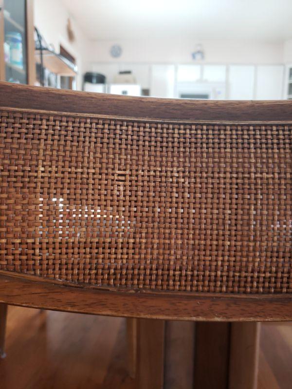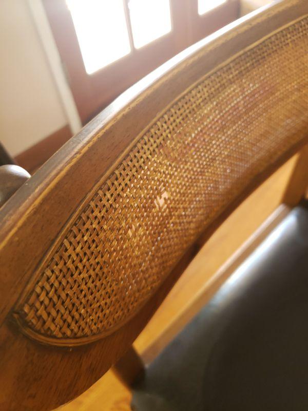 Seats of chairs are black vinyl one has a small tear shown in pics. 2 of the chairs came back have small breakage in the cane and shown in photos. Tabletop also has some surface wear and shown in photos.