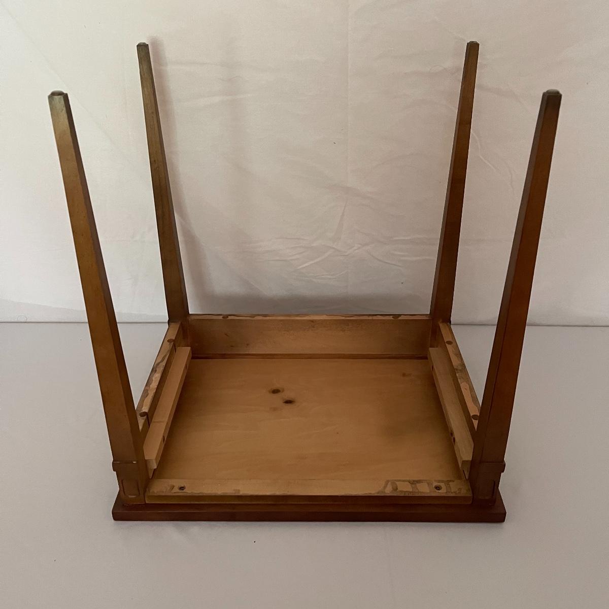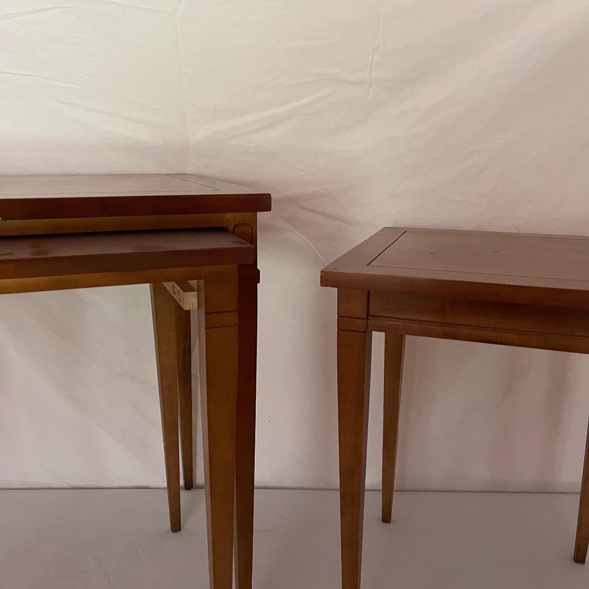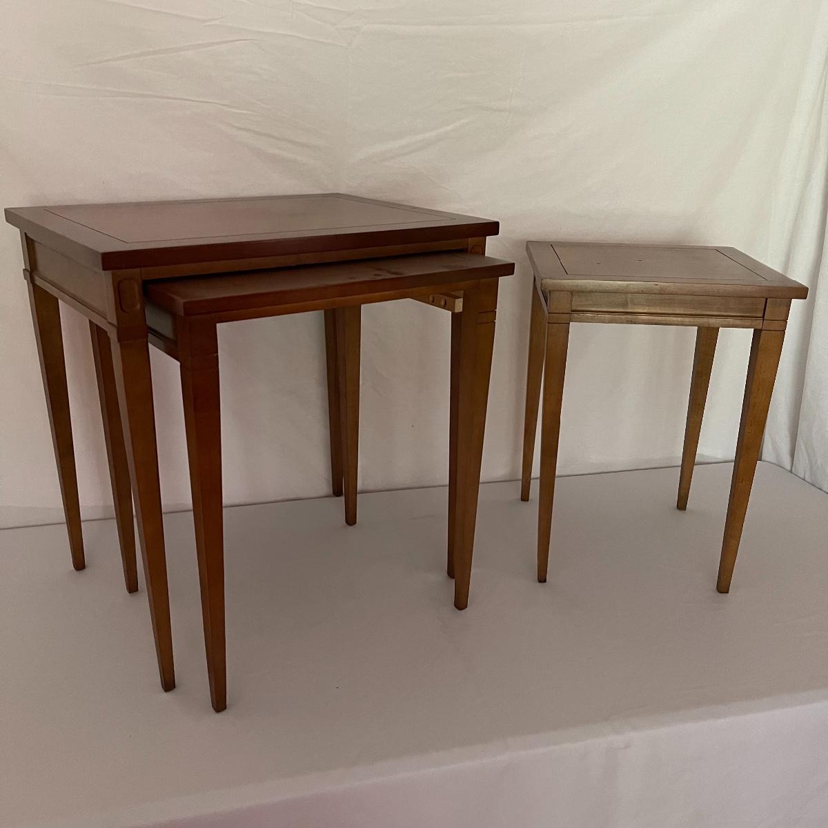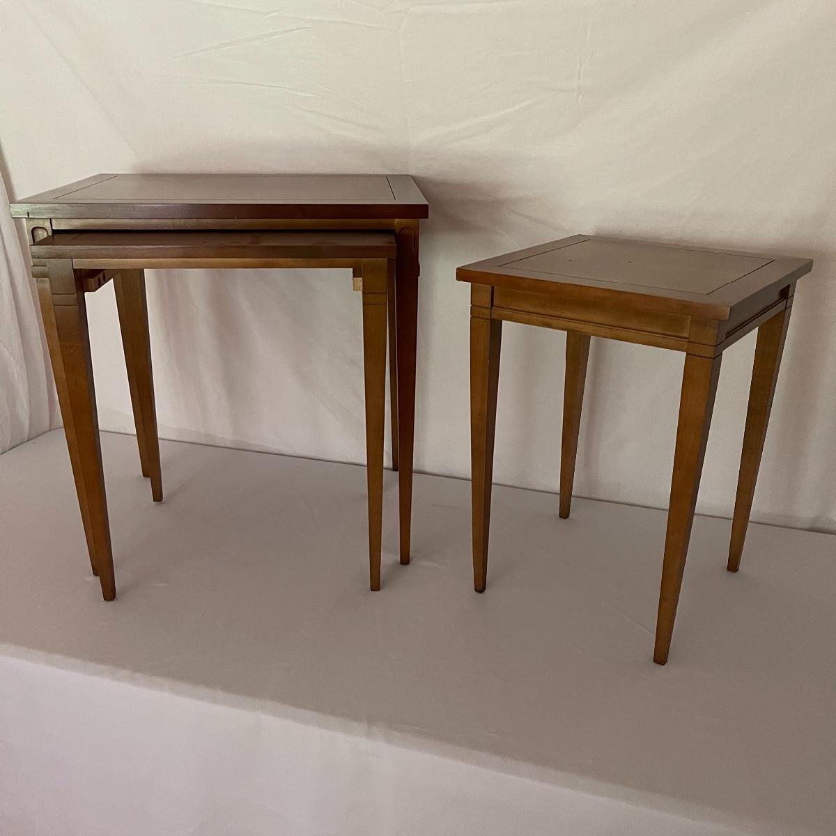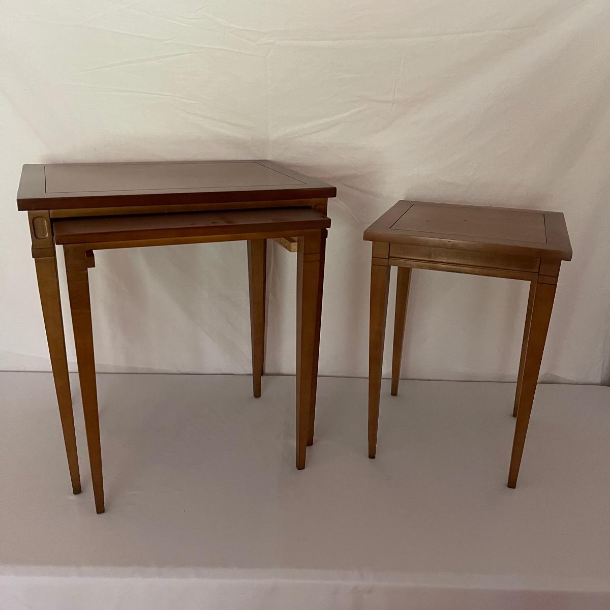 A small square table has been combined with a pair of nesting tables for this lot. The rectangular nesting tables appear to be missing their third and smallest table; the added small square table is a good replacement. The height of the tallest table is 23 inches.