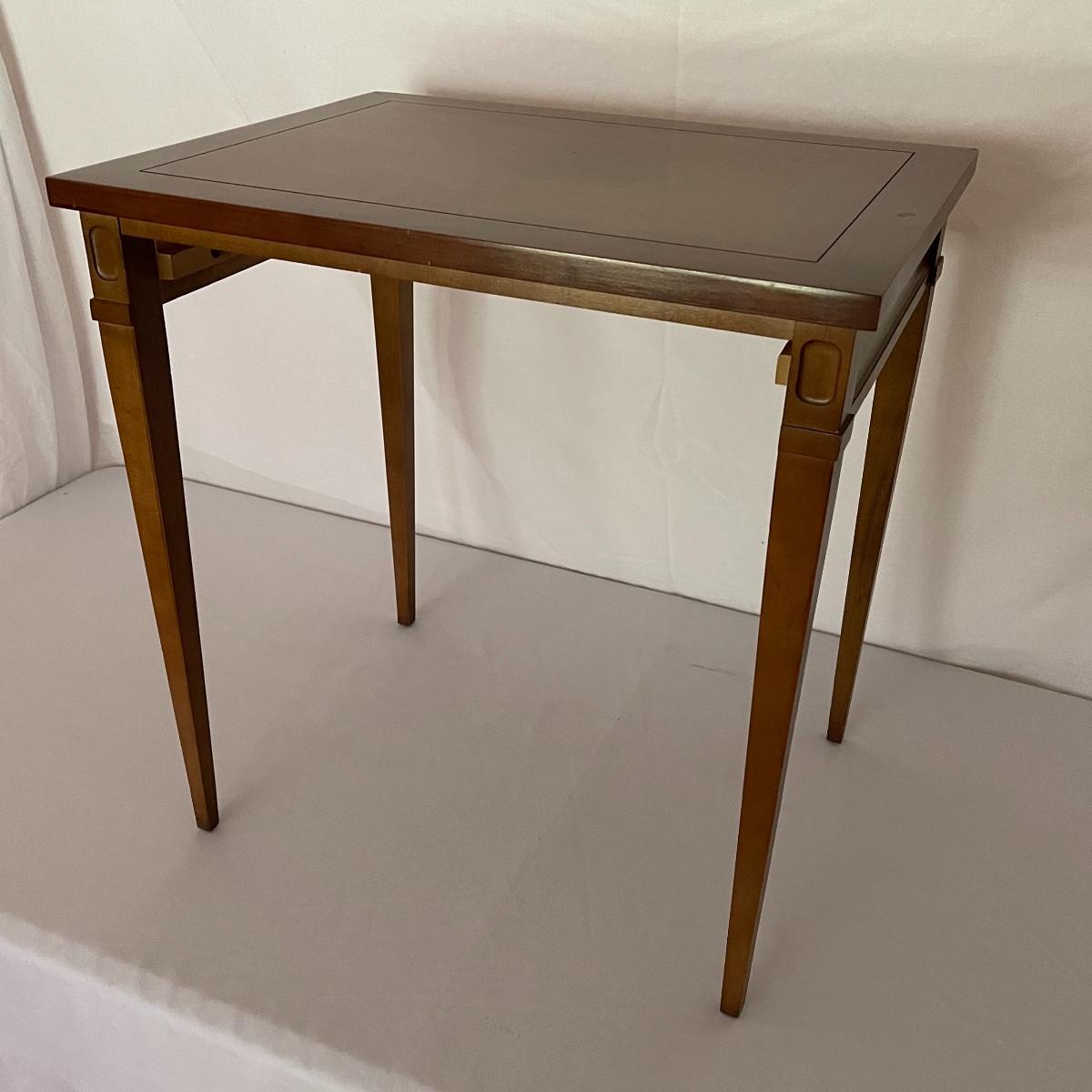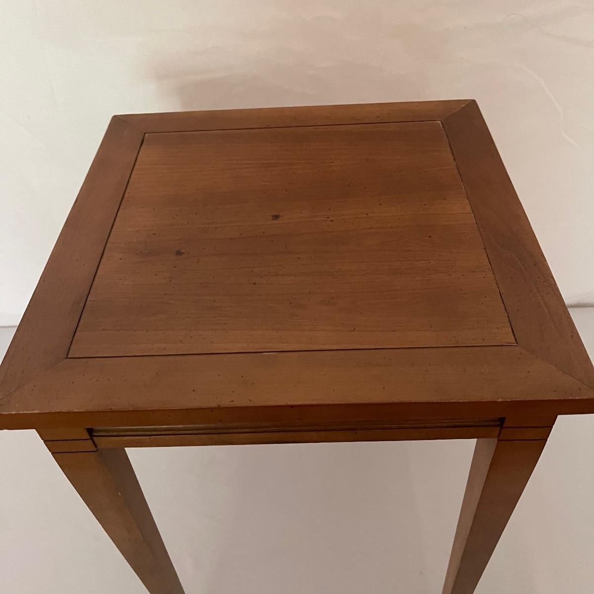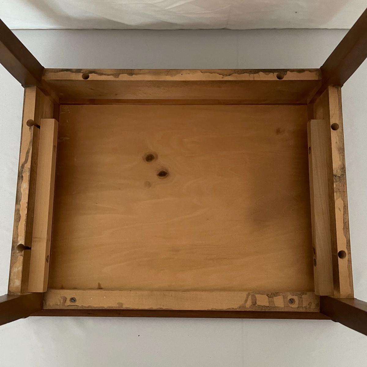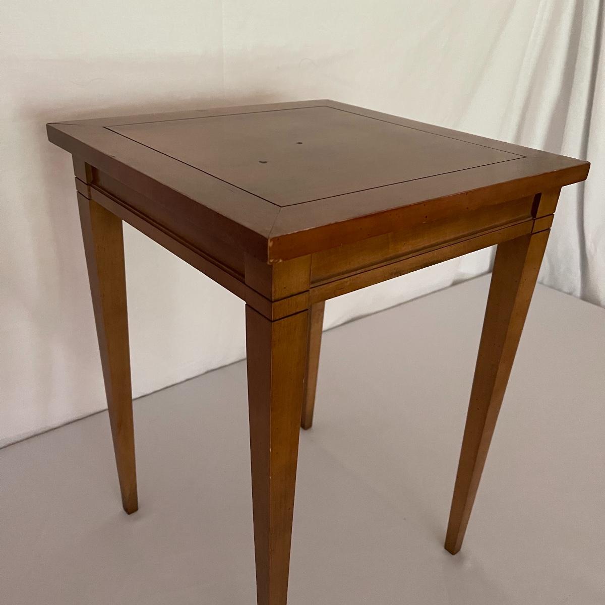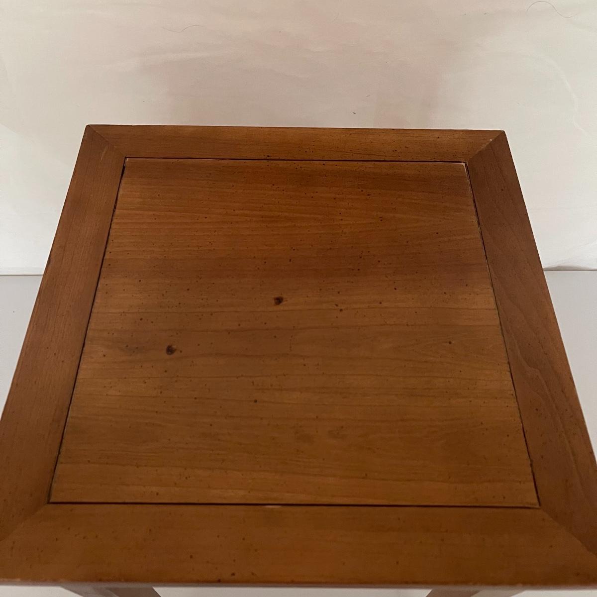 A small square table has been combined with a pair of nesting tables for this lot. The rectangular nesting tables appear to be missing their third and smallest table; the added small square table is a good replacement. The height of the tallest table is 23 inches.