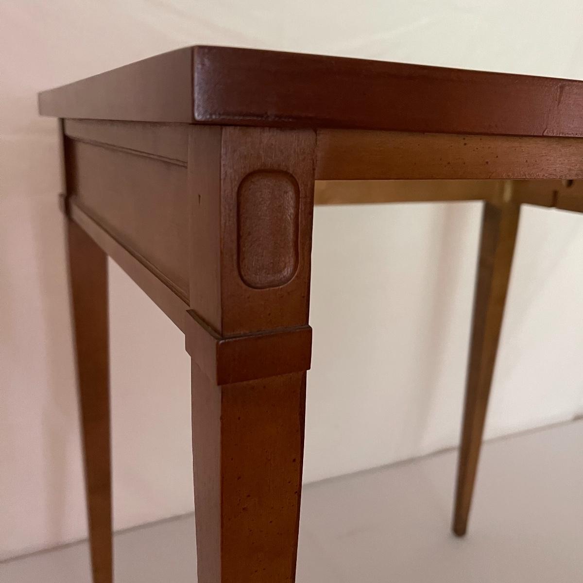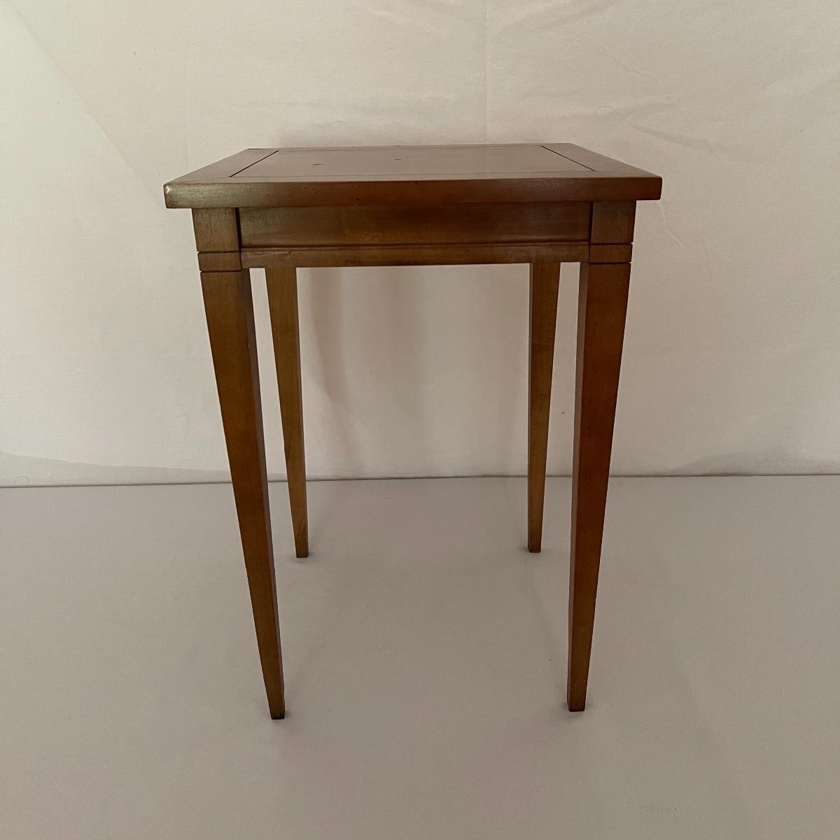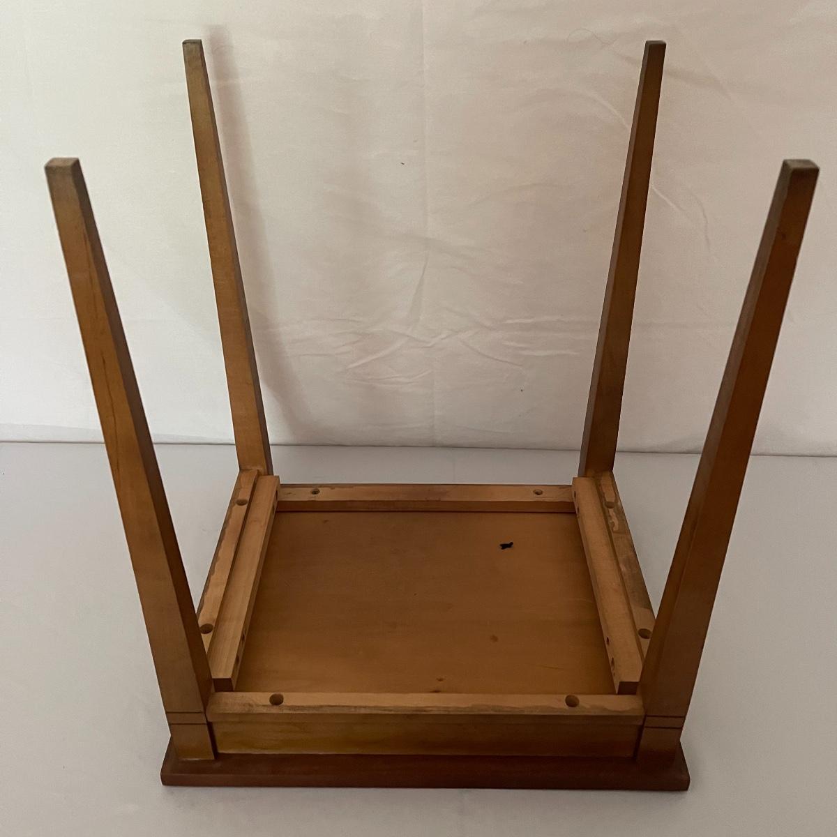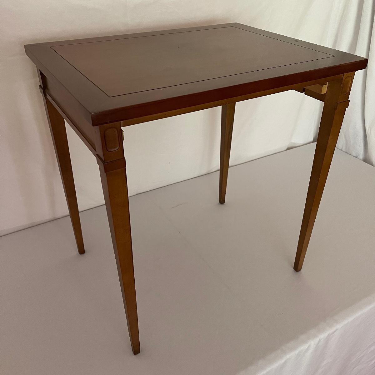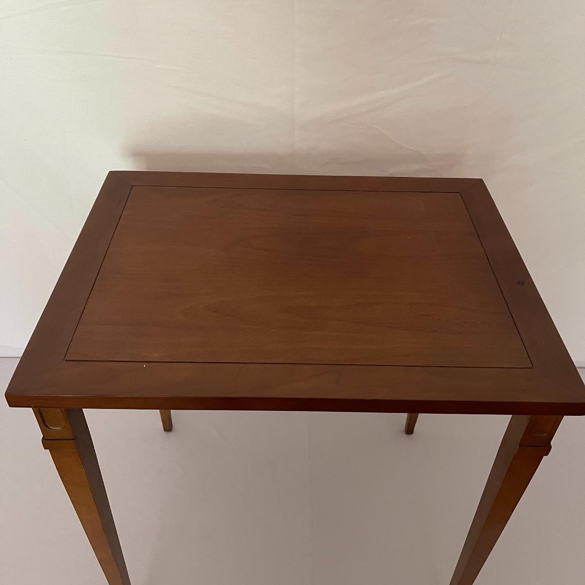 A small square table has been combined with a pair of nesting tables for this lot. The rectangular nesting tables appear to be missing their third and smallest table; the added small square table is a good replacement. The height of the tallest table is 23 inches.