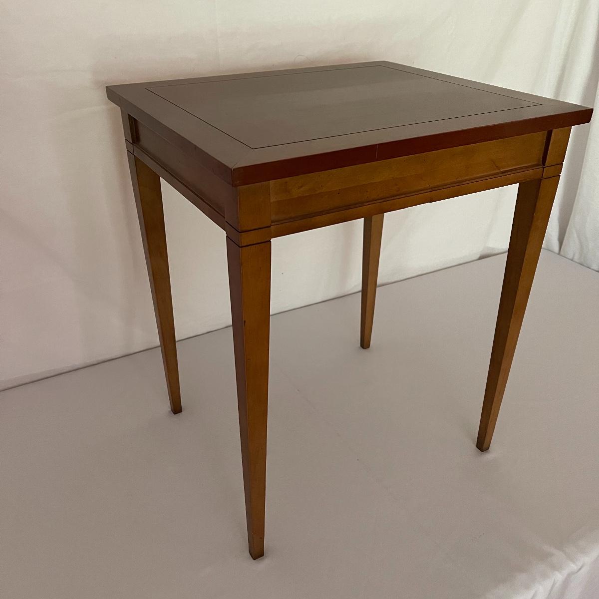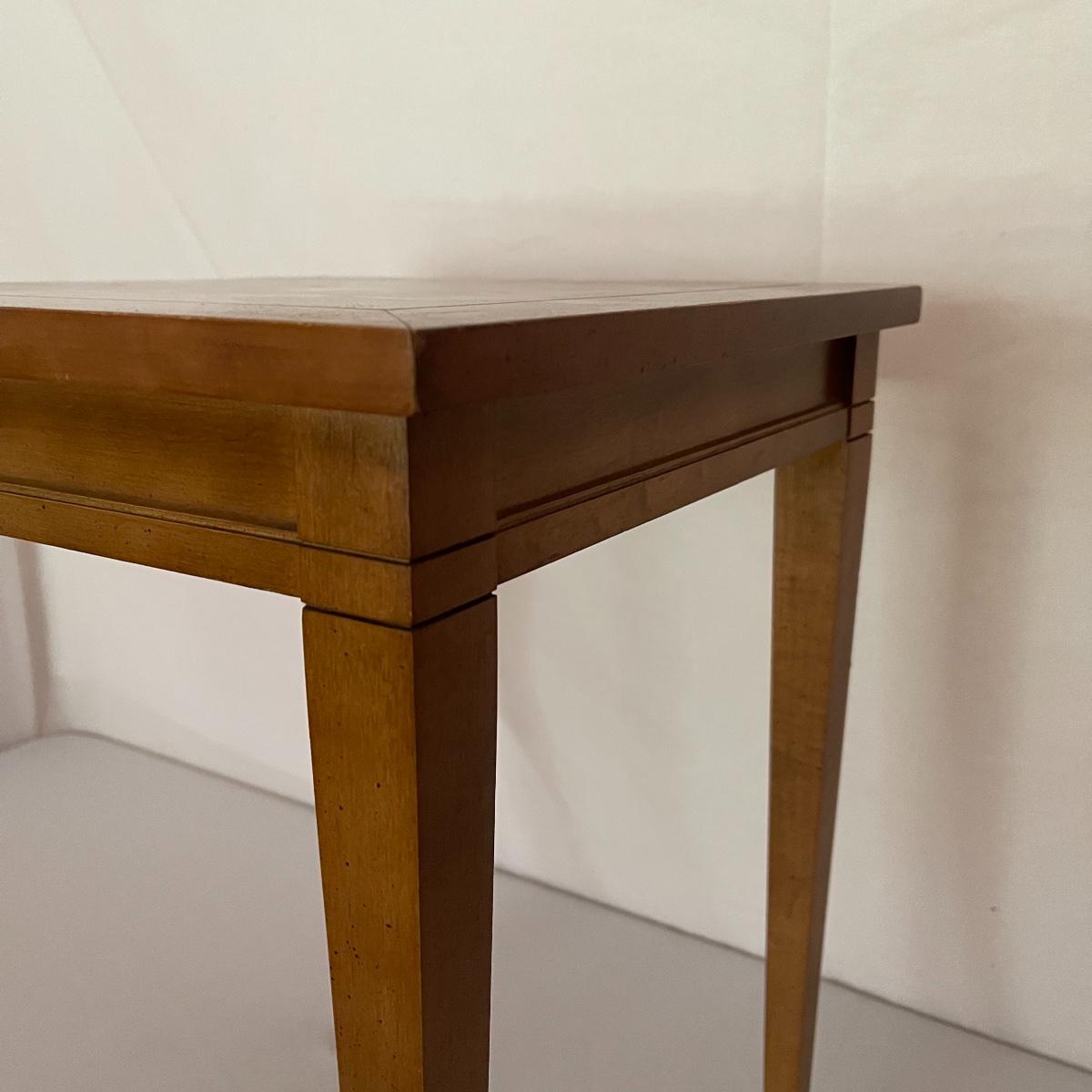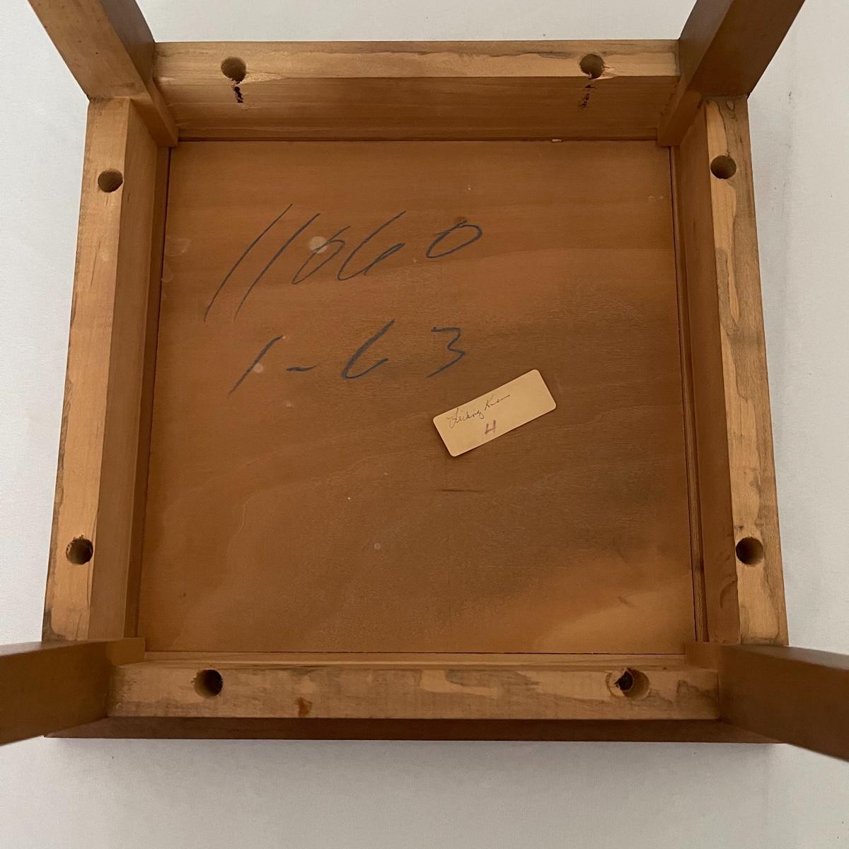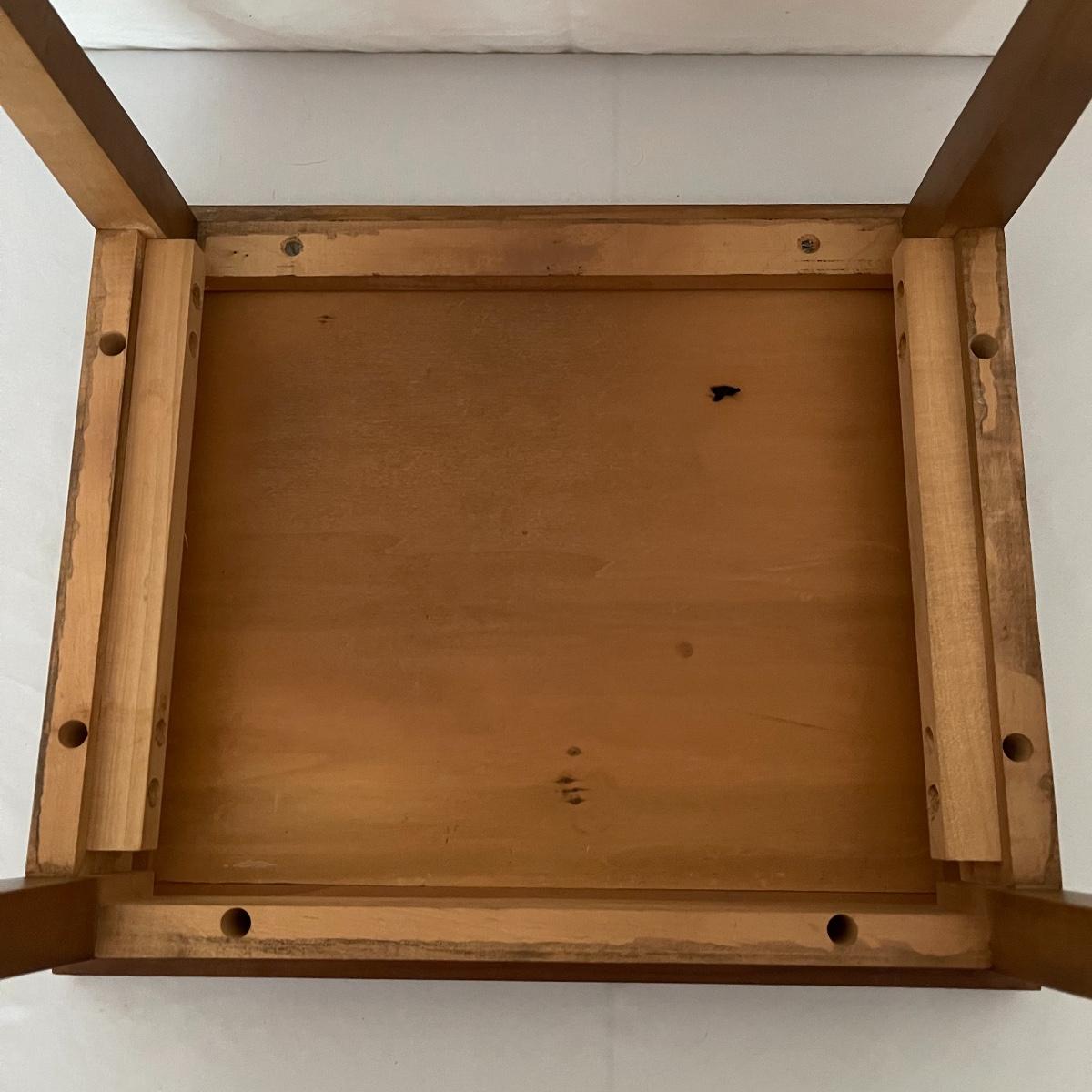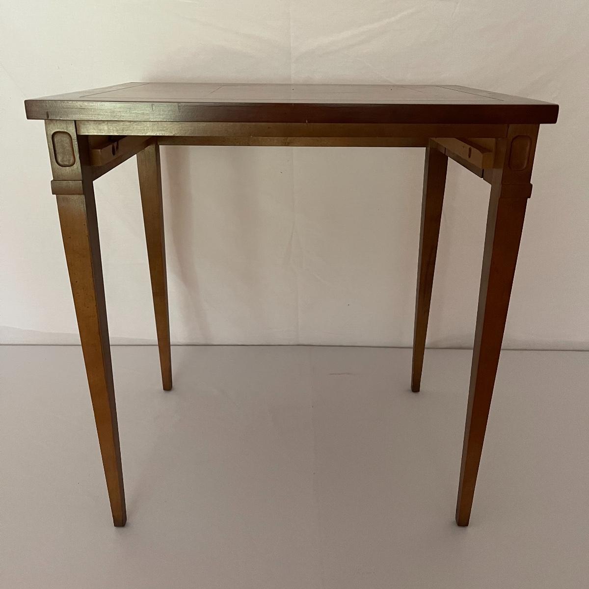 A small square table has been combined with a pair of nesting tables for this lot. The rectangular nesting tables appear to be missing their third and smallest table; the added small square table is a good replacement. The height of the tallest table is 23 inches.