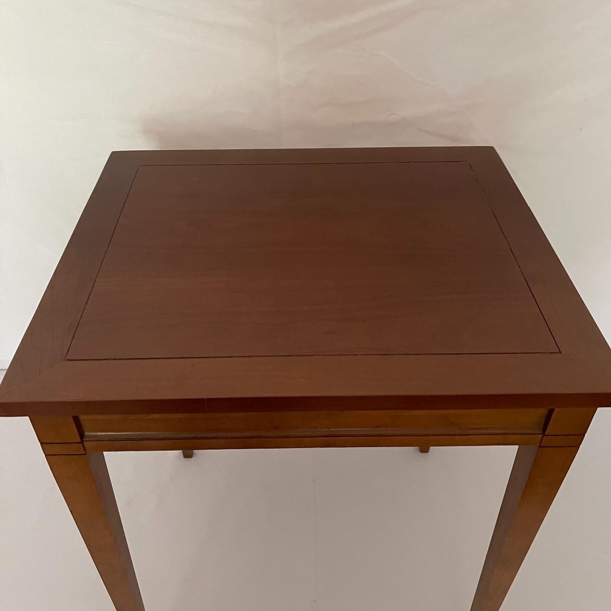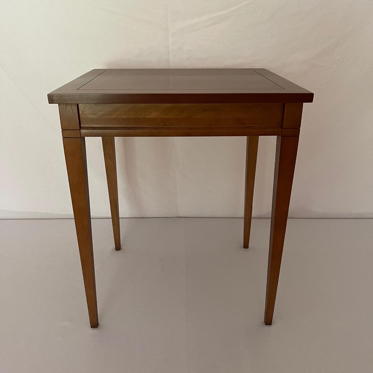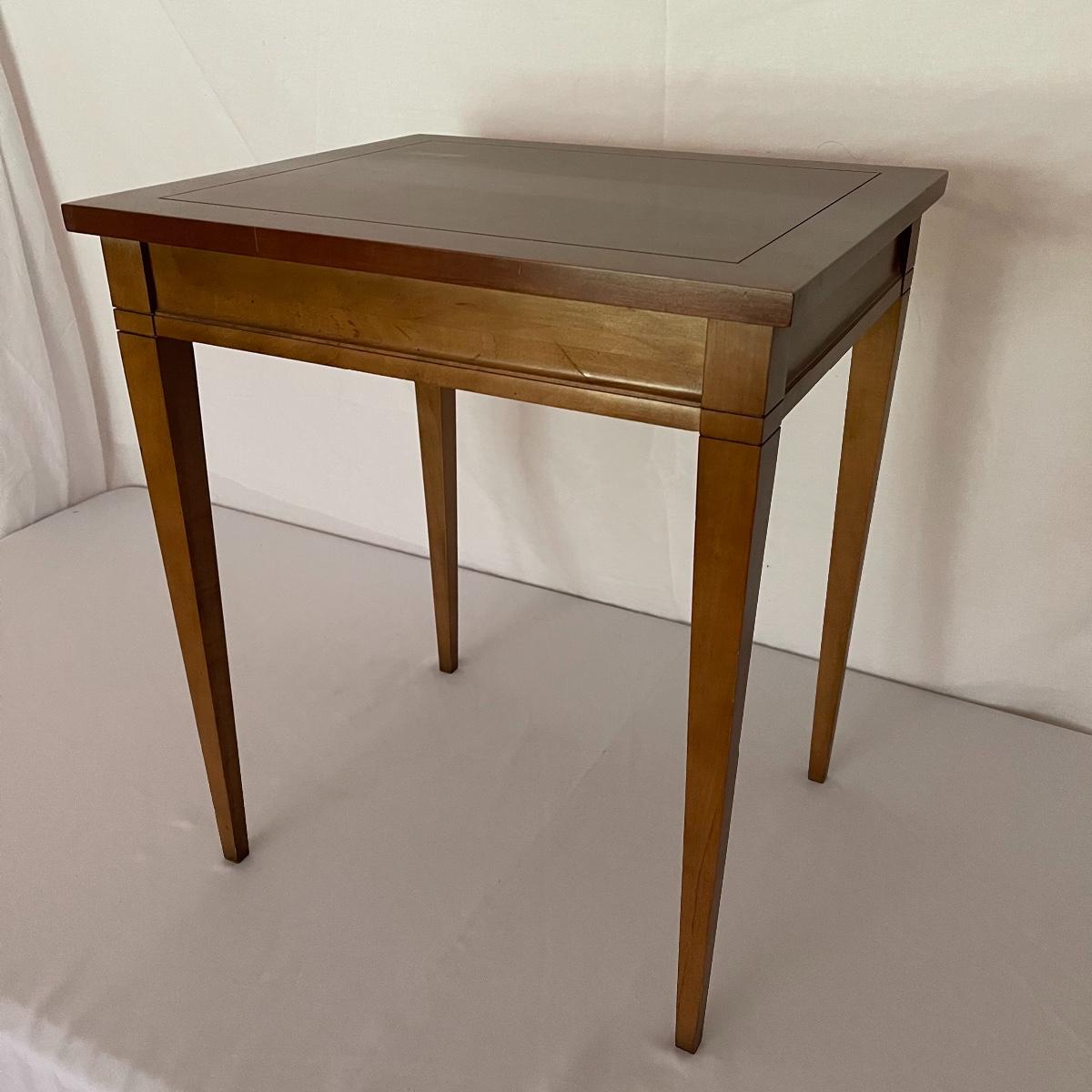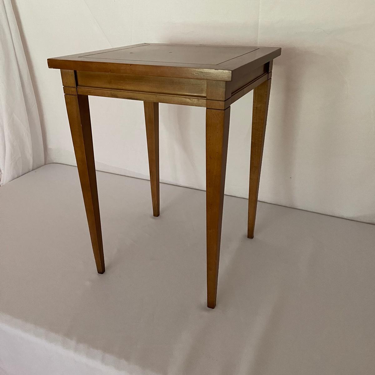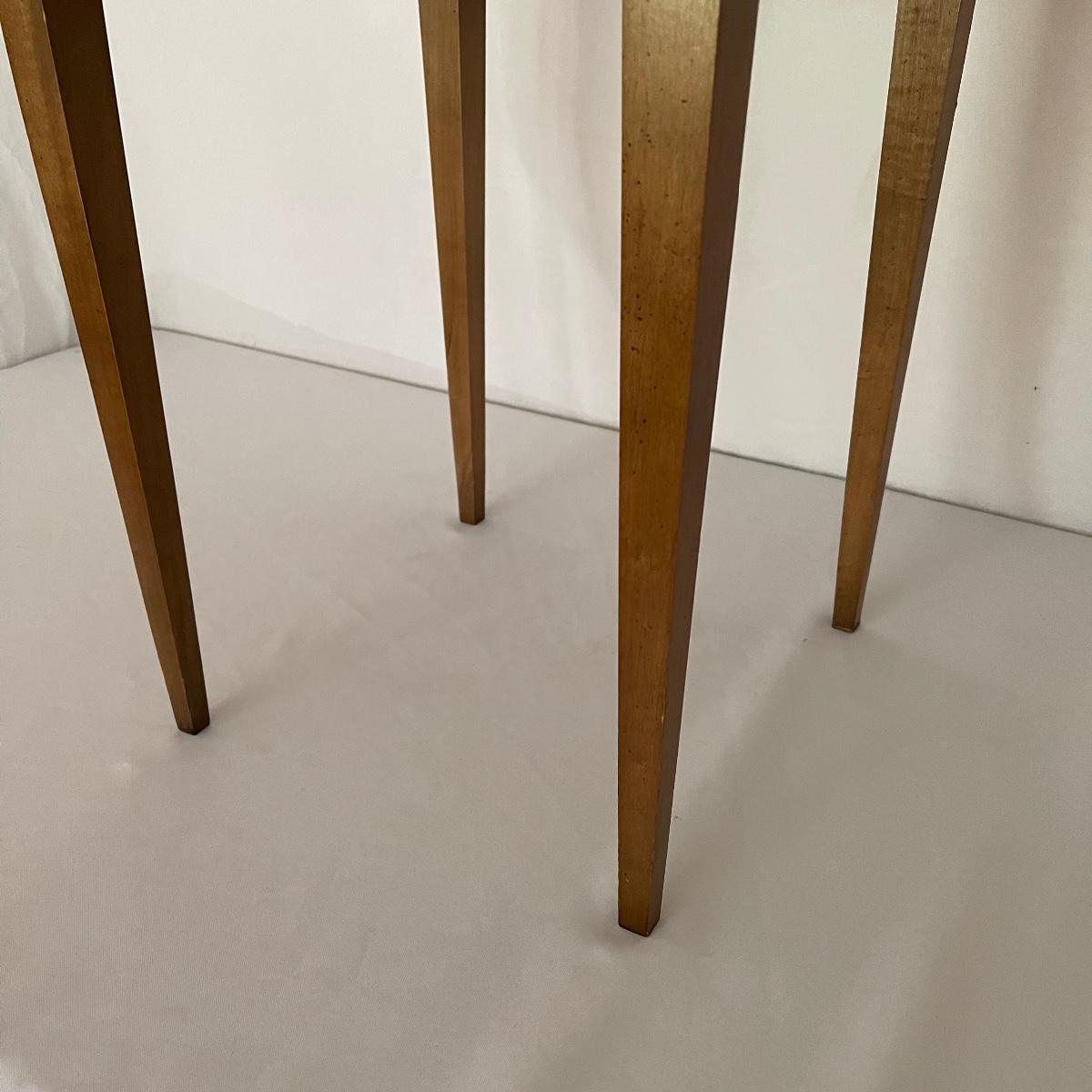 A small square table has been combined with a pair of nesting tables for this lot. The rectangular nesting tables appear to be missing their third and smallest table; the added small square table is a good replacement. The height of the tallest table is 23 inches.