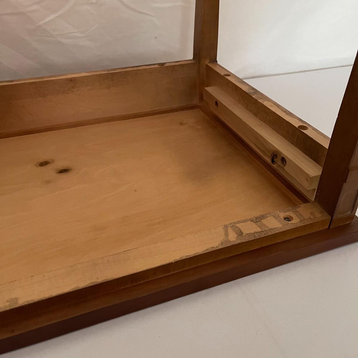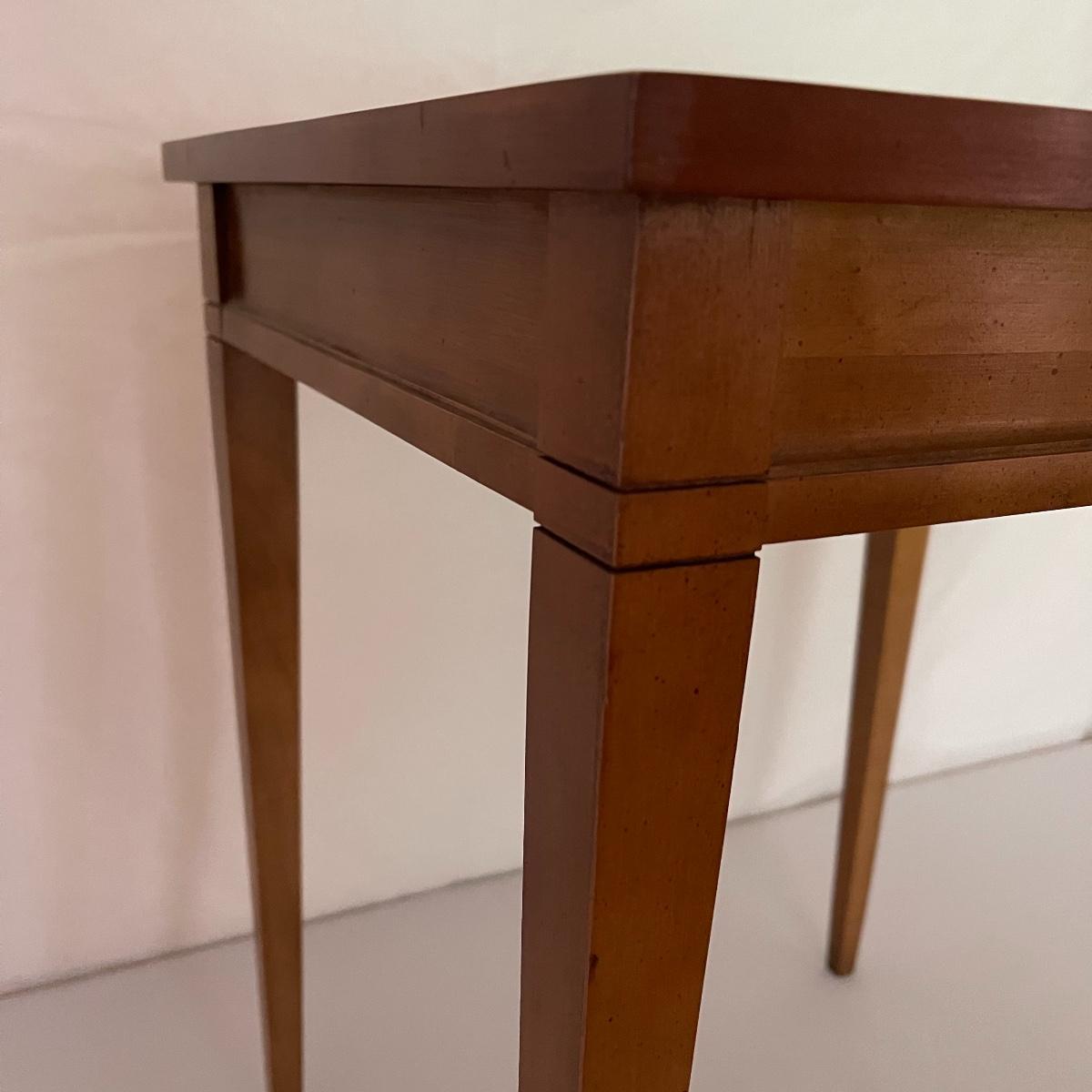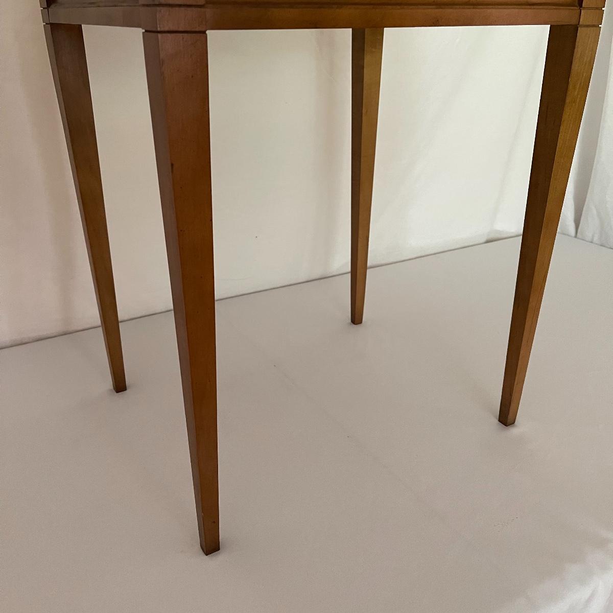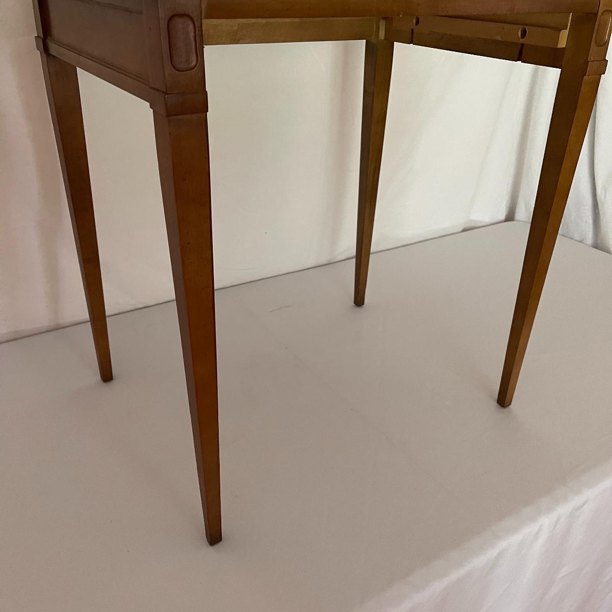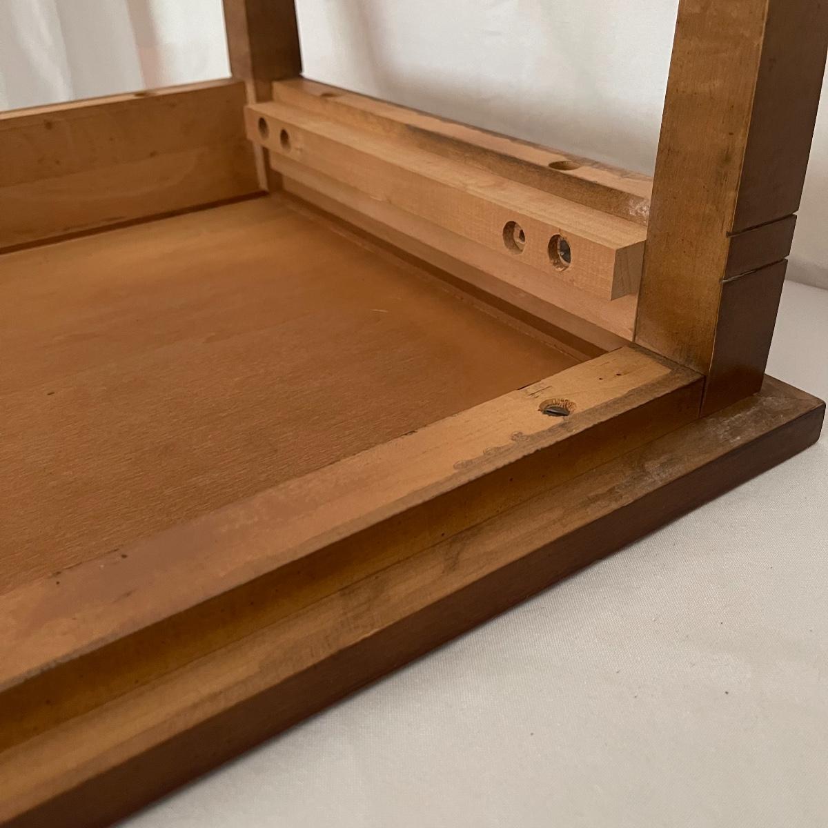 A small square table has been combined with a pair of nesting tables for this lot. The rectangular nesting tables appear to be missing their third and smallest table; the added small square table is a good replacement. The height of the tallest table is 23 inches.