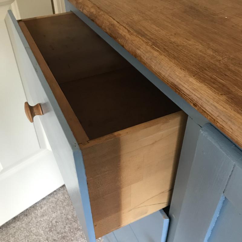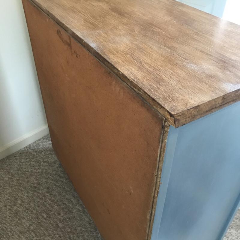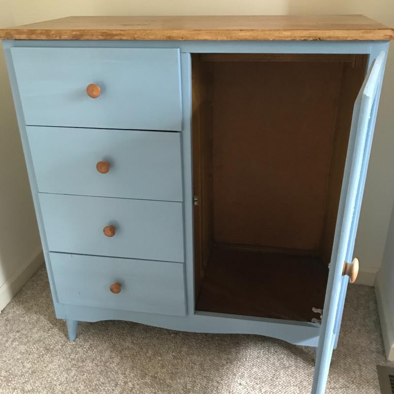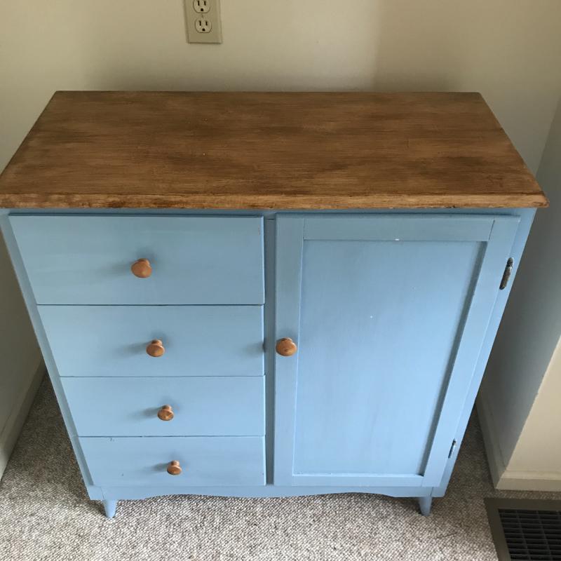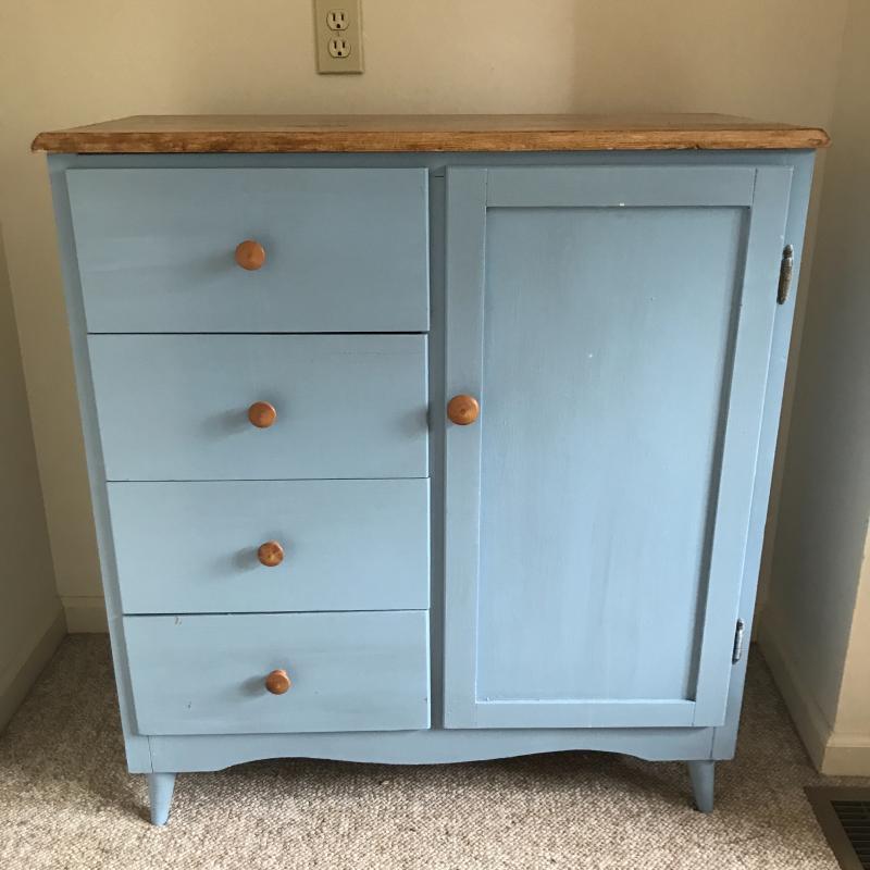 Cute light blue cabinet is great for storage. Measures 34” x 15.5” x 37”. Has open door cabinet and four drawers. Top is painted to look like grain. Nice and sturdy piece. No shipping.
