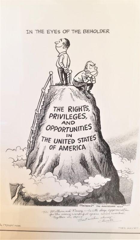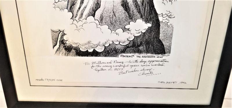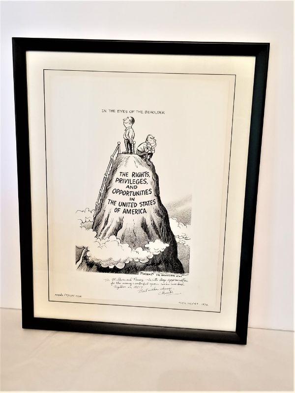 This original cartoon was published in the Birmingham News on 4 July 1972 - "Eye of the Beholder" shows two men on top of a mountain looking out at the "rights, privileges, and opportunities" in the United States. One sees a bright future - the other is a moping Pessimist. Inscribed by the artist to Dr. Calhoun. Nicely framed. Measures 18" x 22.75 inches.