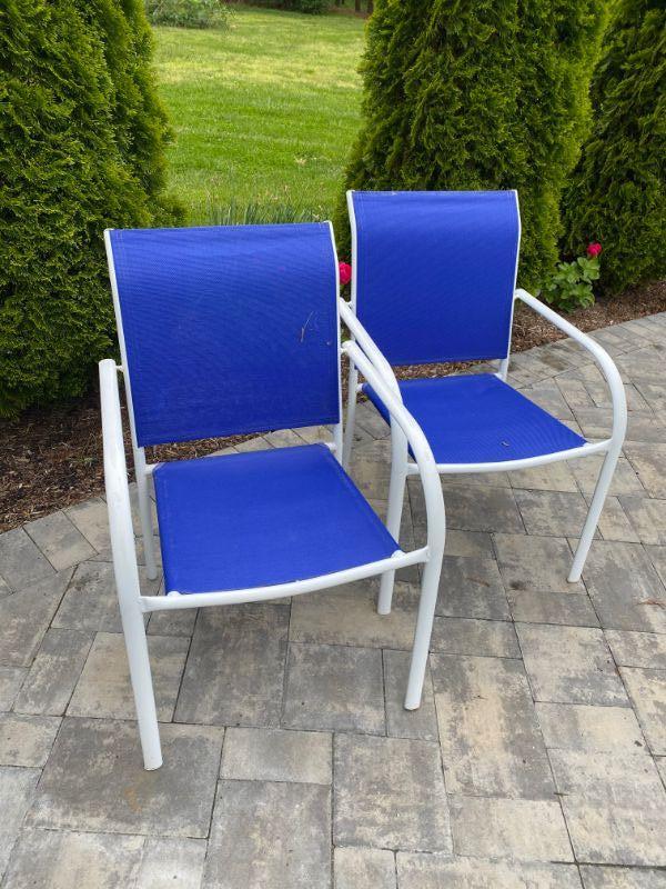 Plexiglass and Metal Table with 6 Royal Blue covered Aluminum chairs