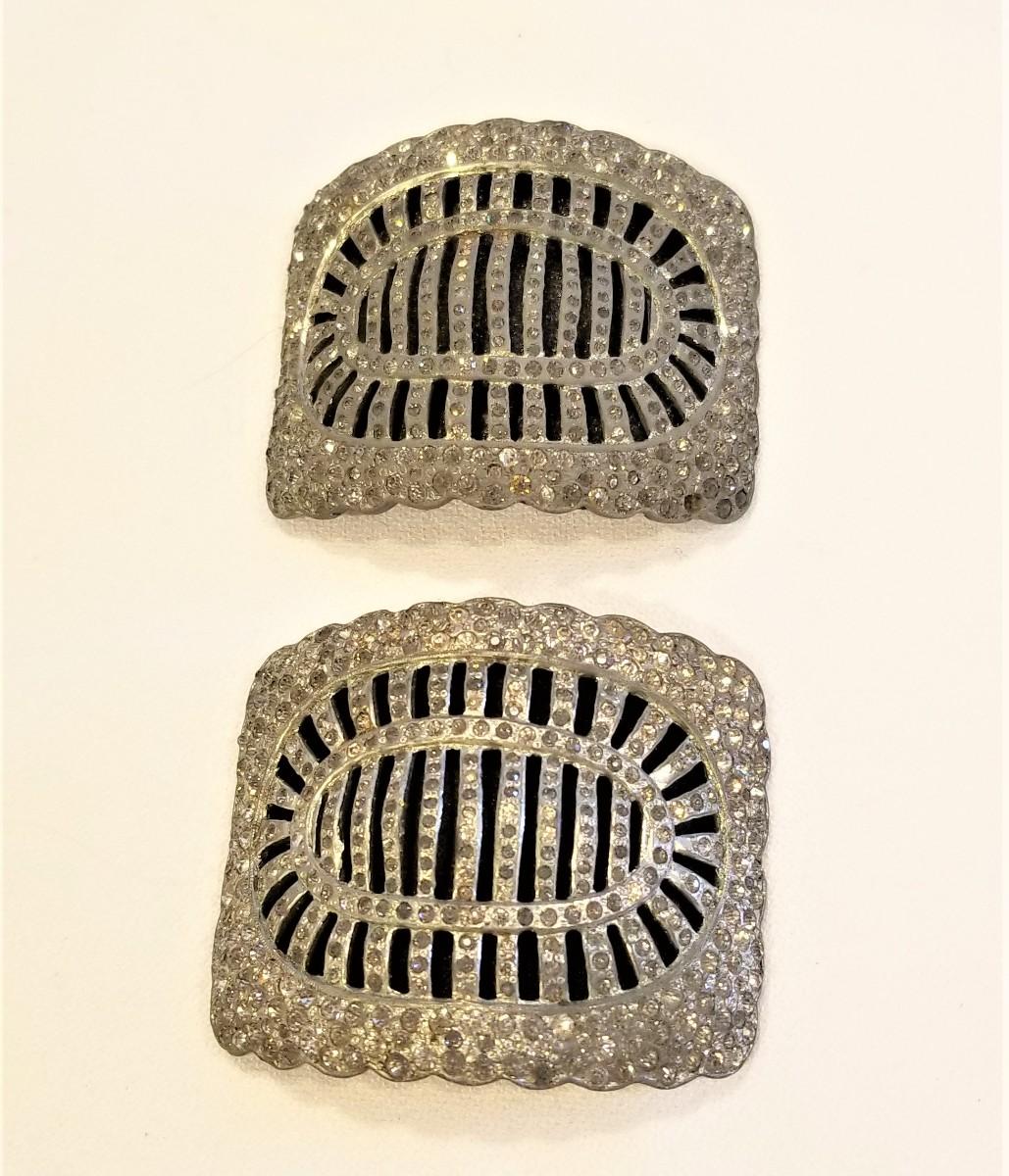 A pair of silverplate paste stones French shoe buckles - ca. 1910-1920 with original leather backings. Each measures 2" x 1.5". A few of the small stones are missing - common with these pieces. Photo does not do them justice - they are very "sparkly".
