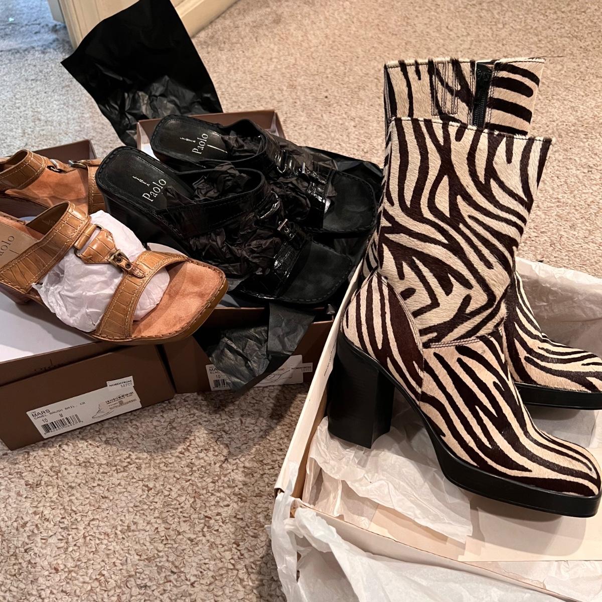 2 pairs Paolo leather shoes and 1 pair Steve Madden boots. Not sure if they’ve been worn or not but they look new and are in original box.