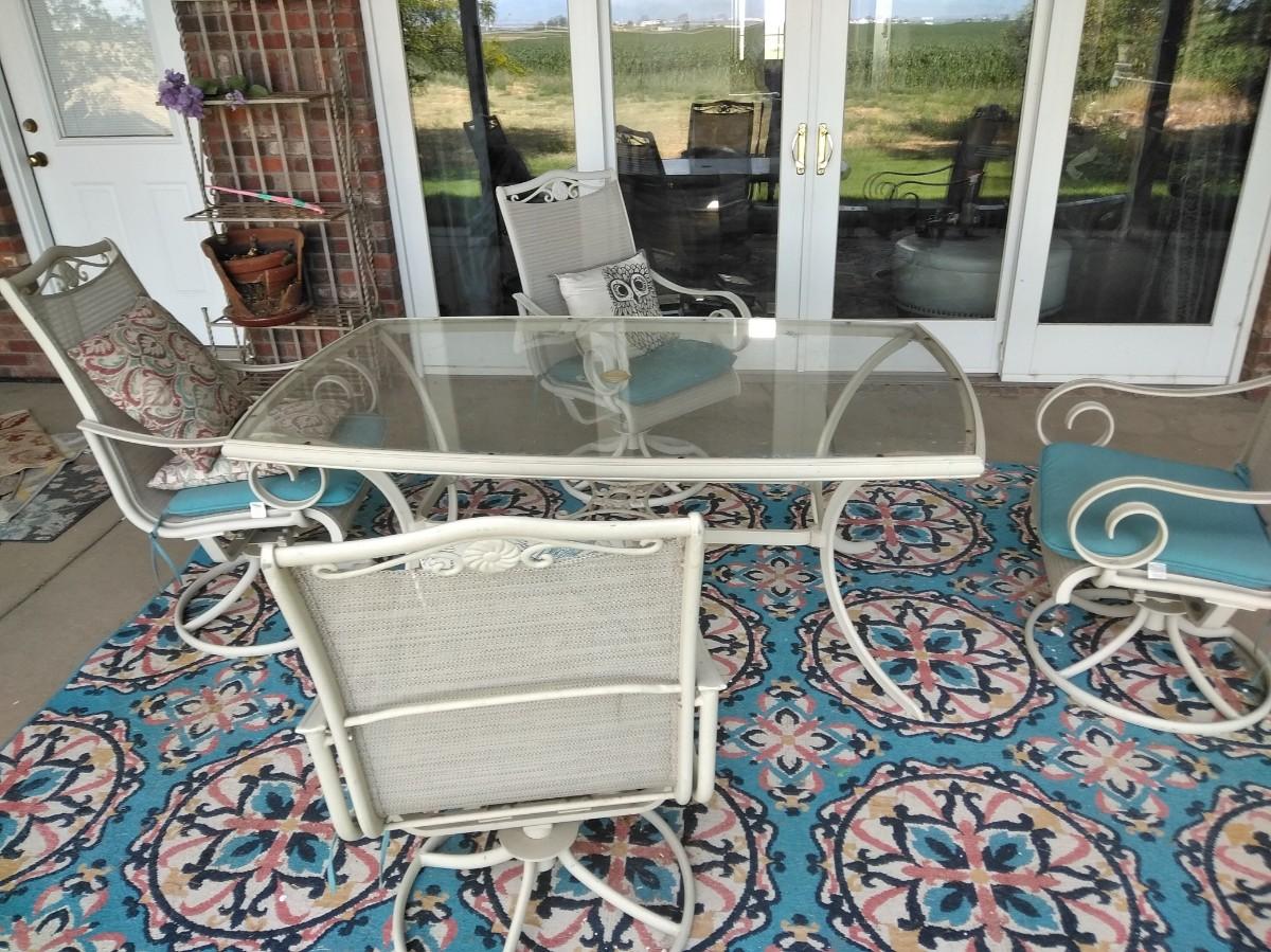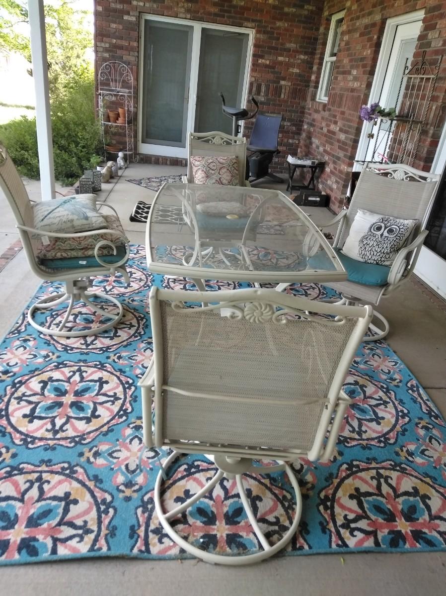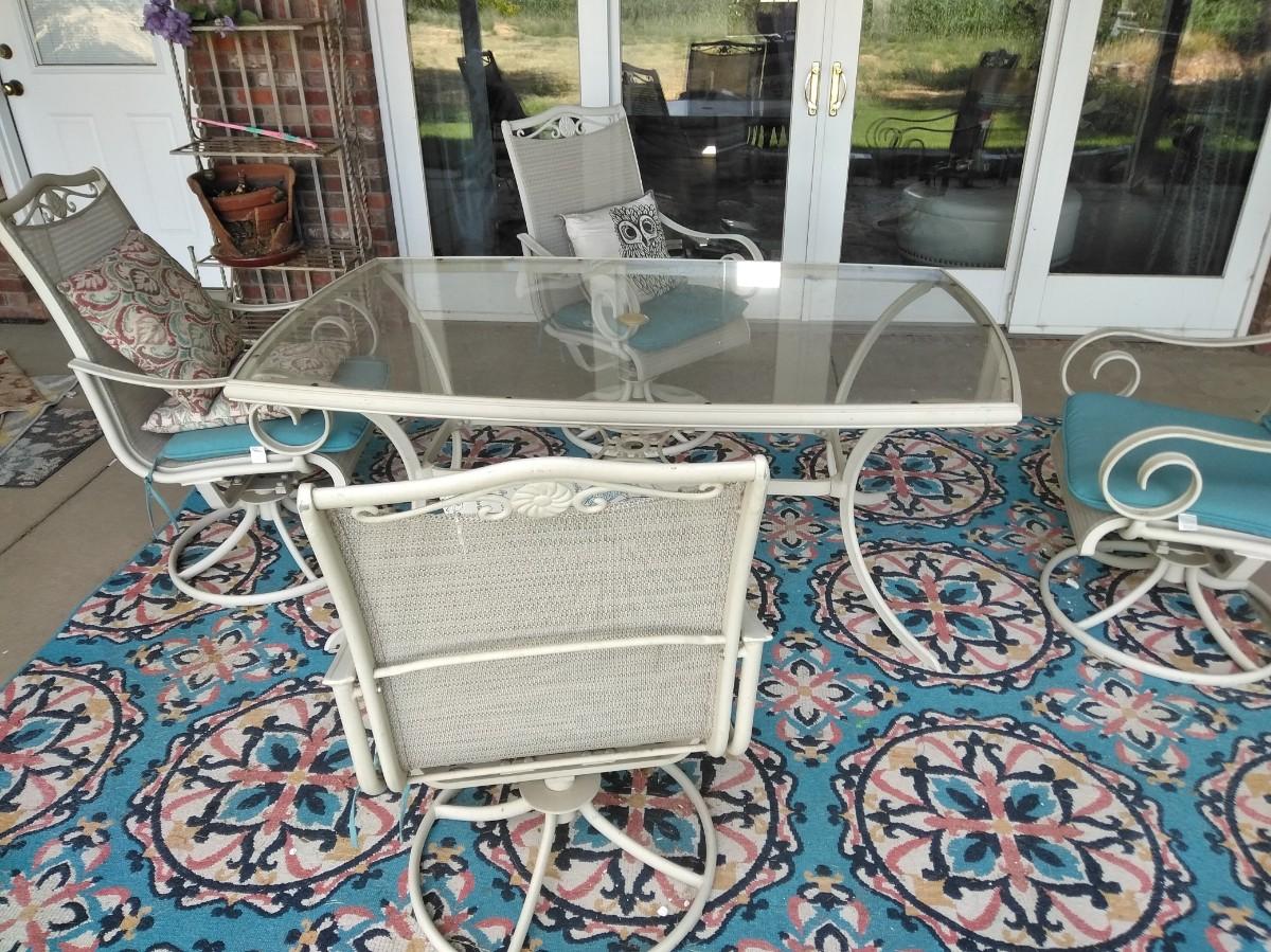 GLASS TOPPED PATIO TABLE WITH UMBRELLA HOLE INCLUDES HOLE PLUG . FOUR SWIVEL ROCKING CHAIRS WITH CUSHIONS TABLE IS 29" X 66" X 39"