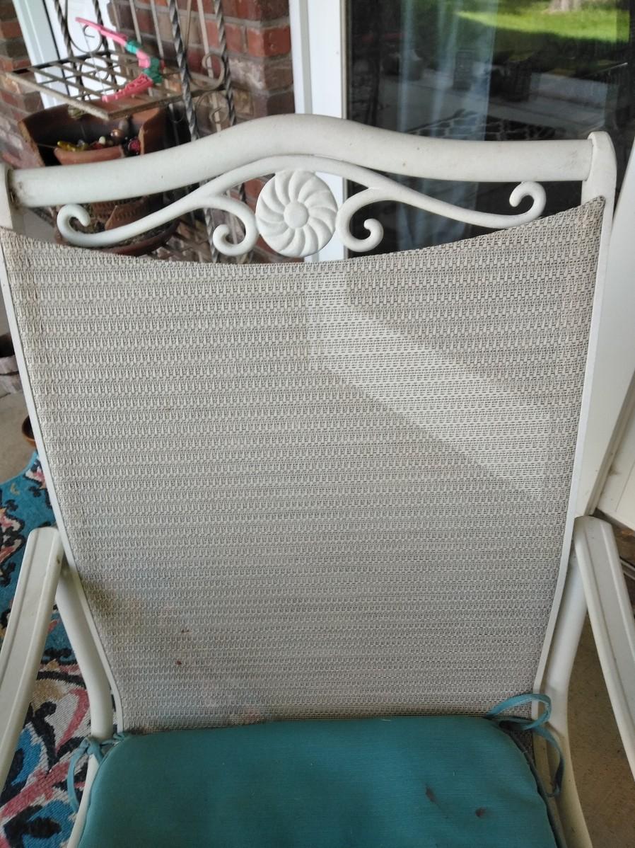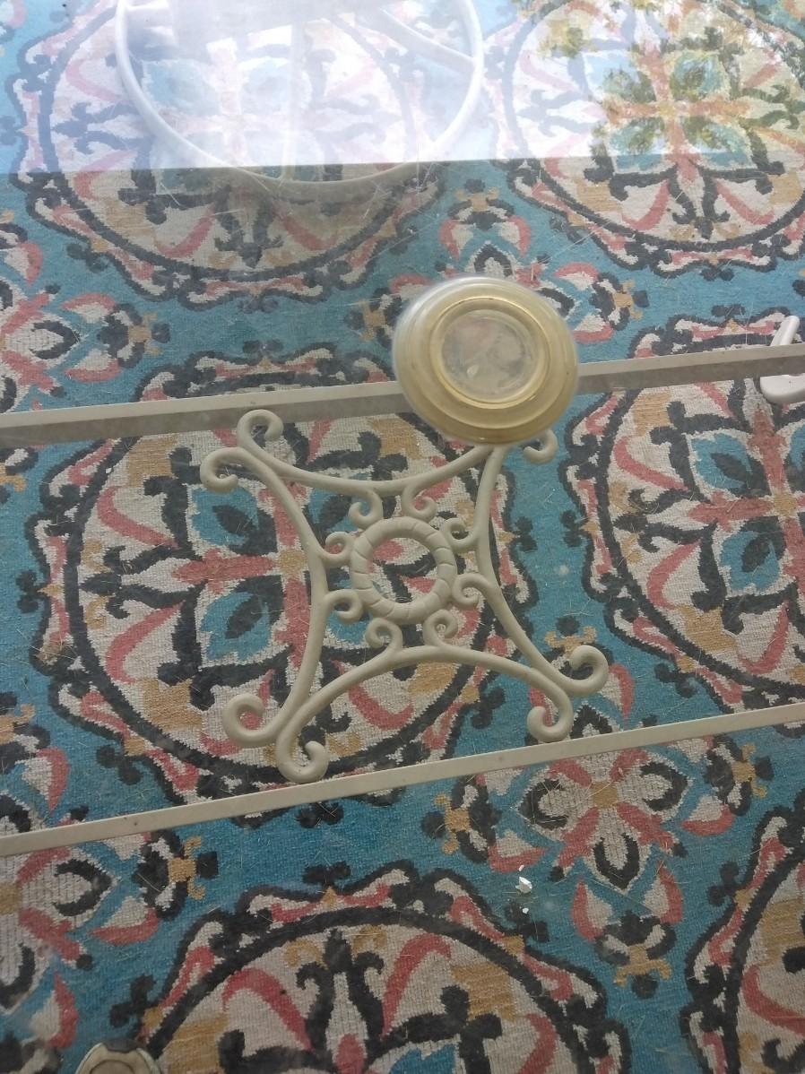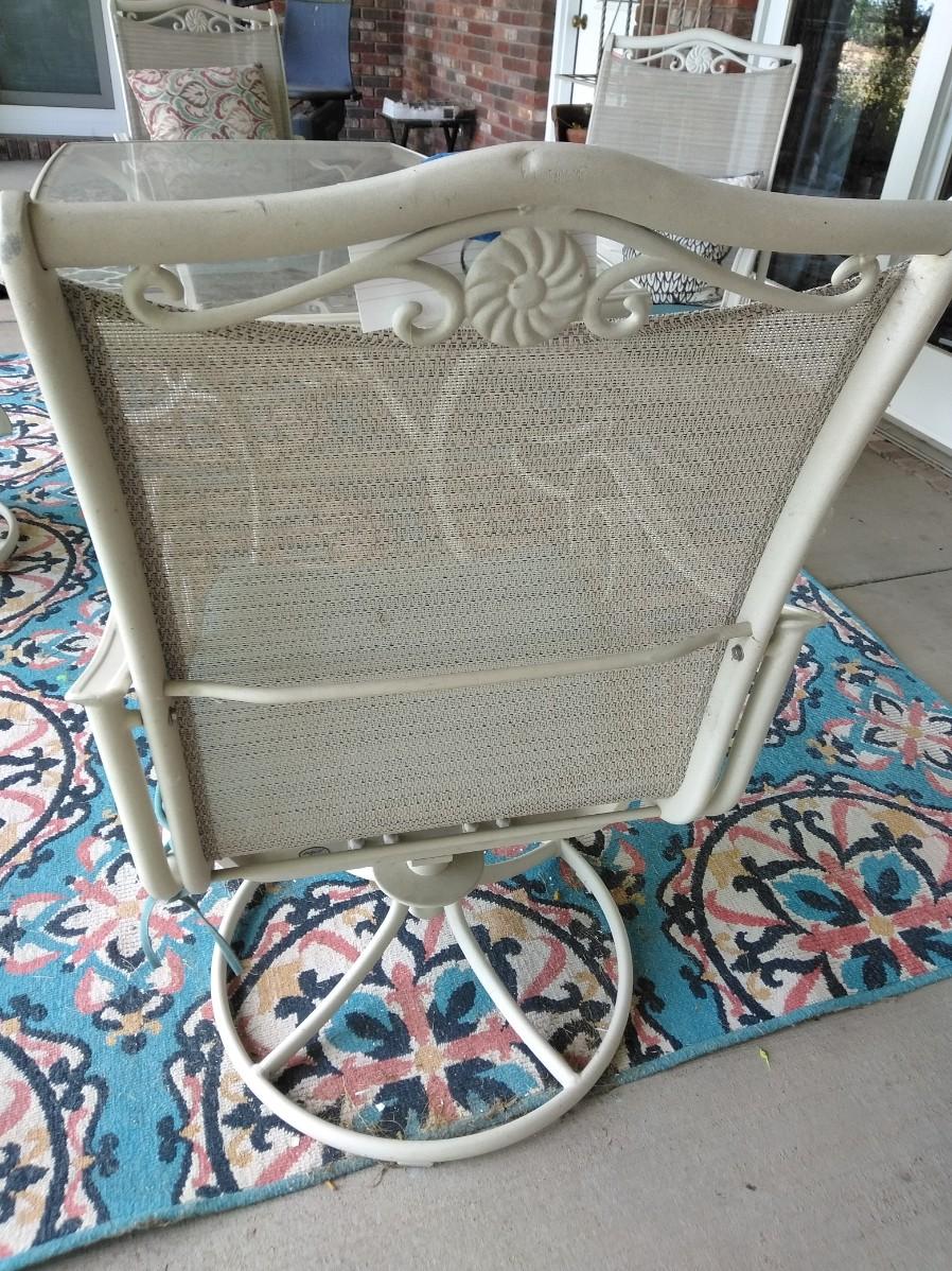 GLASS TOPPED PATIO TABLE WITH UMBRELLA HOLE INCLUDES HOLE PLUG . FOUR SWIVEL ROCKING CHAIRS WITH CUSHIONS TABLE IS 29" X 66" X 39"