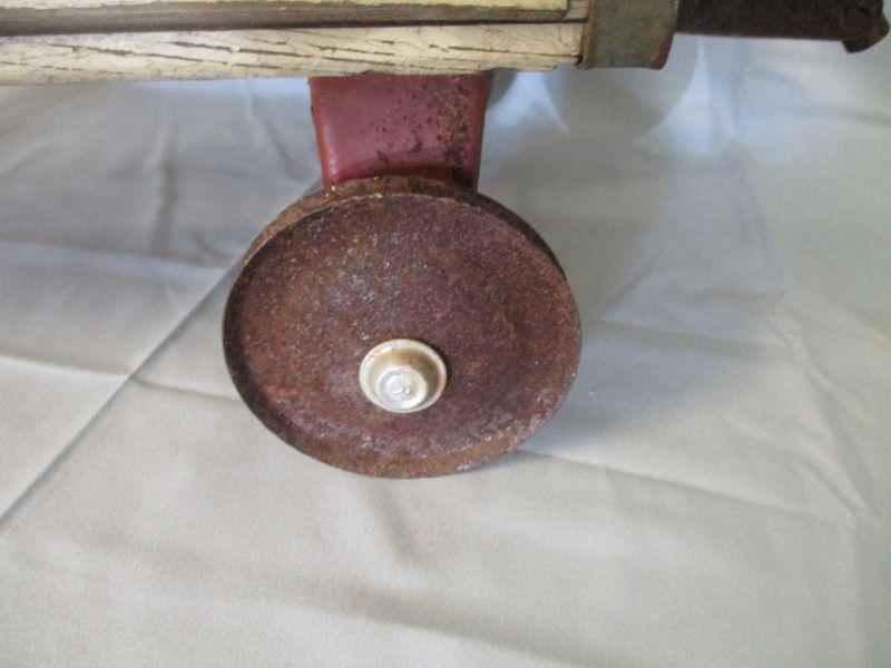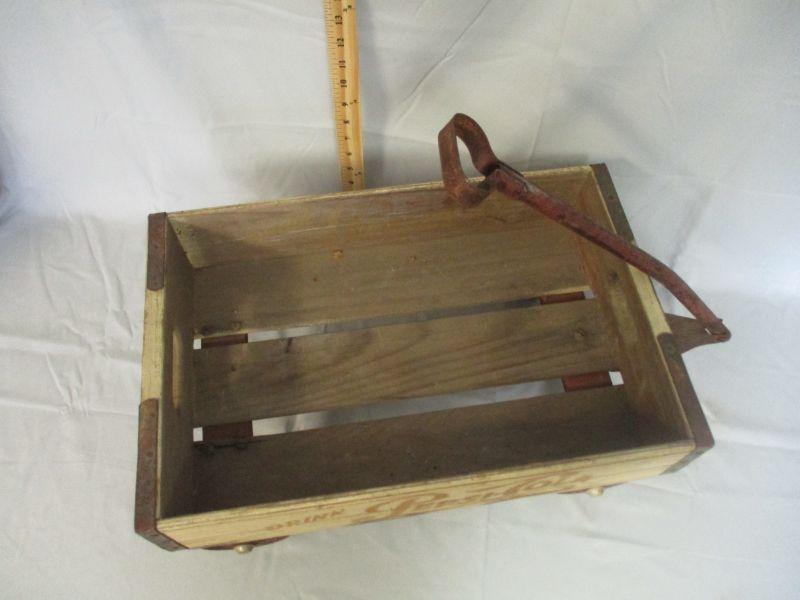 Adorable wood Pepsi soda crate that was transformed into a wagon. The wood crate is in excellent condition and the metal pieces used to make the wagon are rusted, but that looks more natural to the piece than if they were shiny and new. The crate is 18.5" x 12" and has metal bands around the ends to keep the pieces secure.