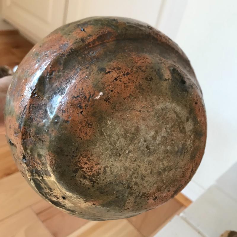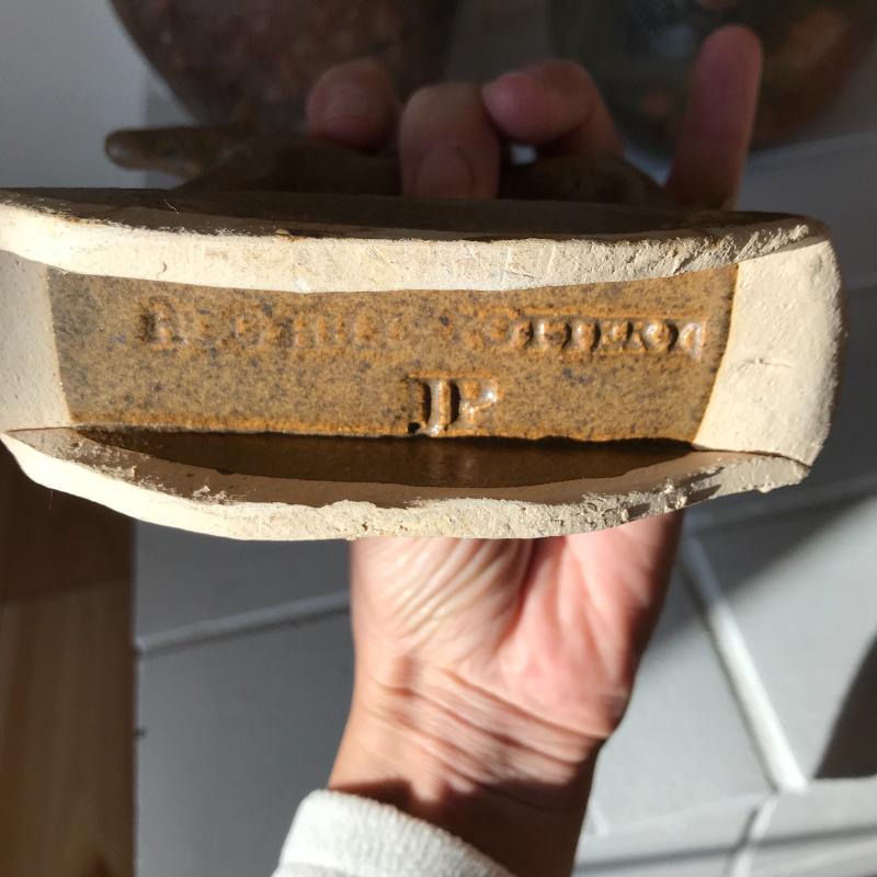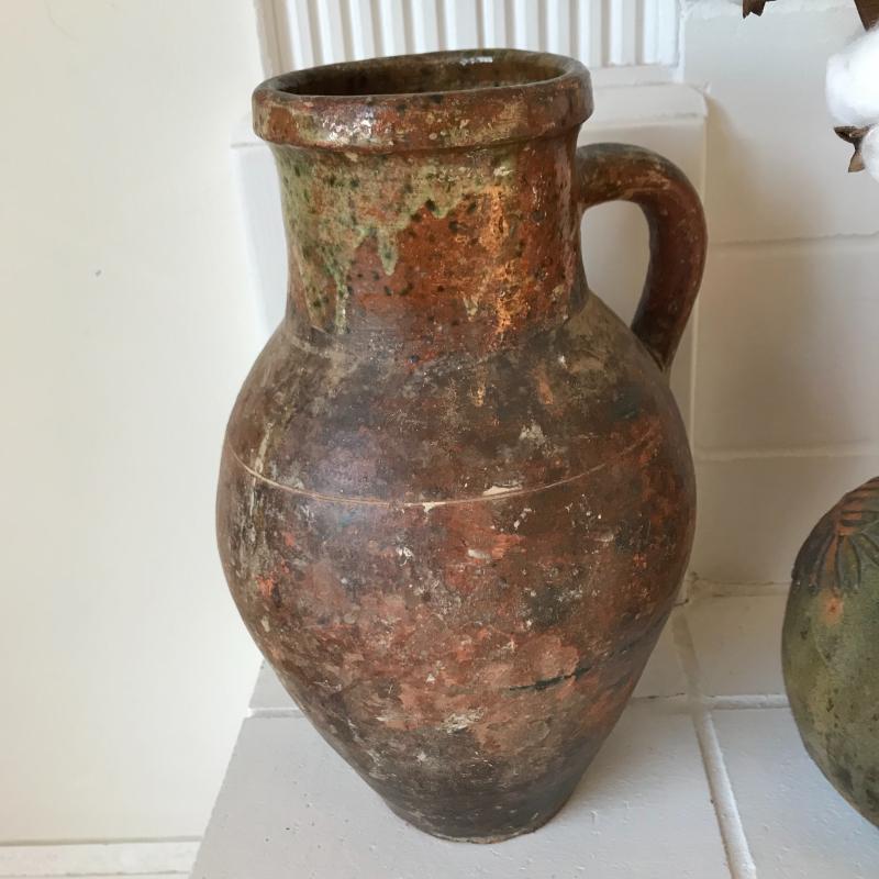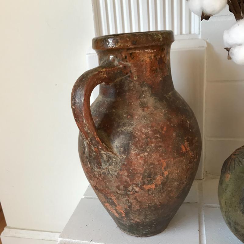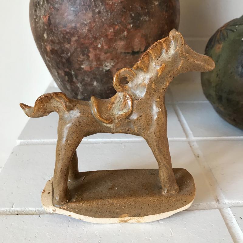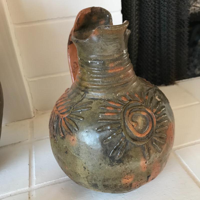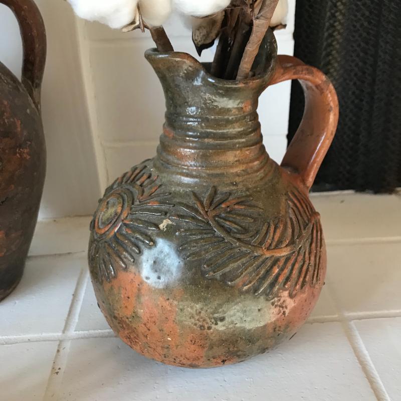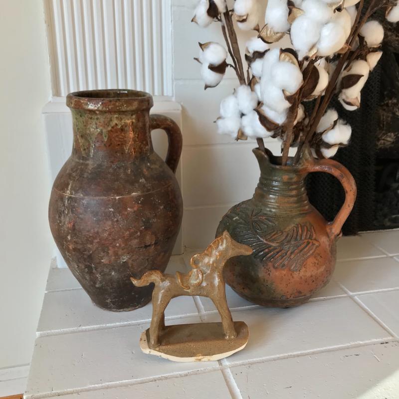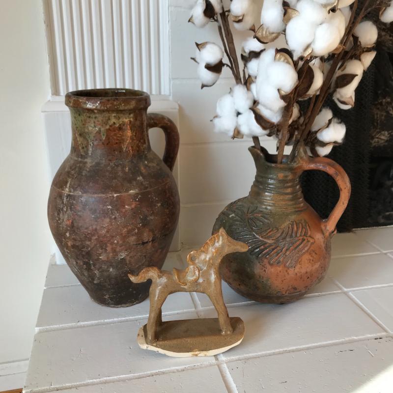 Two brown and green pitchers. (10.5” tall and 9”tall). This pottery has a beautiful rustic look. Lot also includes a small clay horse stamped "Hog Hill Pottery JP" on bottom. Shipping available or local pick up in Asheville, NC.