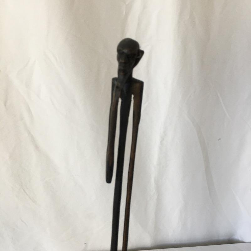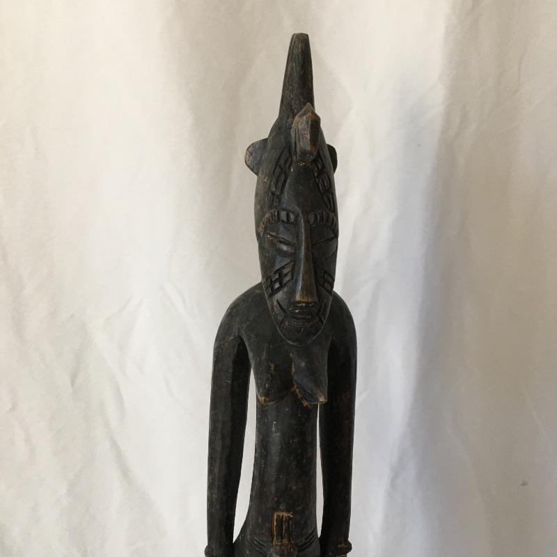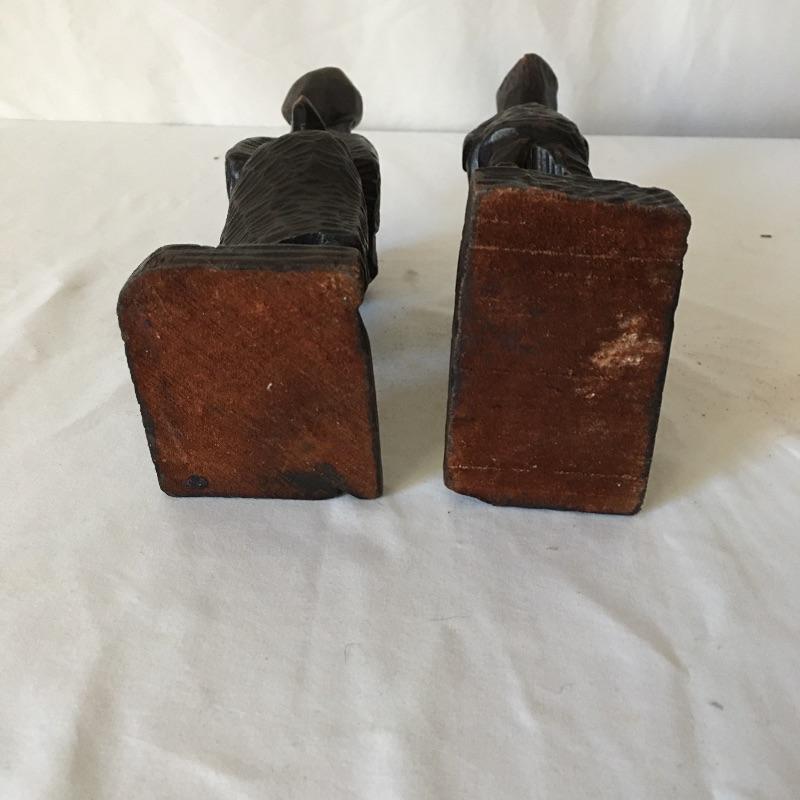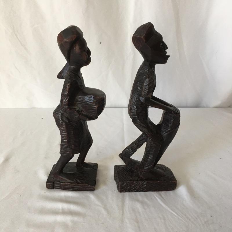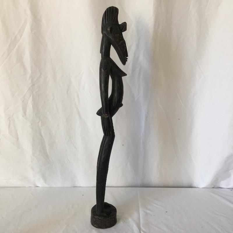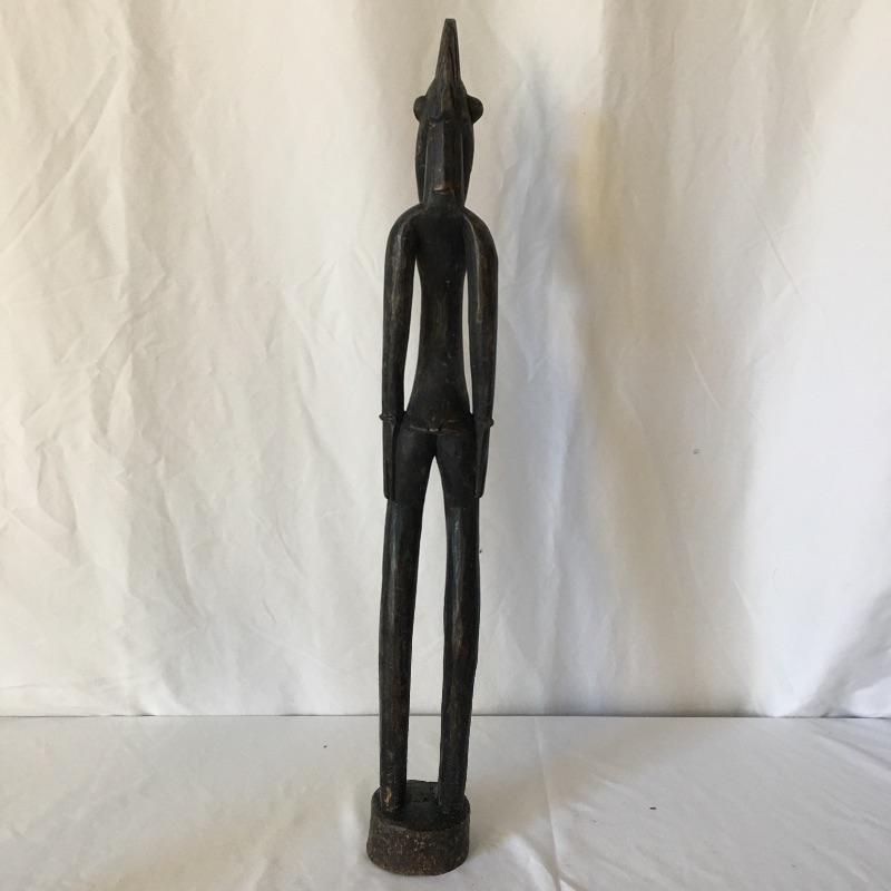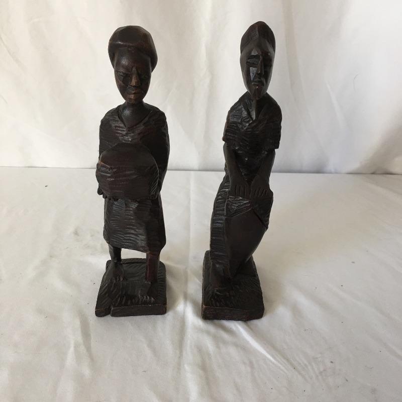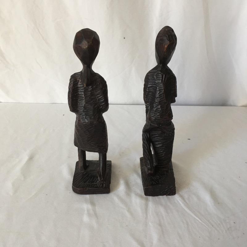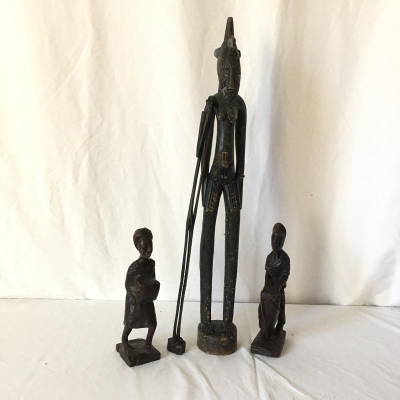 Quartet of wooden statues. Lot includes four wooden statues of a variety of sizes and shapes that appear to be carved. A great find for the collector. Tallest statue measures 3”D x 23.5”.