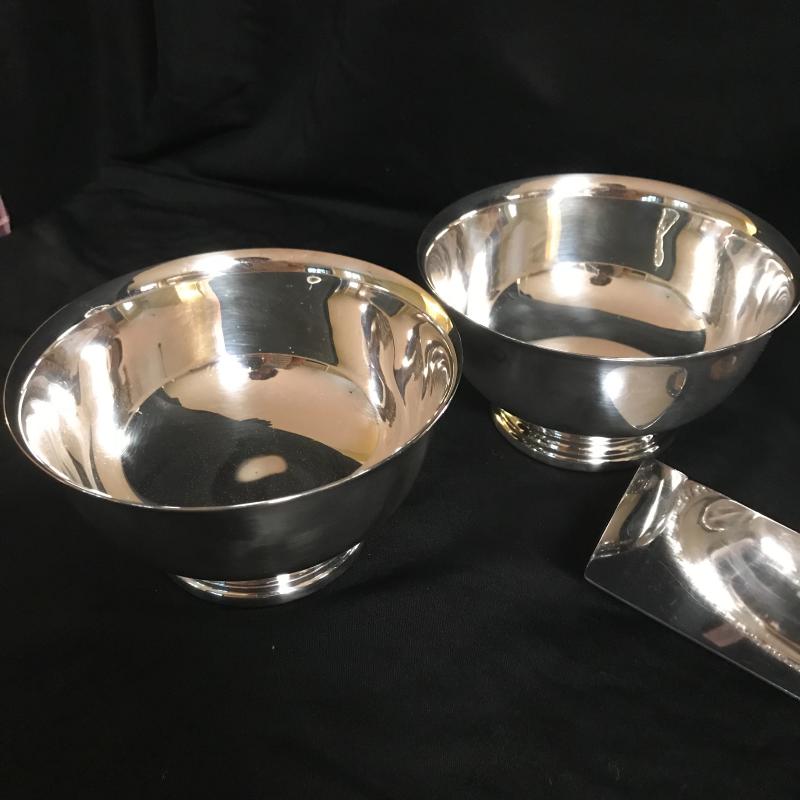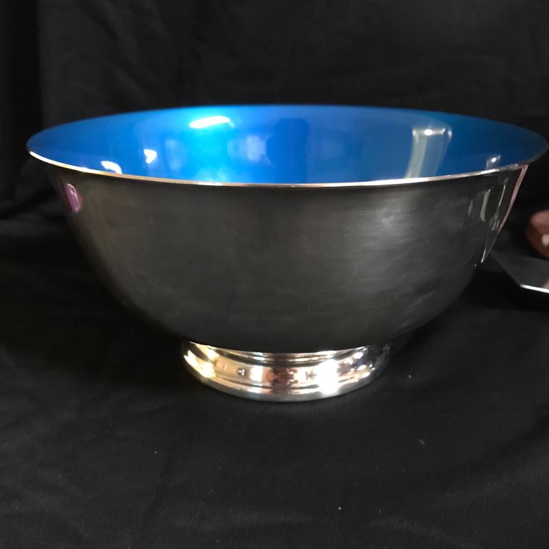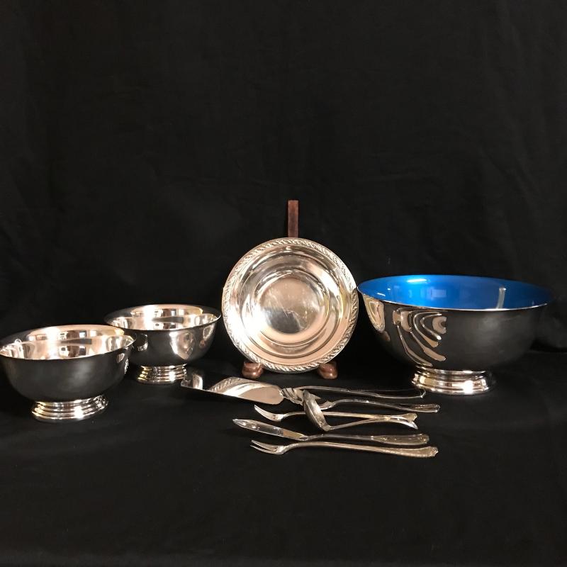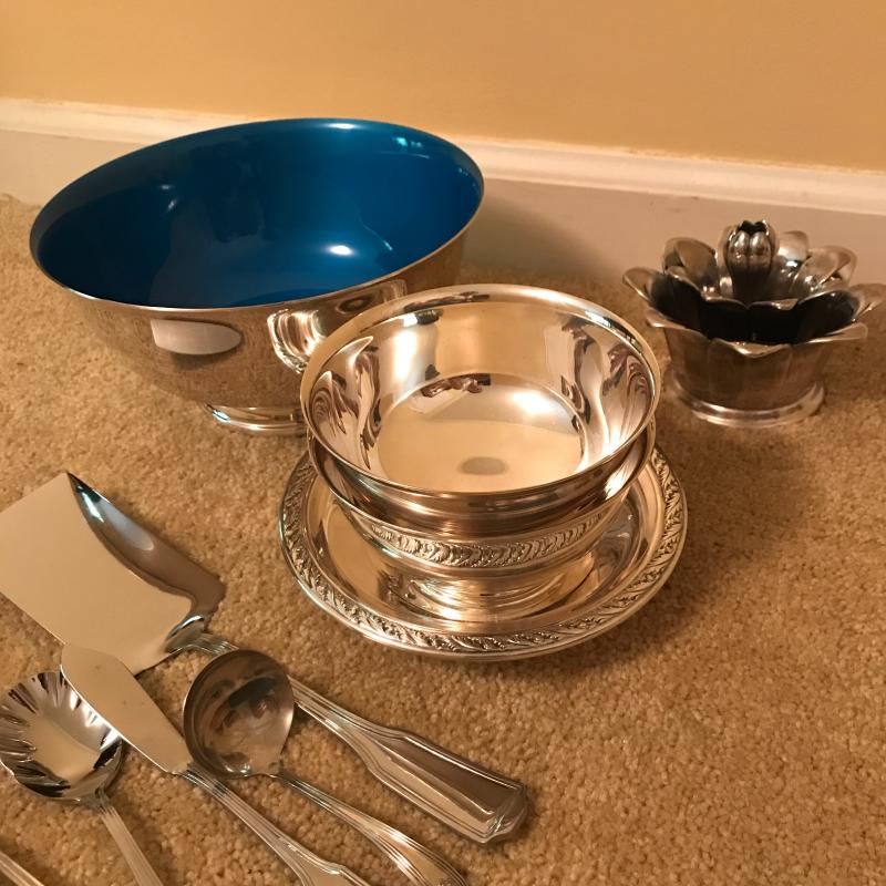 Striking collection of silver plated items. Gorgeous teal and silver bowl is the largest at approx. 8.25”d x 4.25”. See photos, Collection is limited to Reed &Barton, Sheffield, Wallace and Gorham. Shipping available or local pickup in Arden, NC.